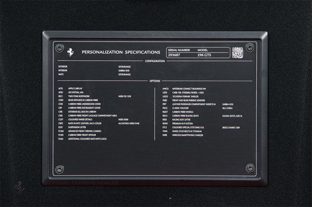 This one-owner 296 GTS, has covered just 342 miles, and has been through a comprehensive 101 Point Ferrari Approved inspection. It has Ferrari warranty coverage until 6/24/2027, and no-cost annual maintenance until 6/24/2030. It is complete with all keys, books/manuals, car cover and battery charger.