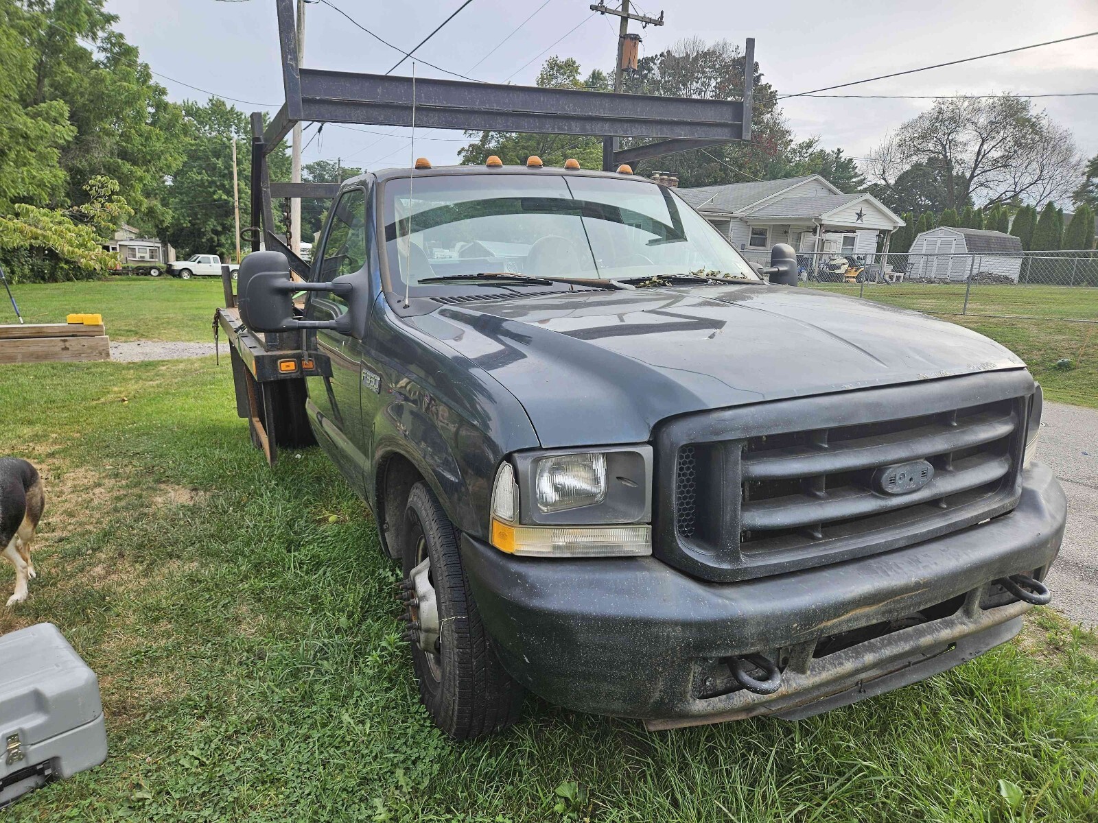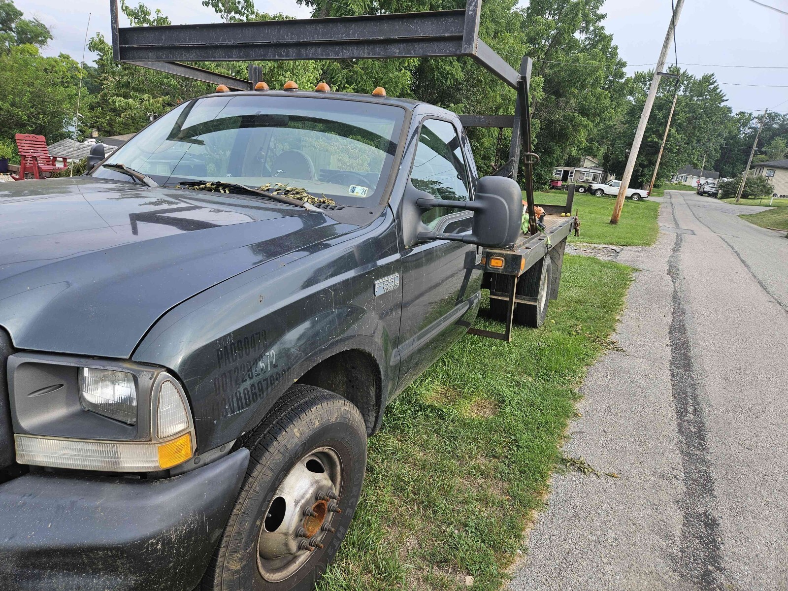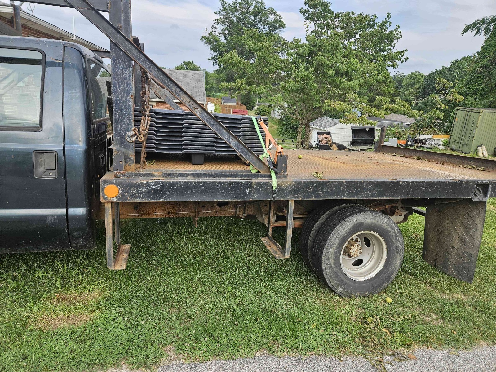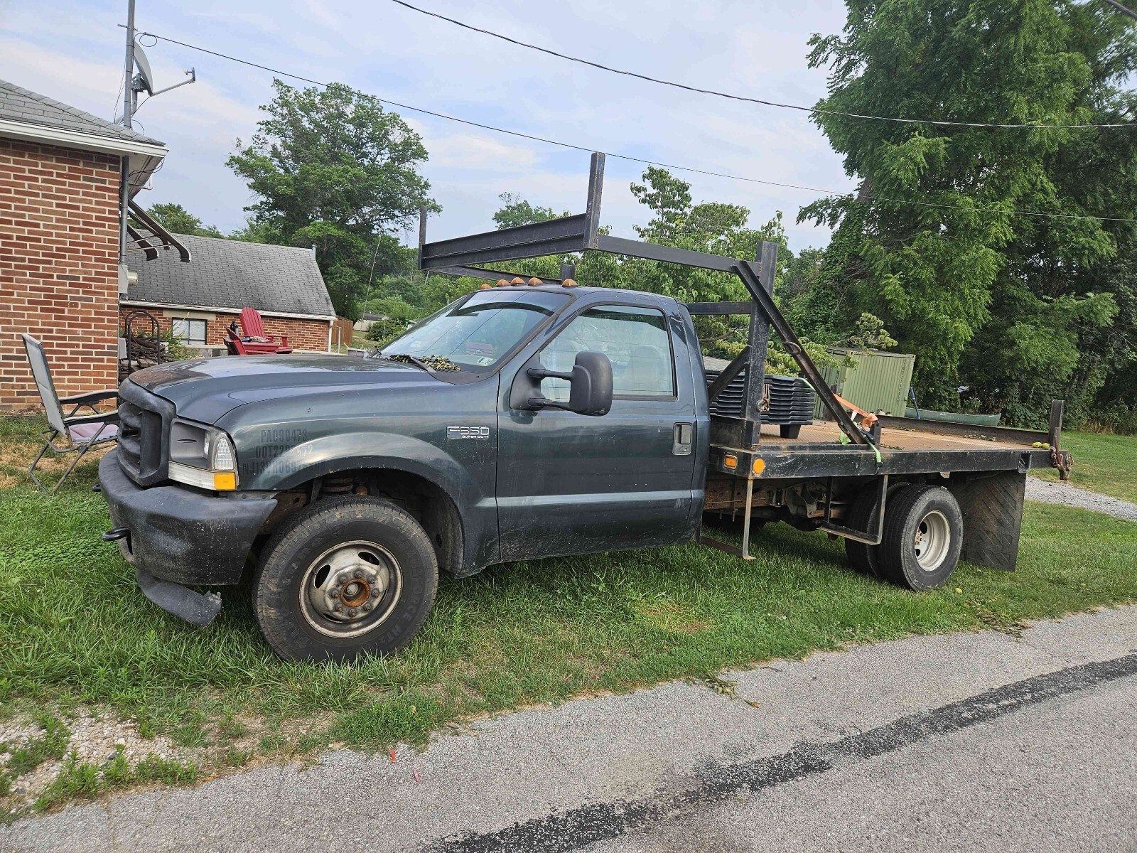 2004 Ford F-350 Super Duty dually with a rebar flat bed. 273,518 miles. 5.4L with automatic transmission. It basically has a new drive train. The bed is 8 foot wide by 12 feet long set up for transporting rebar. There is an overhang above the cab. The truck was a work truck and is ready for its next mission in life. The front of the hood has surface rust bubbles. There are small dents and scratches in the paint. The bumper has dents. The marker light at the driver's side headlight is loose. One of the cab marker light lenses is loose. The truck starts right up. The windshield has a crack next to the inspection sticker. Clean title in hand.