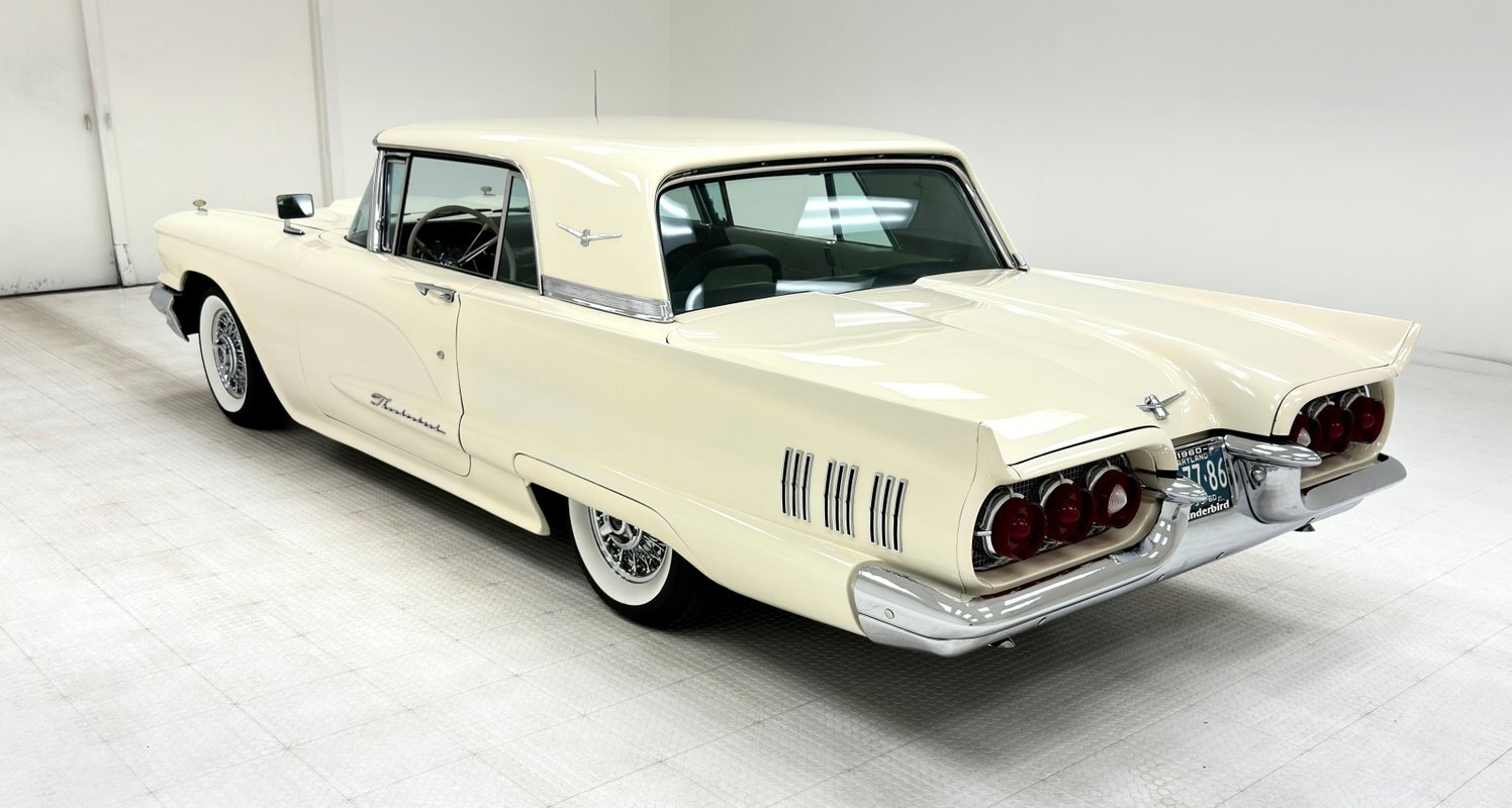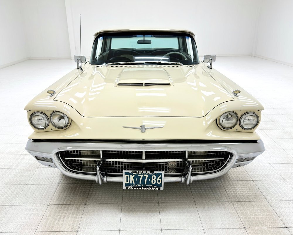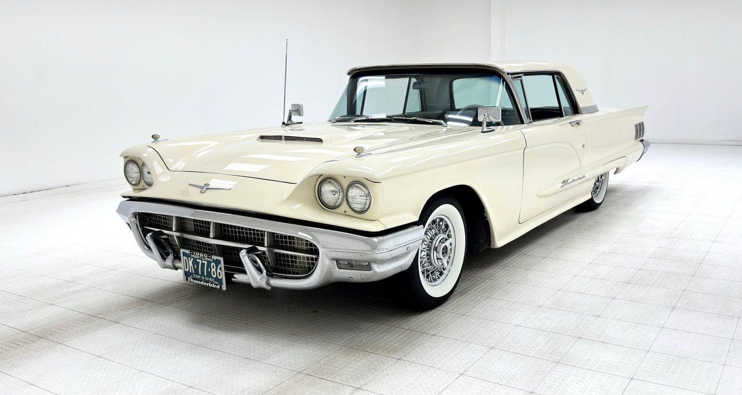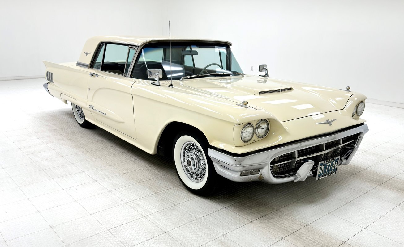 For consignment, a 1960 Ford Thunderbird hardtop with a title verified 23,608 actual miles, a garage kept, collector grade example of Ford's attempt to address consumer demand for more seating in a sports coupe.