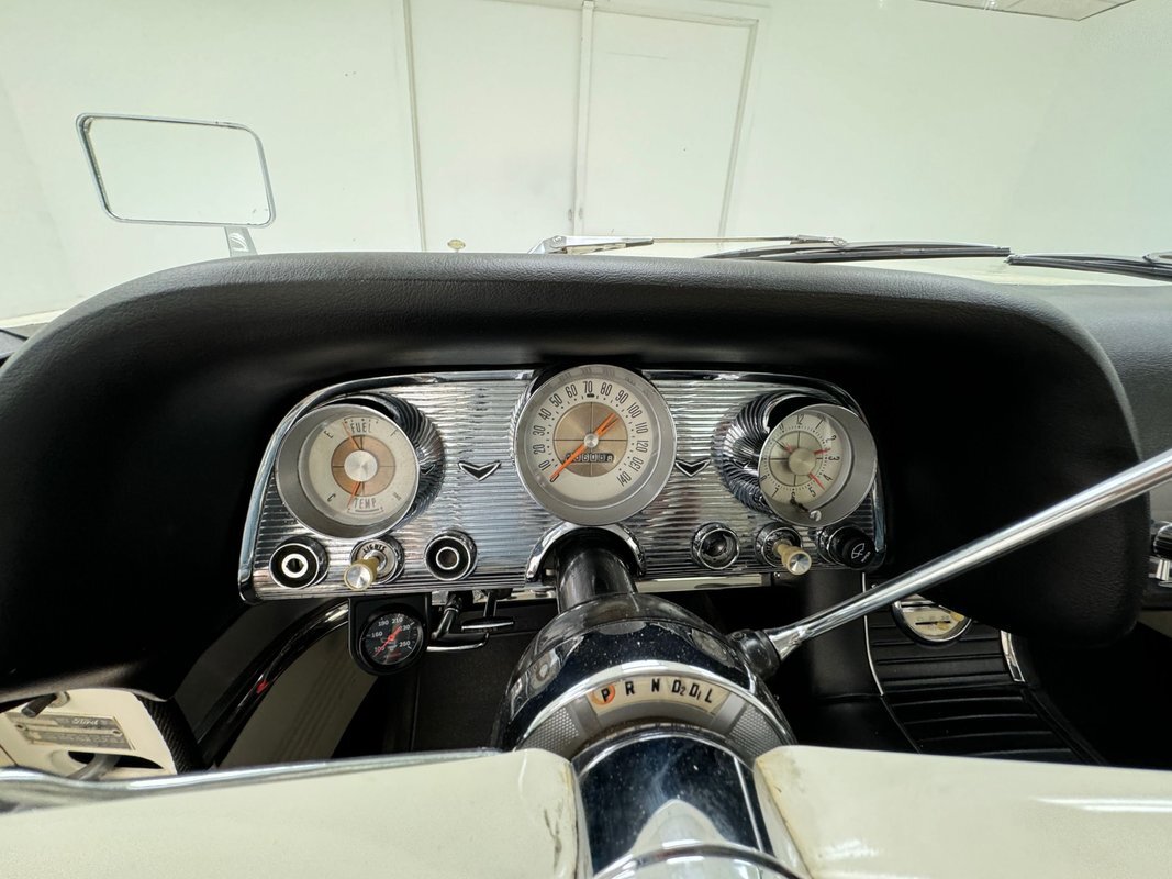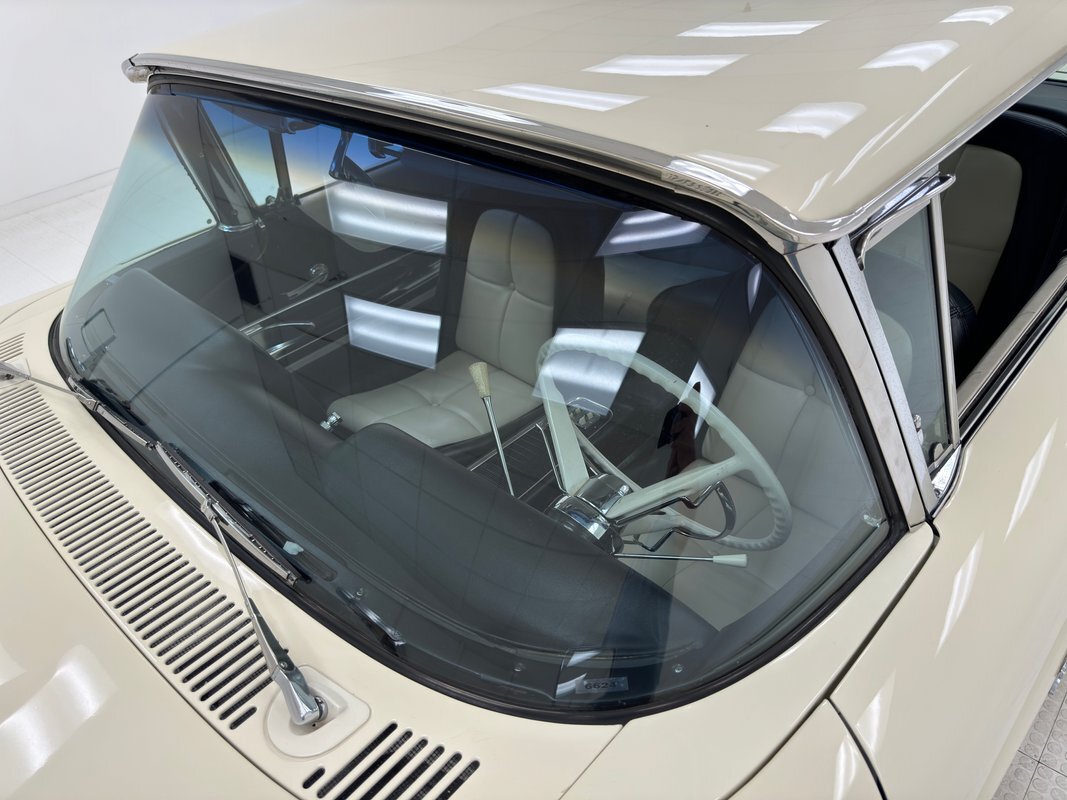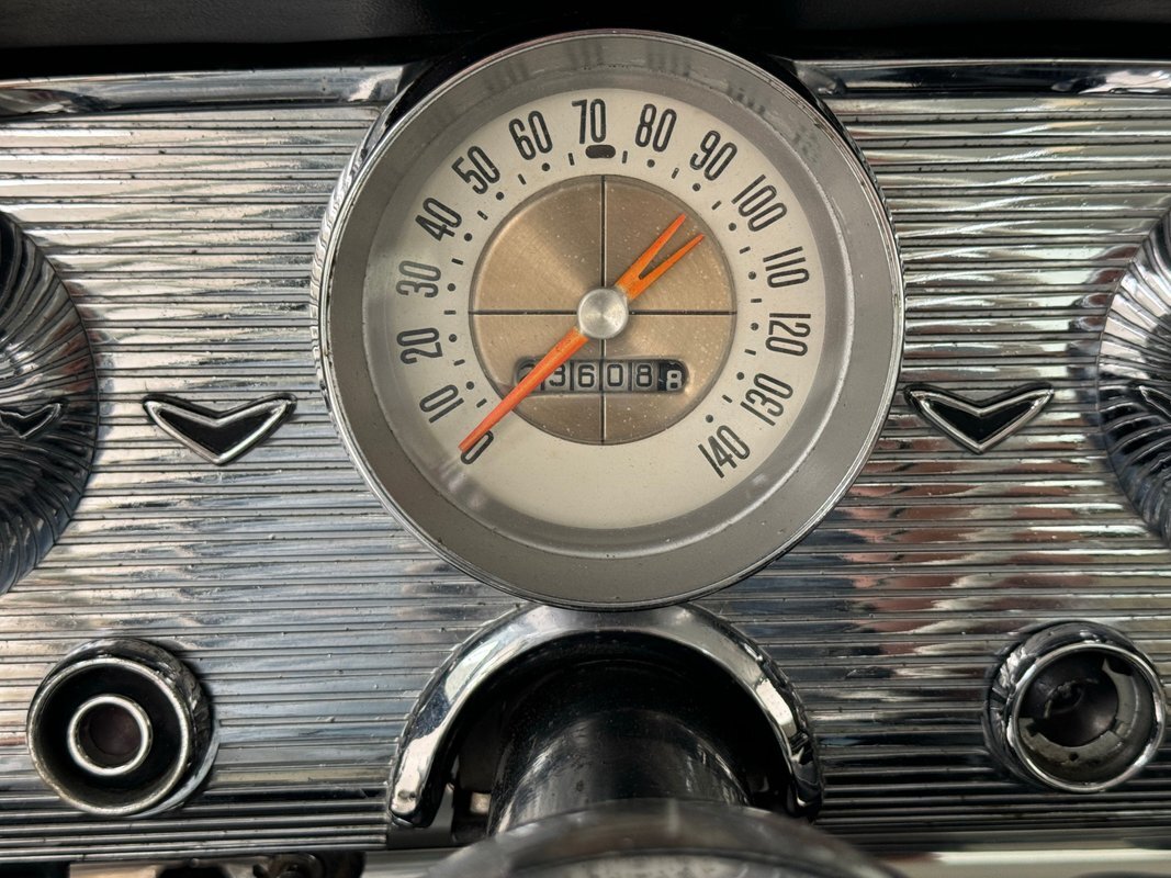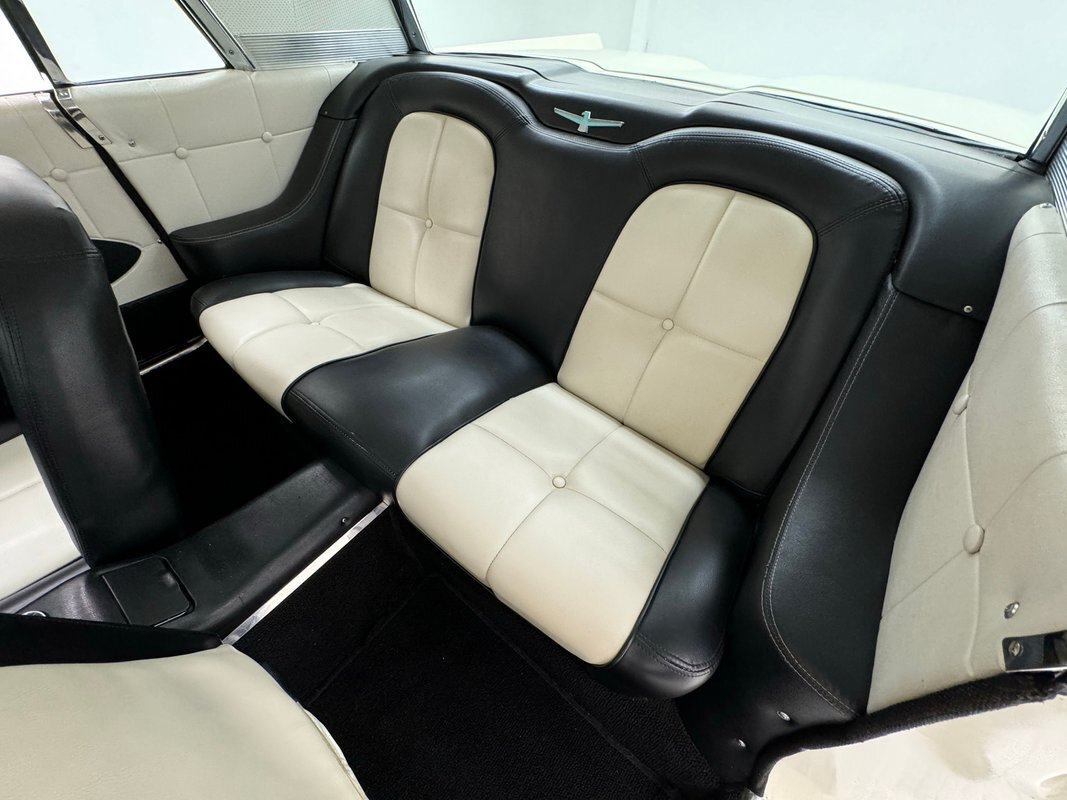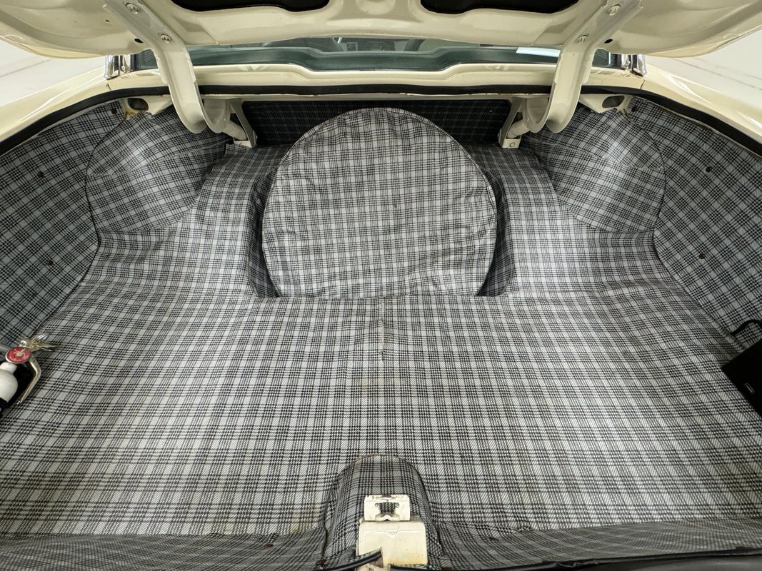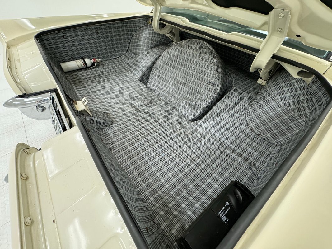 The arrow on the outside of the door is mirrored on the door panel where a black vinyl template surrounds a concave chrome arrow which in turn houses the door pull and armrest and the window crank handle. The other major portion of the door panel is a button back display in white vinyl. The white inserts of the seats copy that button back design in larger scale and are surrounded by black vinyl on low backed bucket front seats. 2+2 styling in the rear seat includes the black borders merging in the middle and the button back found on the door is now on the side walls in back, all in fantastic condition. The seat lines follow that of the trunk in a very fine attention to detail. A white plastic steering wheel, ribbed for grip, includes a chrome horn ring and column shifter. The dash is backed by polished lined metal and has three white faced gauges in a black sculpted dash surround. This lined metal repeats in front of the passenger and serves as the glove box door. The center stack contains an AM/FM radio on a metal plate and the heat and vent controls are below in a circle panel with some patina. Black looped style carpet covers the floor protected by what appear to be fitted mats and the white, perforated headliner is in great shape. The entire trunk is covered in a period plaid mat. All in all, the interior is clean and complete.