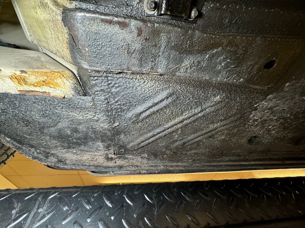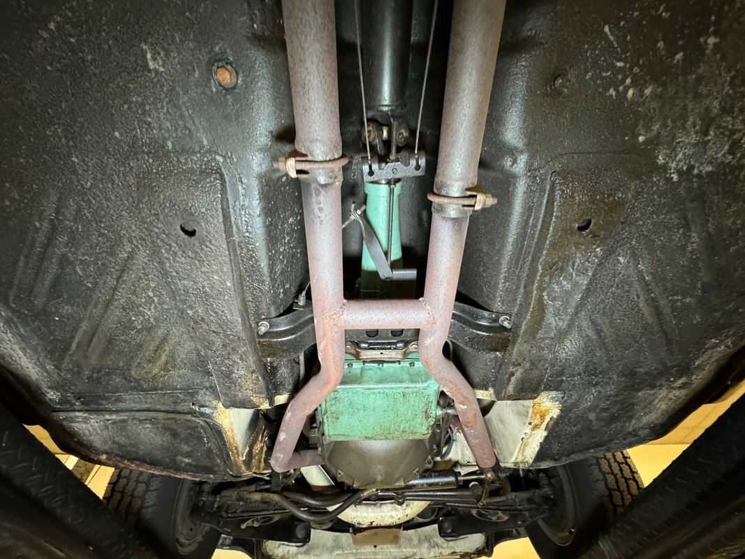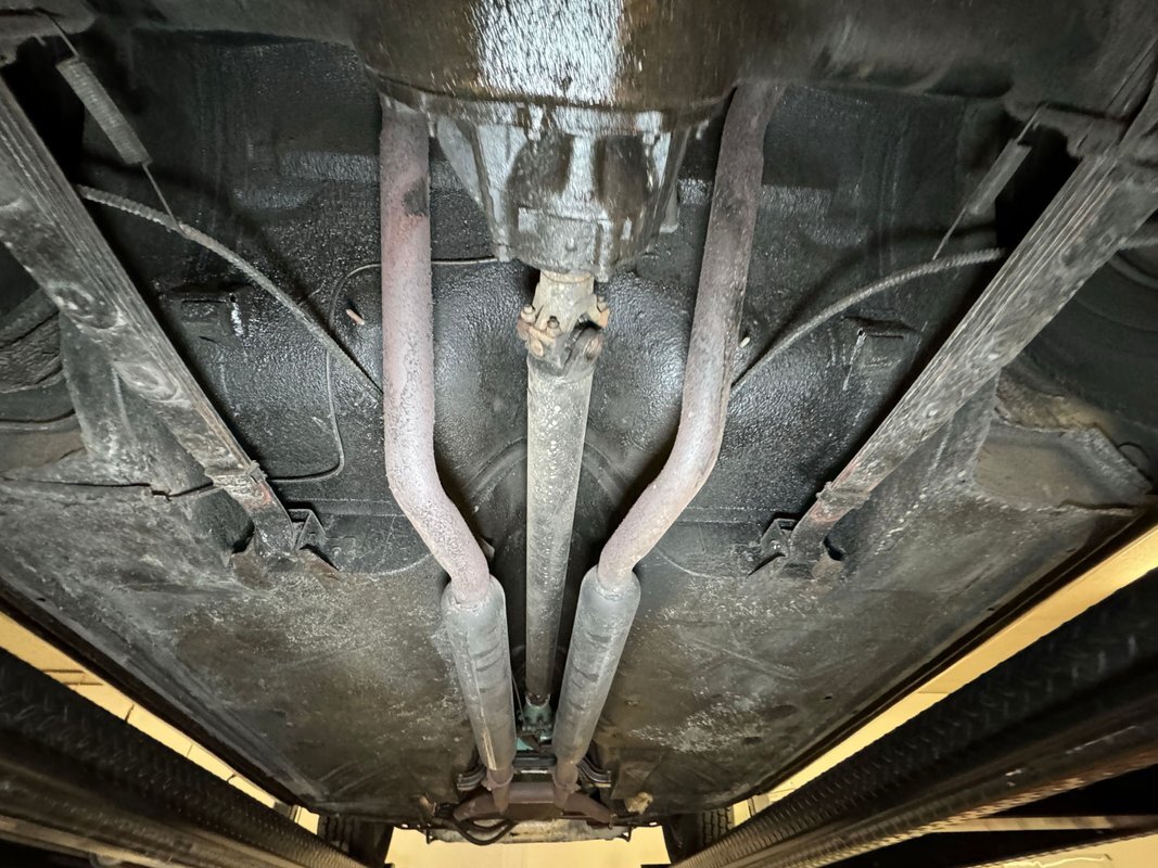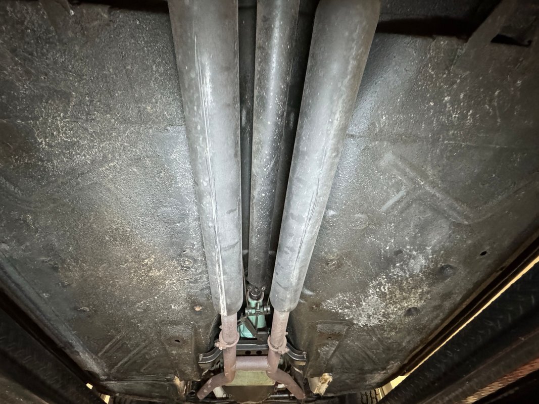 Generally clean underneath with minimal surface rust and no out of place fluids. Most of the underneath is uniformly textured black. The dual exhaust flows from the engine and meets glasspack style mufflers then immediately exits via a down turned chrome exhaust tips behind the rear bumper. Coil spring suspension is found in the front and leaf springs in the rear.