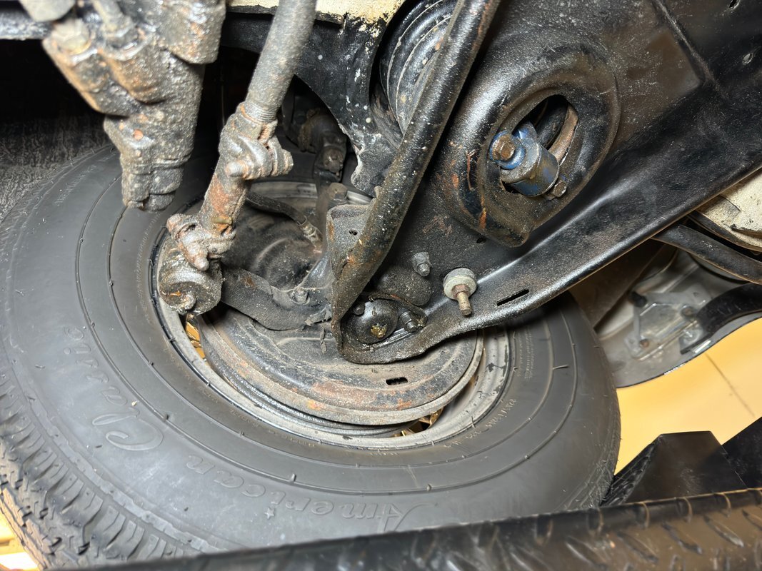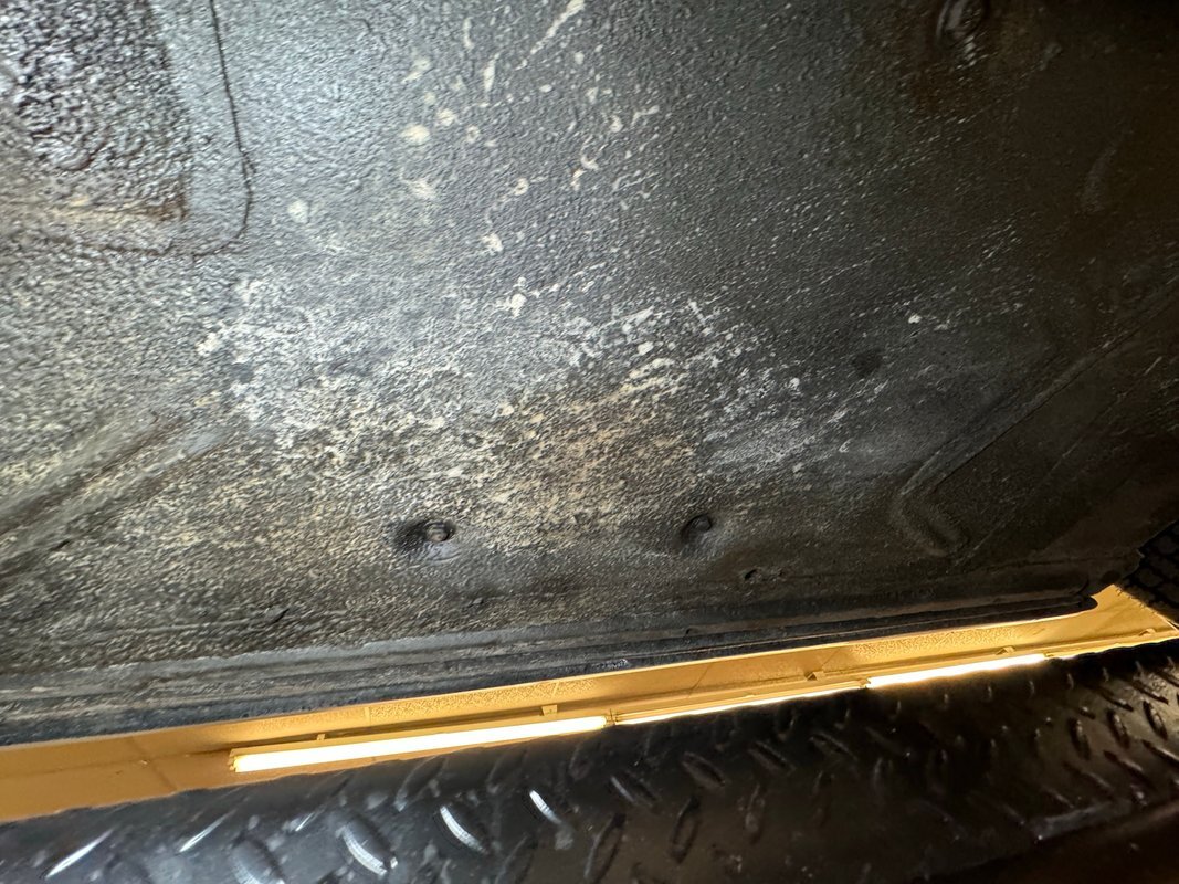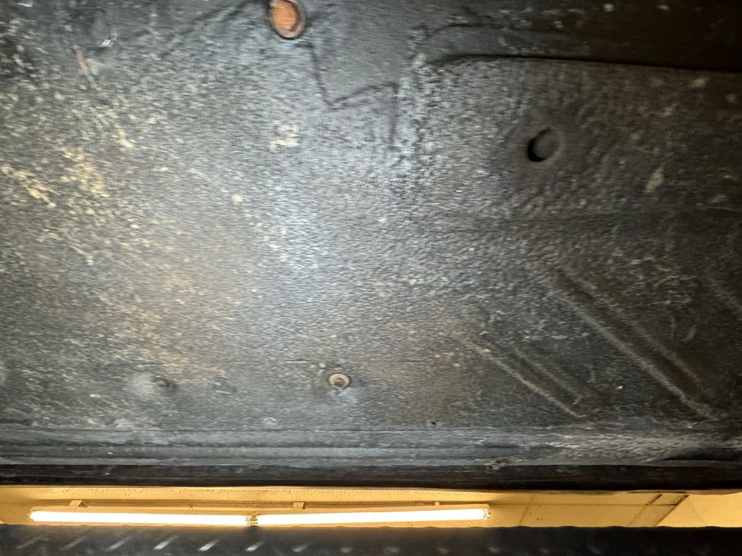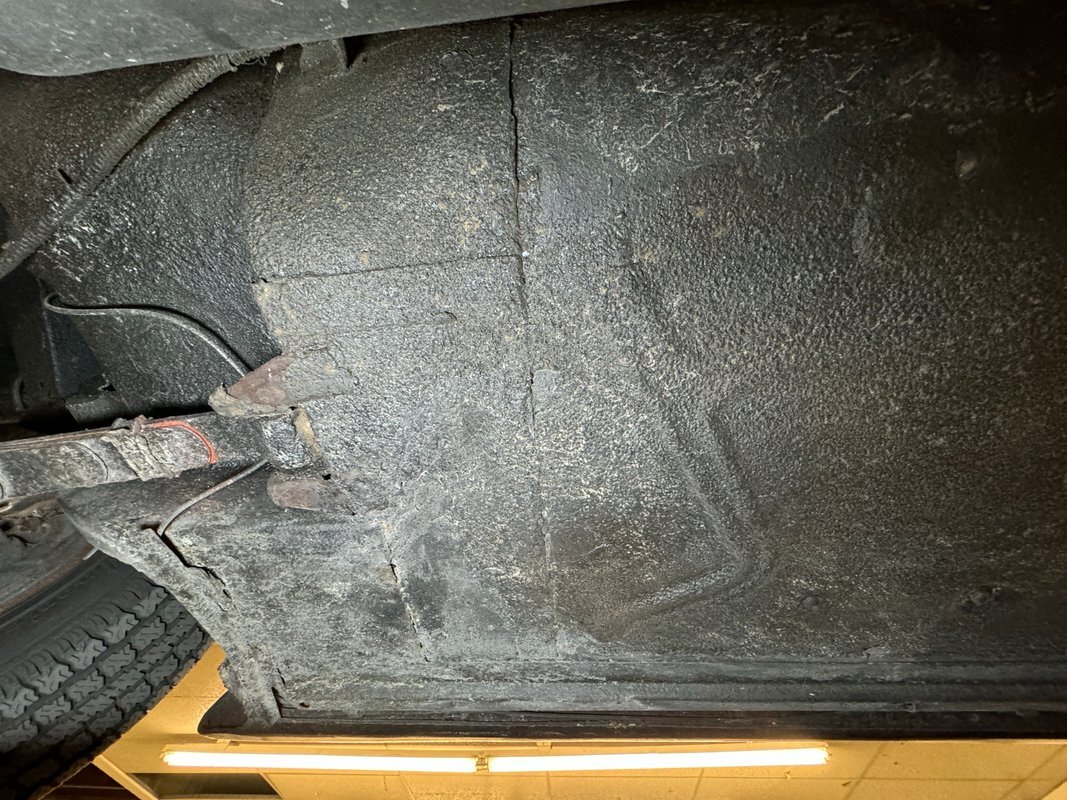 Generally clean underneath with minimal surface rust and no out of place fluids. Most of the underneath is uniformly textured black. The dual exhaust flows from the engine and meets glasspack style mufflers then immediately exits via a down turned chrome exhaust tips behind the rear bumper. Coil spring suspension is found in the front and leaf springs in the rear.