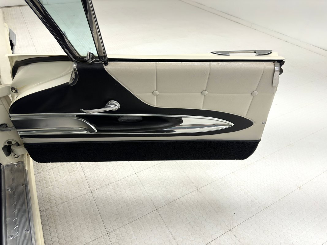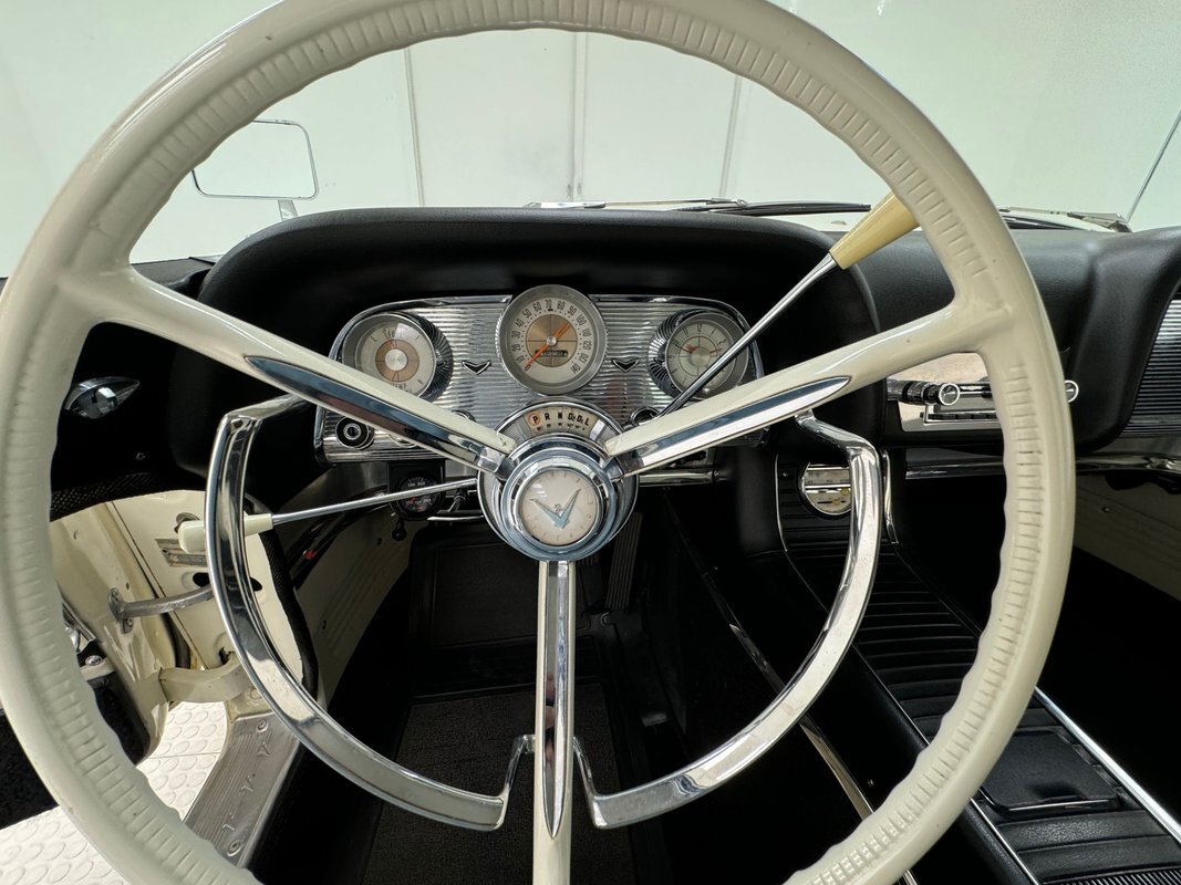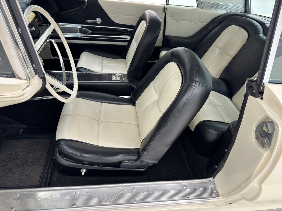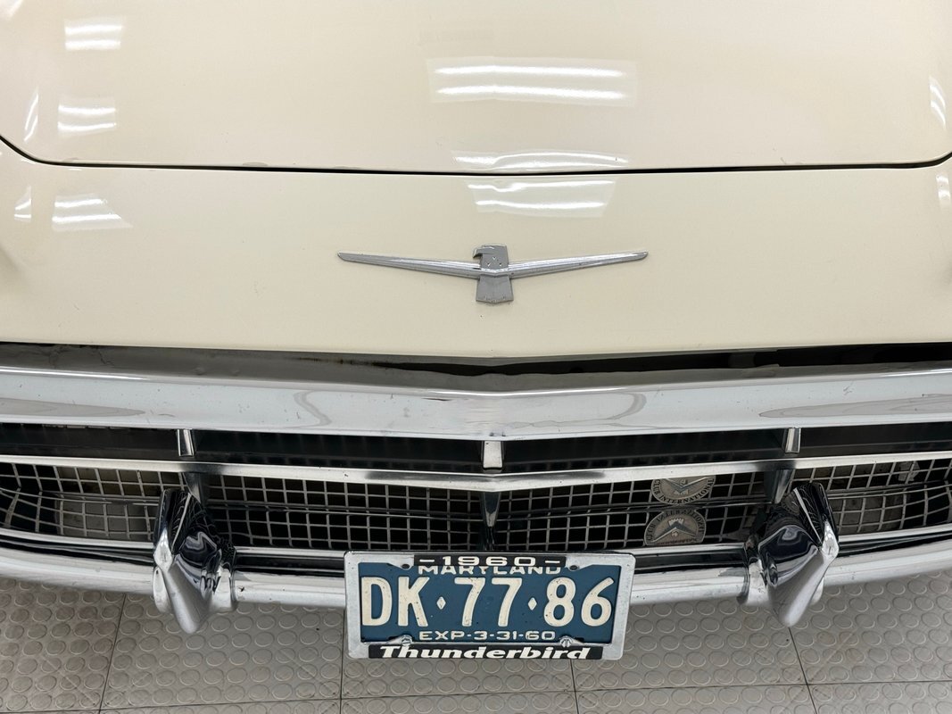 Soothing Corinthian White paint adorns this long car with immaculate coverage. The wide set dual headlights dictate the personality of the car as the face also includes a wide, gaping grille surrounded by a robust chrome bumper, bumper guards, and a centerpiece that bisects the mouth. The raised eyebrows of the headlights dip in the center where a hood scoop takes on the role of aggression, tipped by the Thunderbird emblem that is front and center. In lieu of a center hood ornament, two fender ornaments emerge at the front of each, in symmetrical harmony with the side mirrors closer to the windshield. Everything is shiny, the metal is gleaming. The straight shoulder line of the car is accented by the sculpted arrow body line low on the car which starts on the door, absorbs the fender skirts, and widens at the rear fender. The hardtop and its right angle fits like a canopy over the heavily curved windshield. Nine accent trim pieces are in the back for no other reason than design. Six tail lights at the end of a sculpted trunk and flanking fins are unlike any car on the road, then or now! Imperfections include some bubbling and a few random scratches. 14-inch TrueSpoke wire wheels wear tires with a mid 2023 manufacturing date.