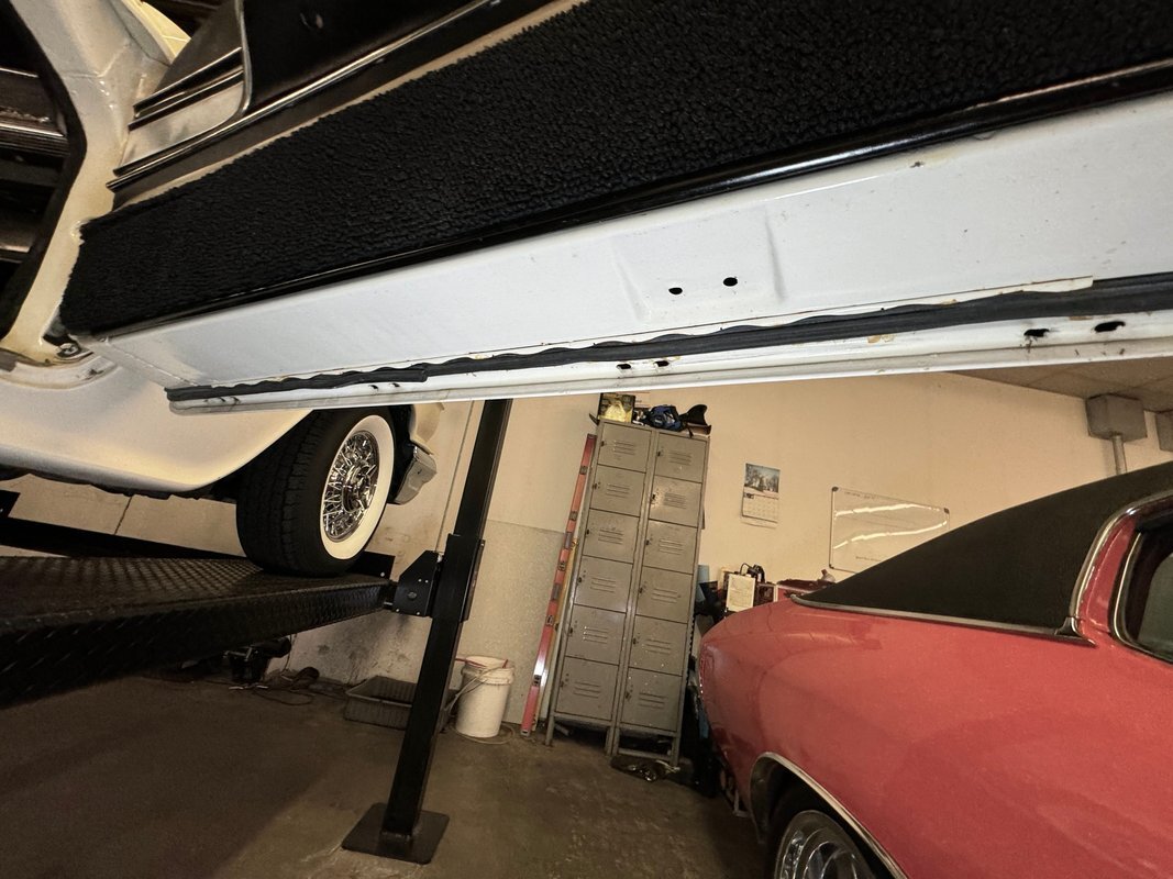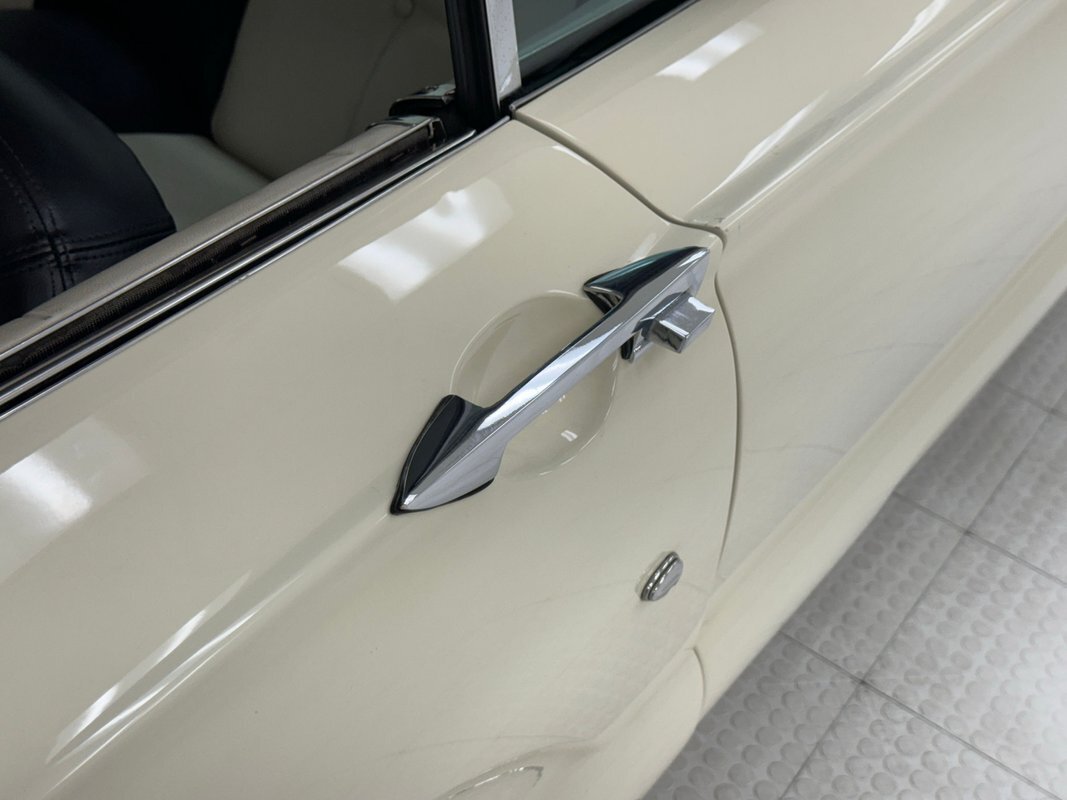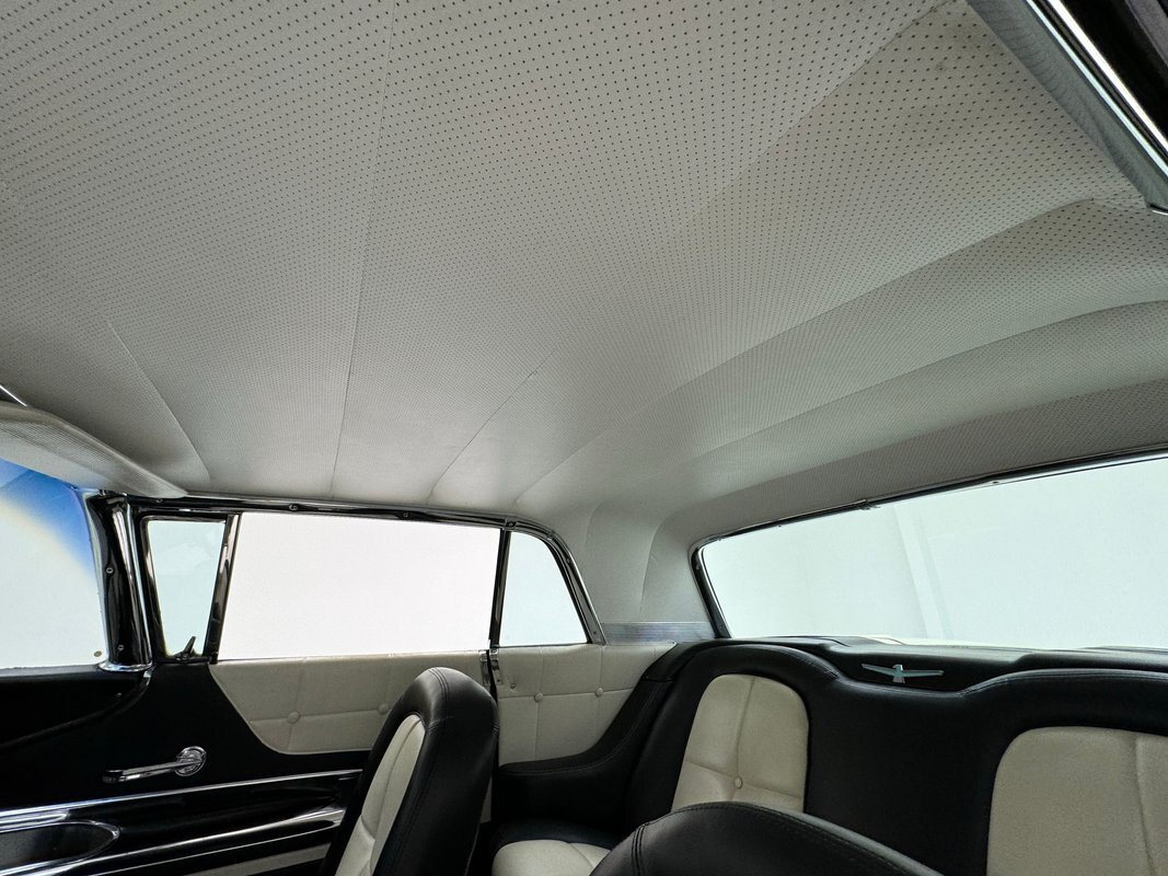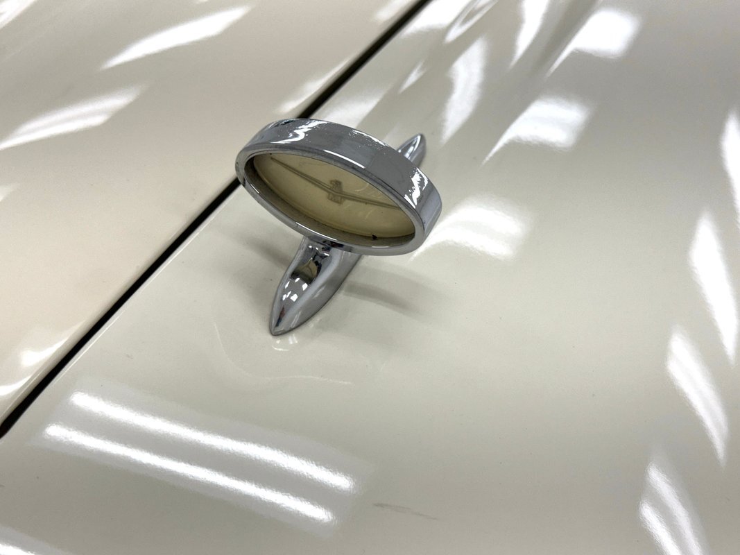 Soothing Corinthian White paint adorns this long car with immaculate coverage. The wide set dual headlights dictate the personality of the car as the face also includes a wide, gaping grille surrounded by a robust chrome bumper, bumper guards, and a centerpiece that bisects the mouth. The raised eyebrows of the headlights dip in the center where a hood scoop takes on the role of aggression, tipped by the Thunderbird emblem that is front and center. In lieu of a center hood ornament, two fender ornaments emerge at the front of each, in symmetrical harmony with the side mirrors closer to the windshield. Everything is shiny, the metal is gleaming. The straight shoulder line of the car is accented by the sculpted arrow body line low on the car which starts on the door, absorbs the fender skirts, and widens at the rear fender. The hardtop and its right angle fits like a canopy over the heavily curved windshield. Nine accent trim pieces are in the back for no other reason than design. Six tail lights at the end of a sculpted trunk and flanking fins are unlike any car on the road, then or now! Imperfections include some bubbling and a few random scratches. 14-inch TrueSpoke wire wheels wear tires with a mid 2023 manufacturing date.