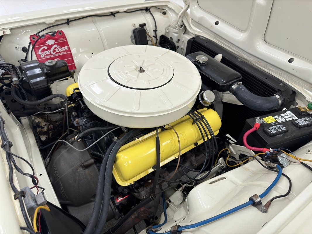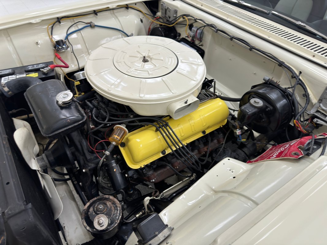 A clean engine bay reveals a 352ci V8 supplied fuel by a 4-barrel carburetor and wearing yellow valve covers and a body colored air cleaner housing. Power is transferred to the rear wheels via a 3-speed Cruise-O-Matic transmission and the Ford 9" rear has 3.10 gears. Power drum brakes are provided on all four wheels.