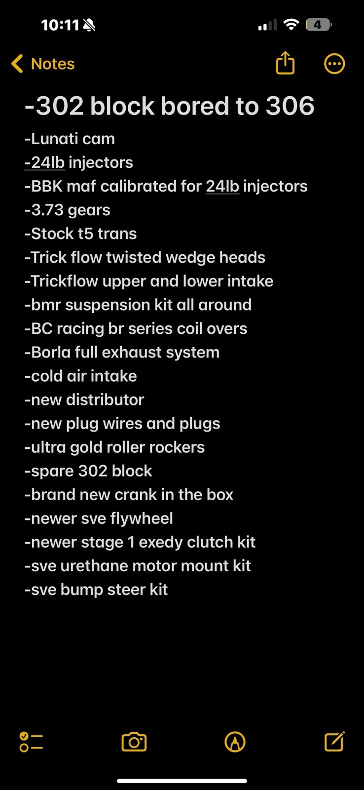 1995 Mustang GT. 5 speed. Southern car came from Carolina hence the reason for paint fade. No rust, underneath, shock towers, brake lines etc are super clean. Body has 185,000, new build has 250miles. I have all the receipts and photos of everything from the build $7800 in receipts just from the year I have owned it. Purchased from someone who broke the crank in the motor and put a different block in and built from there. All the work done to the car is in the photo as a screenshot from my notes. If you bid or are interested please contact me, I’m willing to work on price and work on delivery/meeting within reasonVehicle Details