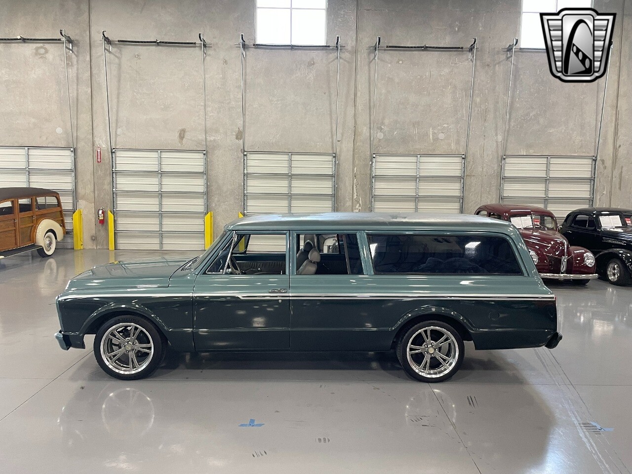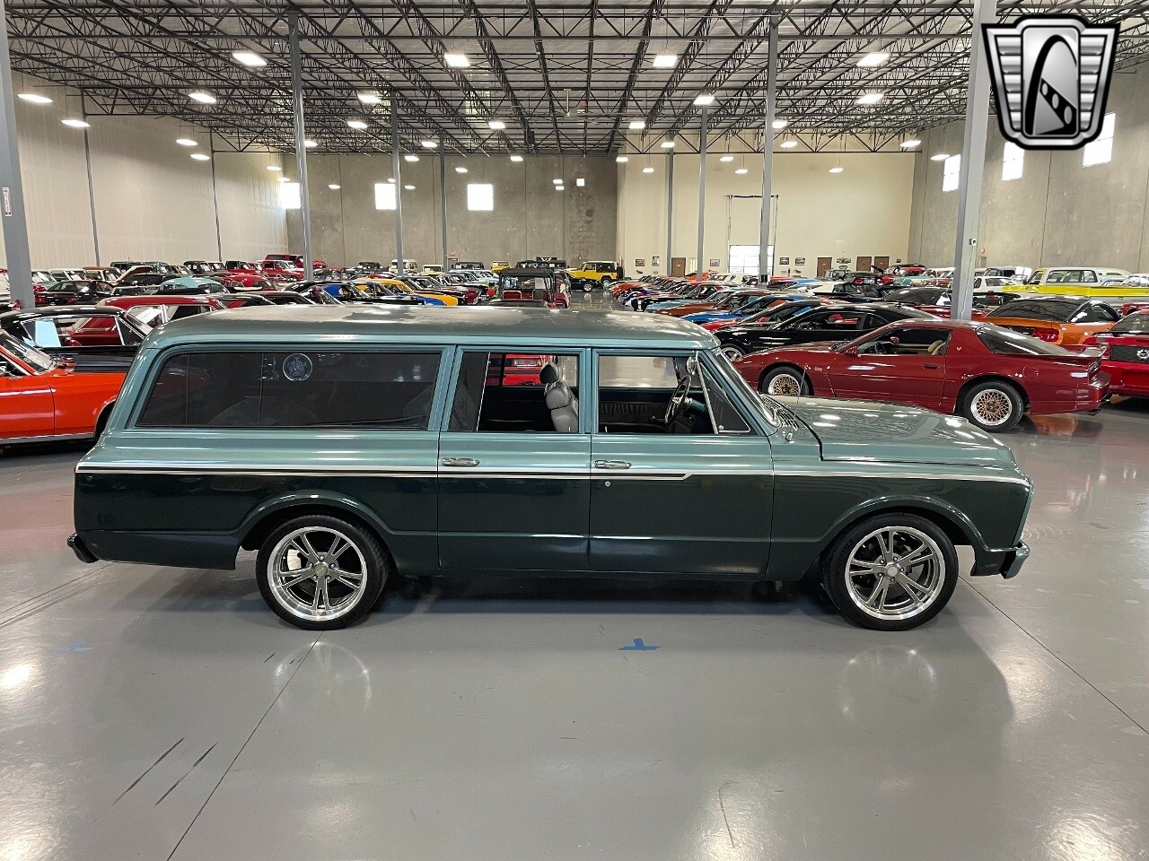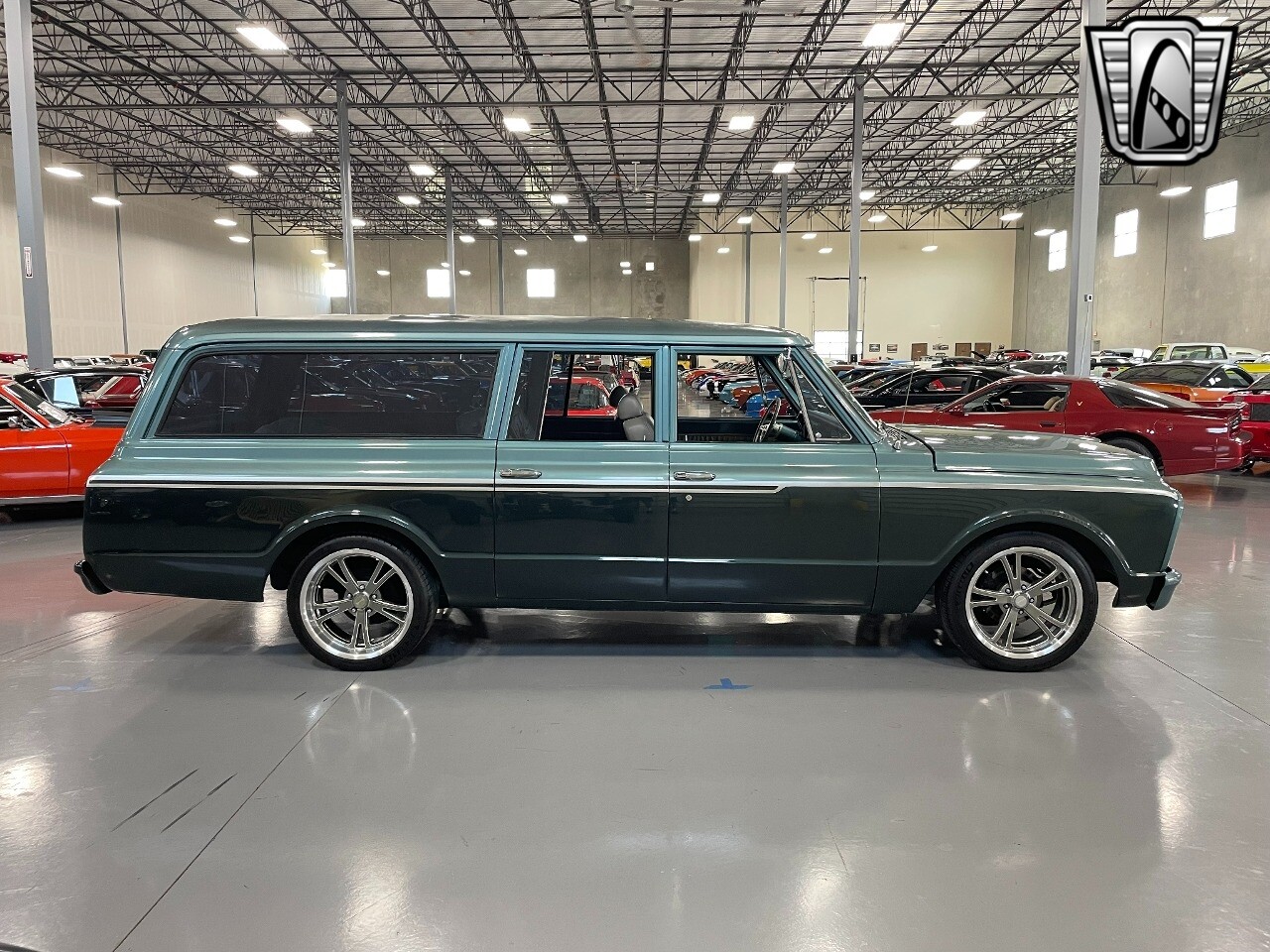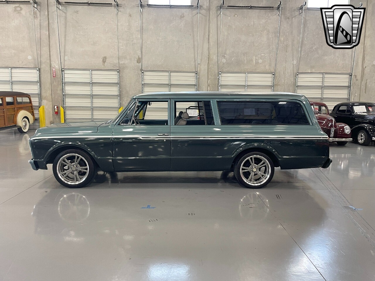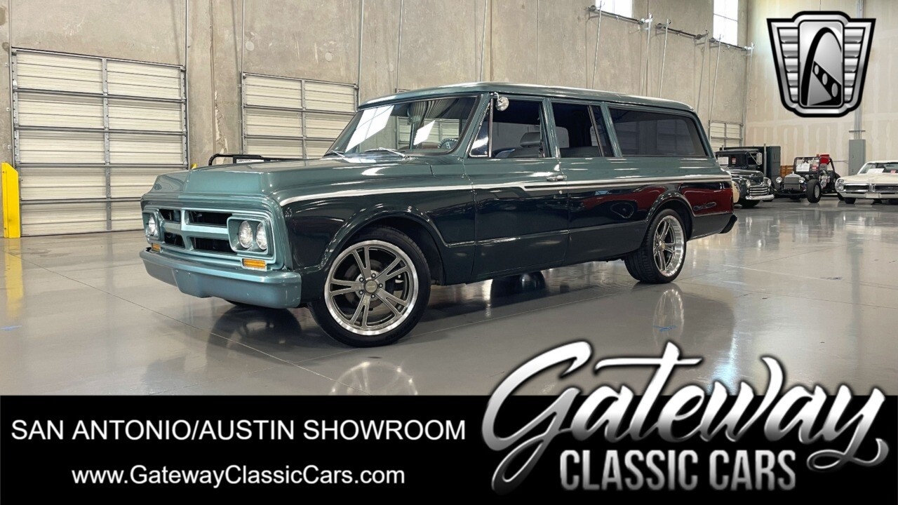 Gateway Classic Cars of San Antonio/Austin is proud to present this 1969 GMC Suburban. Under the hood is a 383 cubic inch stroker V8 that gives you big block displacement in a small block weight. It inhales deeper with a four-barrel carburetor, and Doug's headers exhale with added power. t's ready for the long haul with cruise control and a 700R4 four-speed automatic transmission with overdrive. There's even an adjustable air ride rear suspension so that this GMC can even handle the larger loads in the back. Add in power steering, power brakes, front discs, and Bilstein shocks, and you have a solid all-around Suburban. Step inside, and you'll be greeted by a host of modern conveniences seamlessly integrated into this classic vehicle. Plush carpeting, cold blowing air conditioning custom door panels, cup holders, power locks, an alarm, a custom headliner w/console, and fully upgraded AM/FM/CD stereo with Bluetooth and subwoofer speakers are all part of a very modern experience. You still have two wide rows of bench seats, but now they are done in supple leather. It's a great driver's set up with a custom sport steering wheel on a tilt column and full gauges w/tach. More of the modern appeal comes from removing the trim and badging for a sleeker sense of style. But the way the custom stripe package adds pinstriping and a cool trim-like line down the sides are reminders that this upgraded Suburban still knows how to be a true classic. In fact, speaking of vintage details, you'll love the hot rod style side mirrors and Ridler wheels. So no matter if you're looking to haul friends, family, or your toys, this classic can do it, and it can handle it all at once!.
