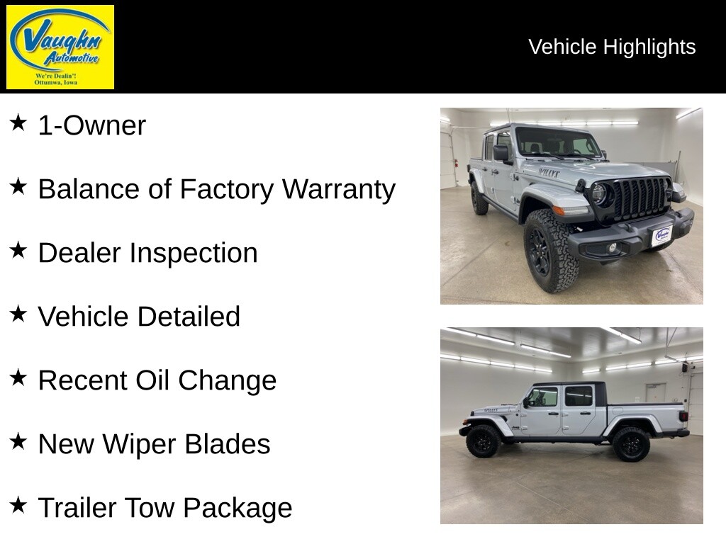 1-Owner, Balance of Factory Warranty, Dealer Inspection, Vehicle Detailed, Recent Oil Change, New Wiper Blades, 8-Speed Automatic, 4WD, Black Cloth, 2-Door Passive Entry, Front Door Locks, 240 Amp Alternator, 8 Speakers, AM/FM radio, Apple CarPlay/Android Auto, Black 3-Piece Hard Top, Class IV Receiver Hitch, Cold Weather Group, Corning Gorilla Glass, Daytime Running Lamps LED Accents, Electronic Stability Control, Emergency communication system: SiriusXM Guardian, Front fog lights, Front LED Fog Lamps, GPS Antenna Input, Heated Front Seats, Heated Steering Wheel, Heavy-Duty Engine Cooling, Integrated roll-over protection, Integrated Voice Command w/Bluetooth, LED Headlamp & Fog Lamp Group, LED Premium Reflector Headlamps, MOPAR Spray In Bedliner, ParkView Rear Back-Up Camera, Power Tailgate Lock, Radio: Uconnect 4 w/7 Display, Rear Sliding Window, Rear Window Defroster, SiriusXM Radio Service, SiriusXM Satellite Radio, Speed control, Steering wheel mounted audio controls, Traction control, Trailer Hitch Zoom, Trailer Tow Package, USB Host Flip. 3.6L V6 24V VVT Silver Zynith Clearcoat 2022 Jeep Gladiator Sport Odometer is 10801 miles below market average!