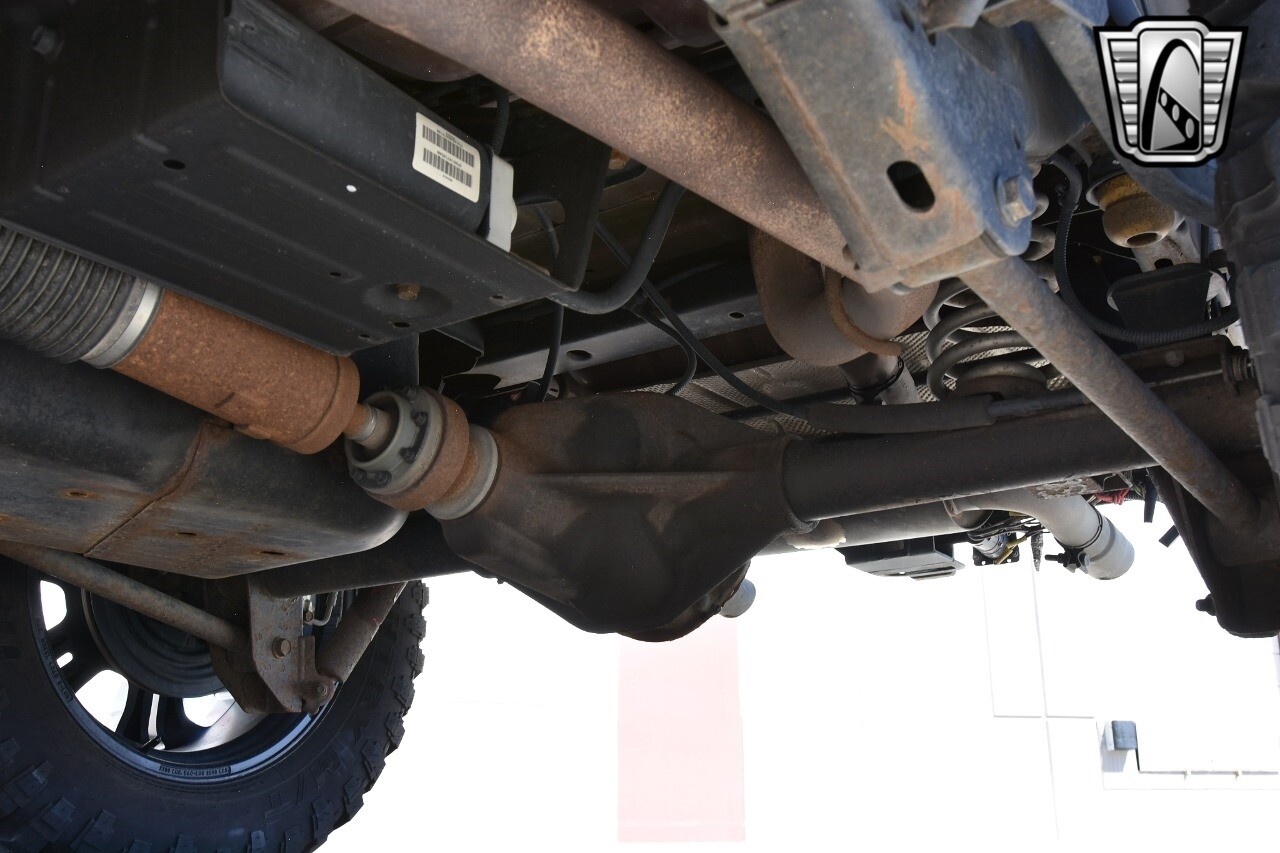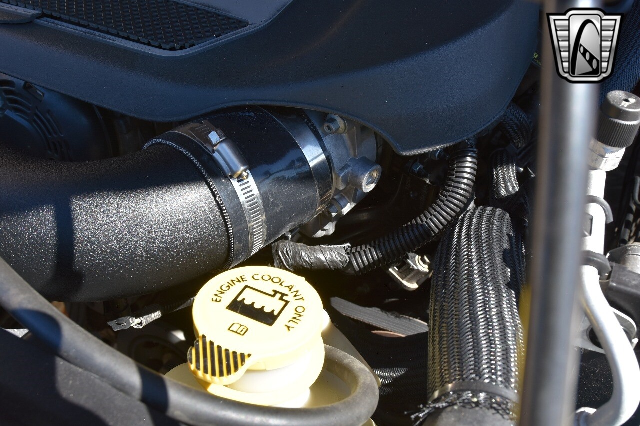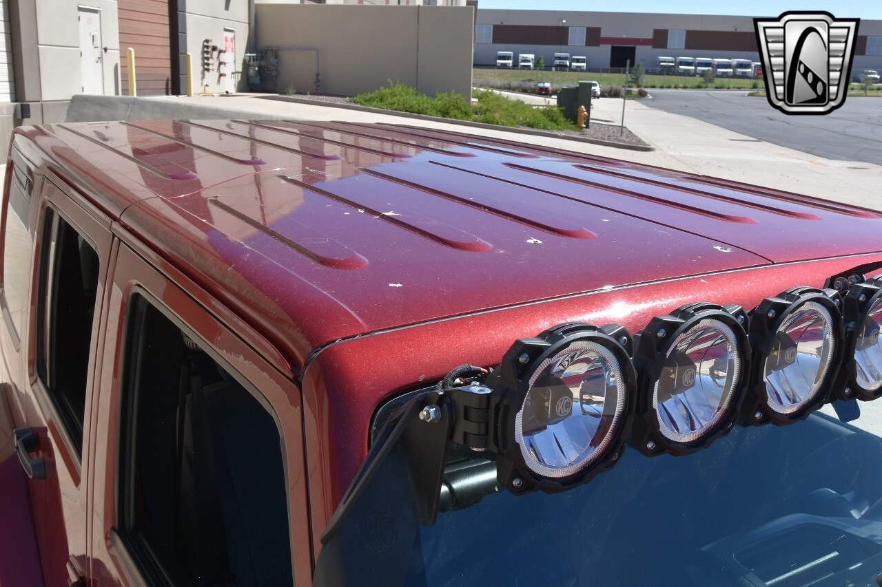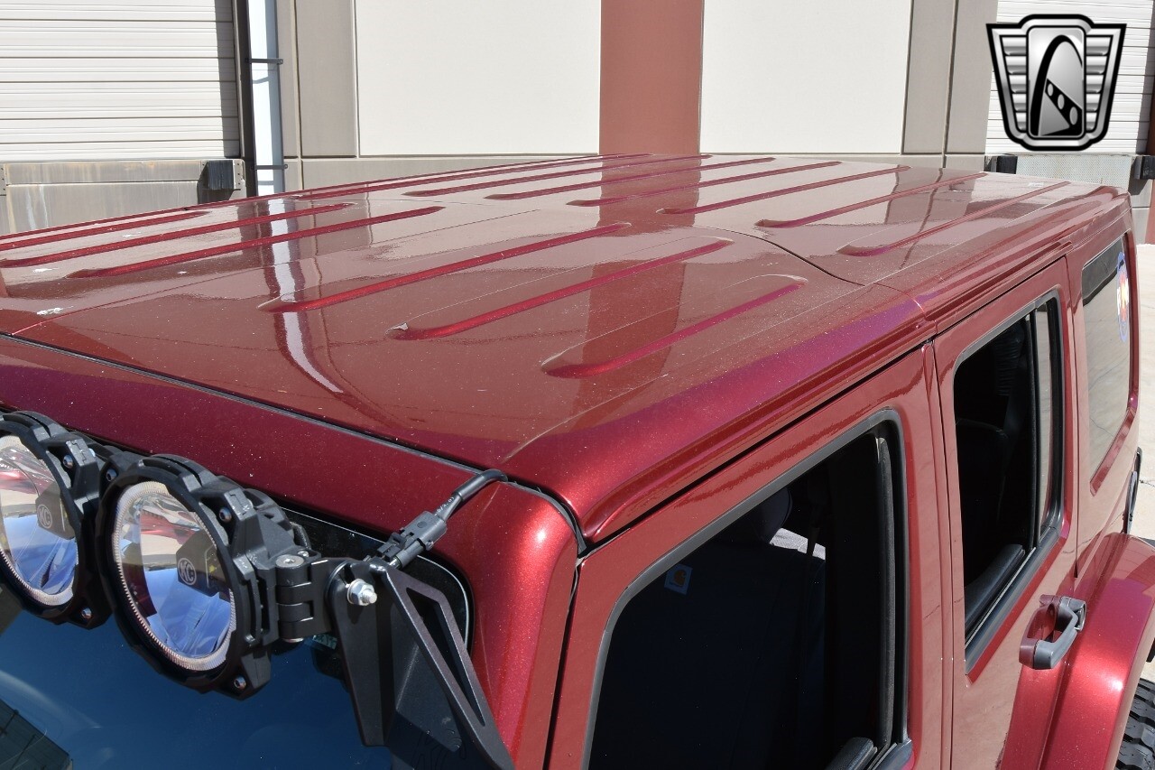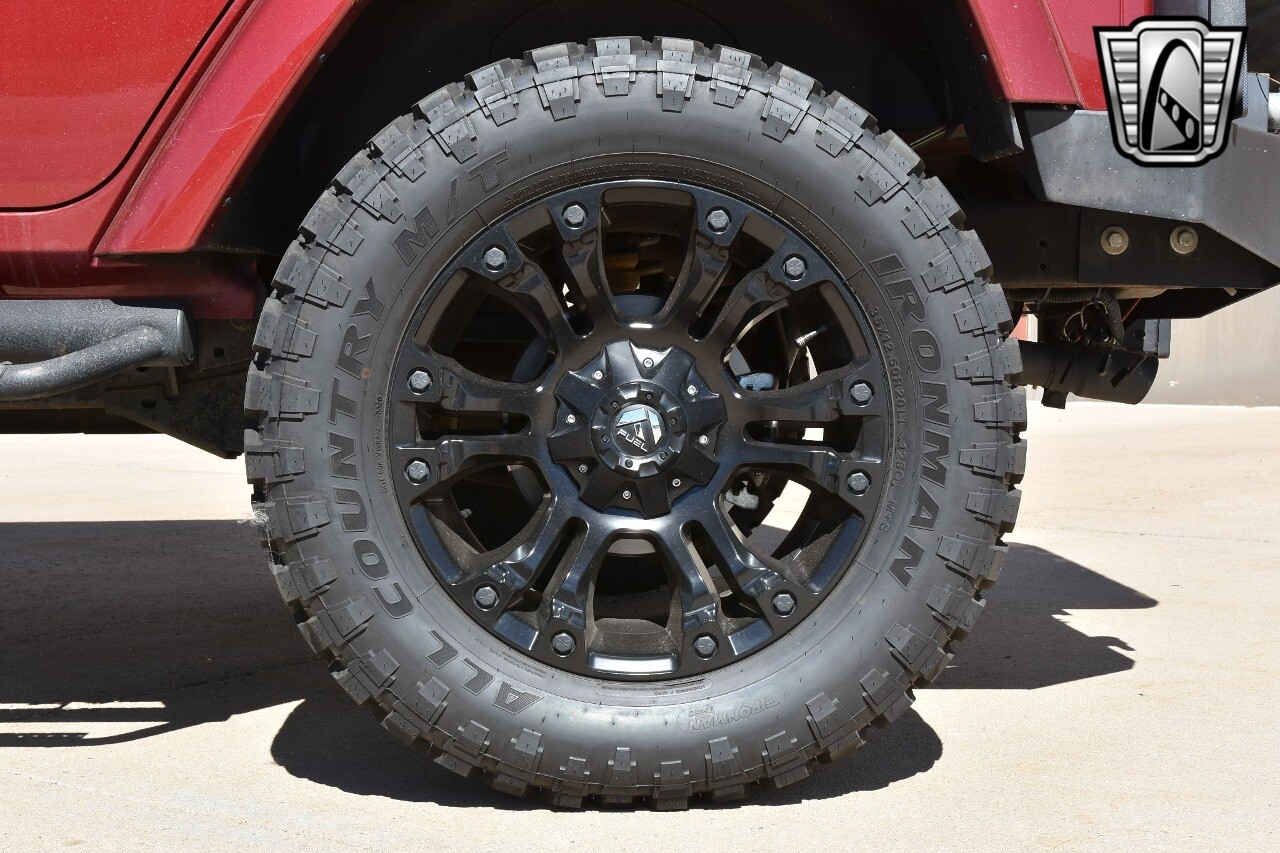 This Jeep stands out with its custom aluminum wheels and performance tires, ready to take on any adventure. The lift kit, aftermarket wheels, and bumpers further enhance its rugged appeal, while the light bars add a touch of modern style.