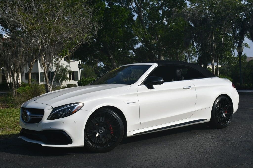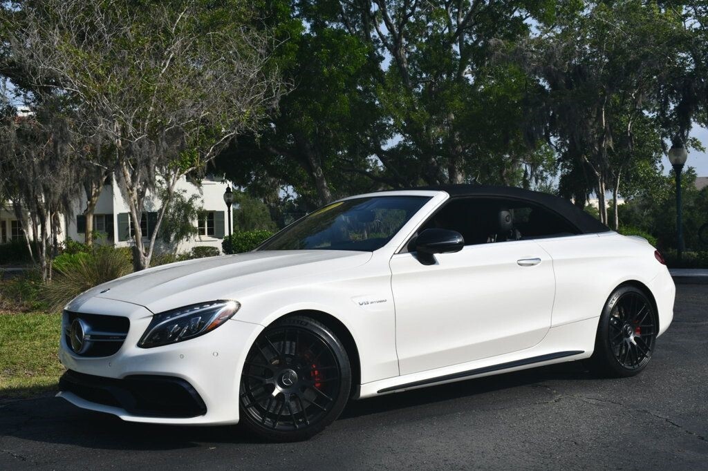 This 2017 Mercedes-Benz C-Class 2dr AMG C 63 Cabriolet with Premium 3 Package and Performance Exhaust features a 4.0L 8 CYLINDER 8cyl Gasoline engine. It is equipped with a 7 Speed Automatic transmission. The vehicle is designo Diamond White Metallic with a Black Leather interior. It is covered by a limited warranty. - Air Conditioning, Climate Control, Dual Zone Climate Control, Cruise Control, Power Steering, Power Windows, Power Door Locks, Power Mirrors, Power Drivers Seat, Power Passenger Seat, Memory Seat Position, Tachometer, Digital Info Center, Homelink System, Tilt Steering Wheel, Telescoping Steering Wheel, Steering Wheel Radio Controls, Driver Airbag, Passenger Airbag, Side Airbags, Keyless Entry, Security System, Traction Control, Rear Defogger, Intermittent Wipers, AM/FM, Anti-Theft, Leather Interior Surface, Aux. Audio Input, Birds Eye View Camera, Blind Spot Monitor, Bluetooth, Carpeted Floor Mats, Center Arm Rest, Center Console, Collision Avoidance System, Cup Holders, Daytime Running Lights, Distronic, Front AC Seats, Front Heated Seats, Heated Mirrors, Lane Keep Assist, LED Headlights/Fog Lights, Navigation System, Overhead Console, Paddle Shifter, Parking Sensors, Power Brakes, Premium Sound, Premium Wheels, Rain Sensing Wipers, Rear Fog Lamps, Rear Heated Seats , Reverse Camera, Roll Stability Control, Side Curtain Airbags, Tire Pressure Monitor, Vanity Mirrors -