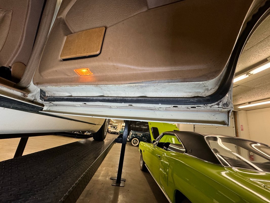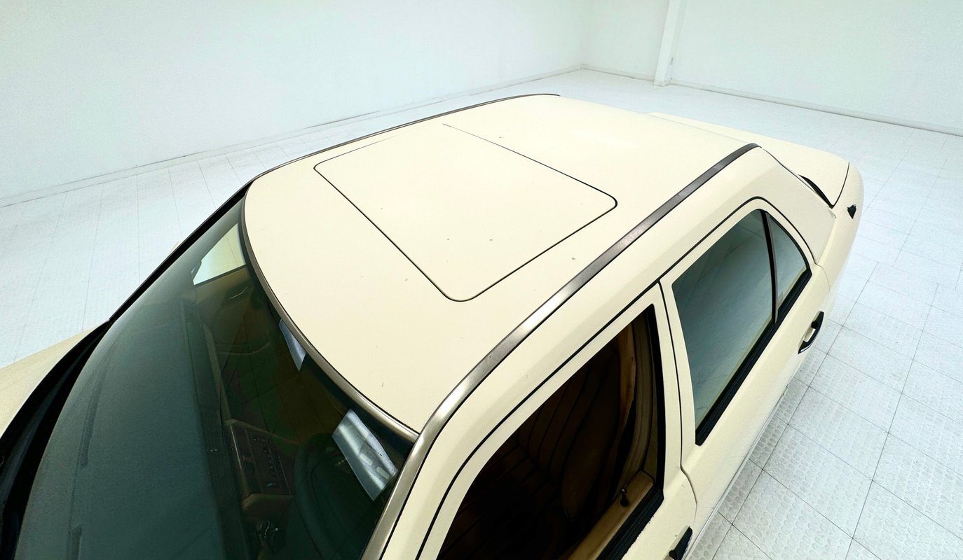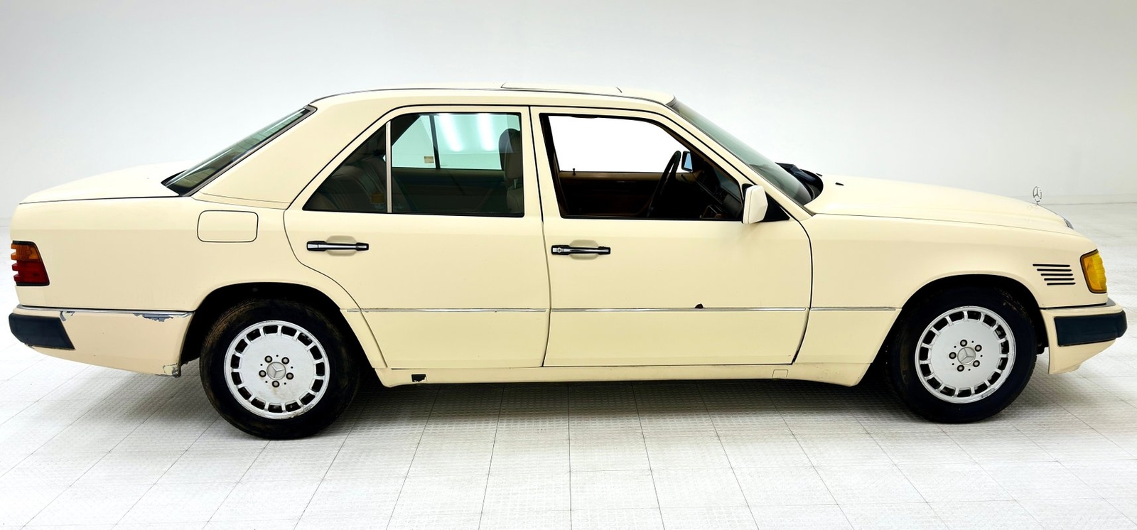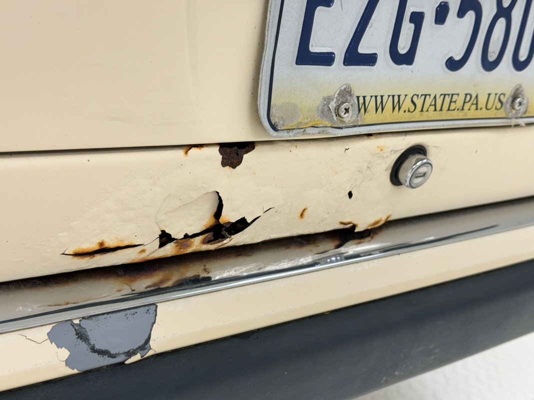 She's a bit rough around the edges and the Light Ivory paint doesn't shine as perhaps it once did, but the body is straight and devoid of any large dents. The headlight bezels have discolored over the years and there are plenty of rock chips up front. The condition of the nickel colored aluminum trim around the windows and along the rail line stands out as holding up over the years. The chrome grille as well as some plastic pieces look great while other metal, plastic and rubber pieces show some age. She's got scratches and missing chips of paint and the body panel below the trunk has invasive rust. 15-inch wheels have some discoloration or paint bubbling around the rim, some stubborn brake dust, and some curb rash but are in overall good condition. This once handsome car retains its overall charm and we're suckers for cool scoops and vents and this one has an asymmetric vent on the right front fender.