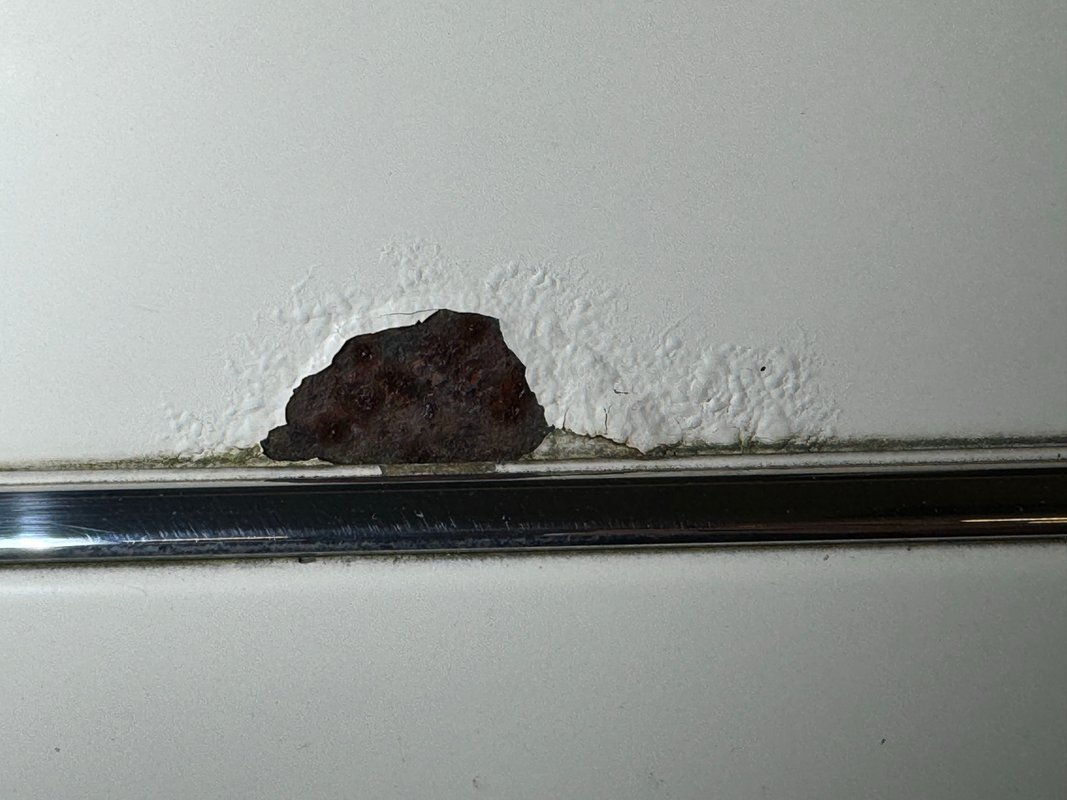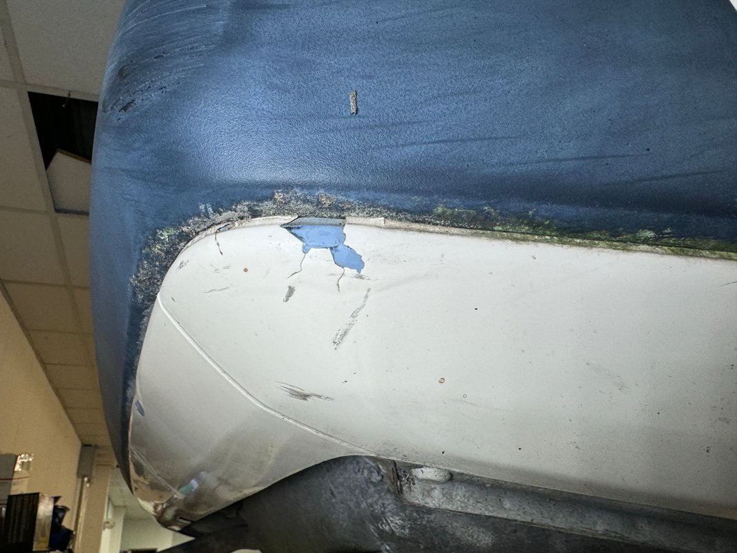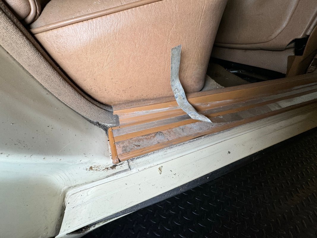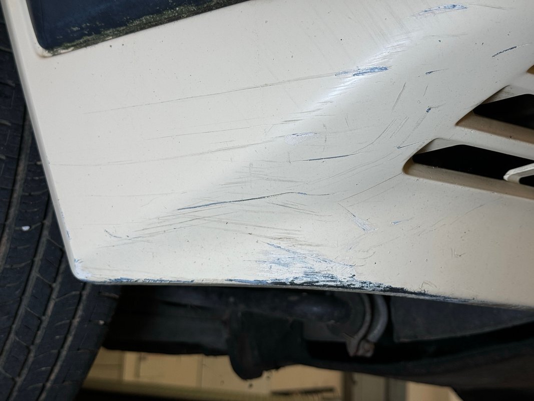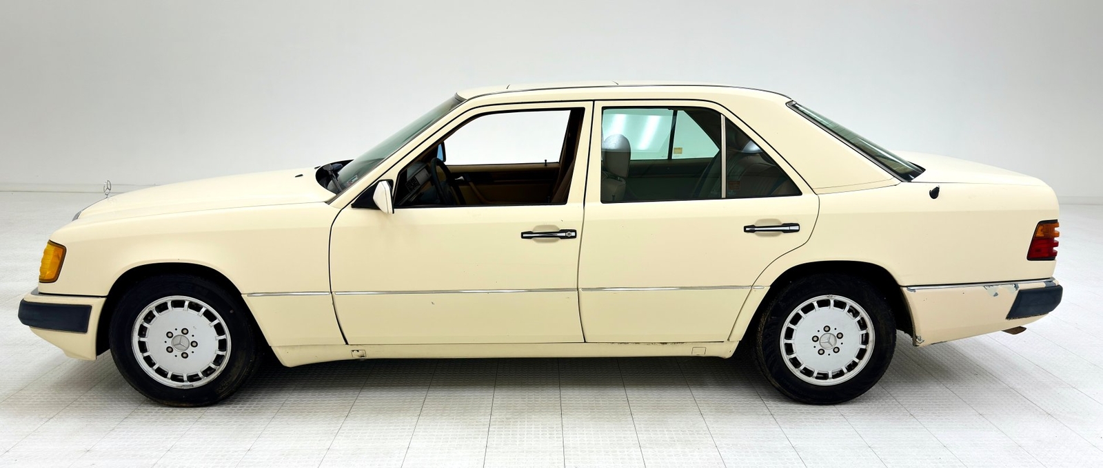 She's a bit rough around the edges and the Light Ivory paint doesn't shine as perhaps it once did, but the body is straight and devoid of any large dents. The headlight bezels have discolored over the years and there are plenty of rock chips up front. The condition of the nickel colored aluminum trim around the windows and along the rail line stands out as holding up over the years. The chrome grille as well as some plastic pieces look great while other metal, plastic and rubber pieces show some age. She's got scratches and missing chips of paint and the body panel below the trunk has invasive rust. 15-inch wheels have some discoloration or paint bubbling around the rim, some stubborn brake dust, and some curb rash but are in overall good condition. This once handsome car retains its overall charm and we're suckers for cool scoops and vents and this one has an asymmetric vent on the right front fender.