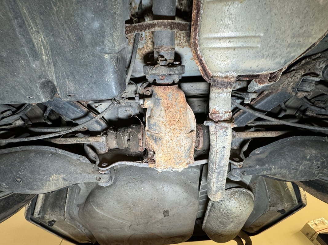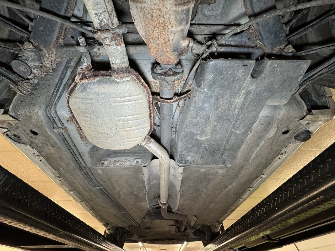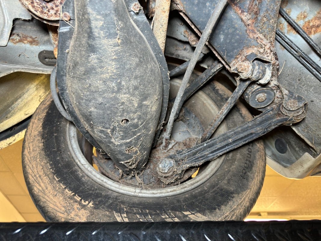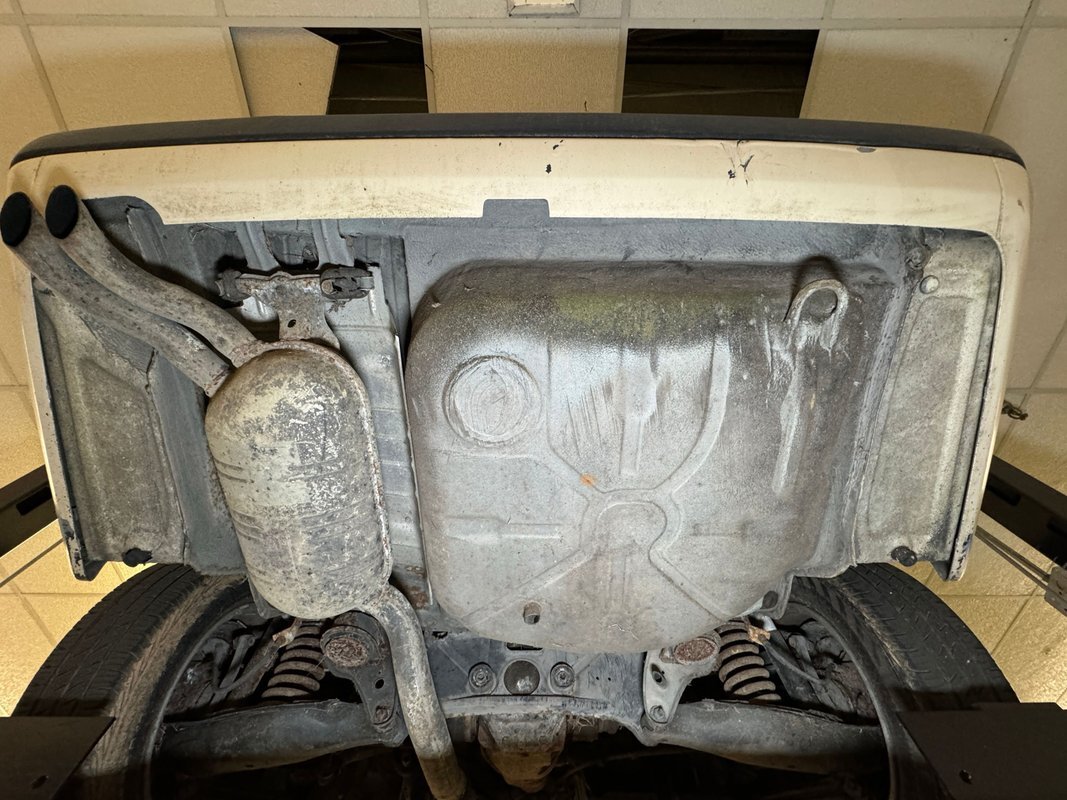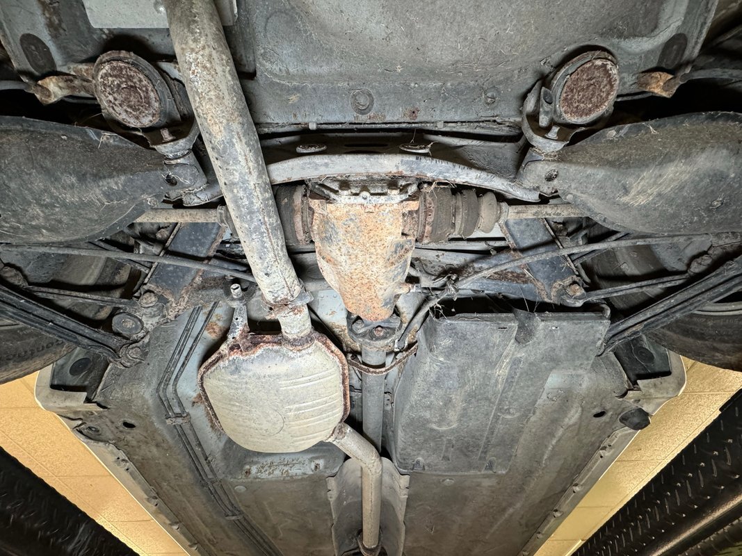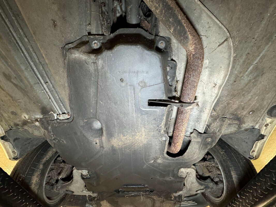 Belly pans and panels obscure much of the underside but what we can see is fully expected. Plenty of advanced surface rust and a lot of pitted rust as well. There's evidence of some oil up by the engine but putting it in perspective, we would say that the underside has held up as well as one would expect for an East coast car. Independent suspension is front and rear with MacPherson struts up front and coil springs in the rear.
