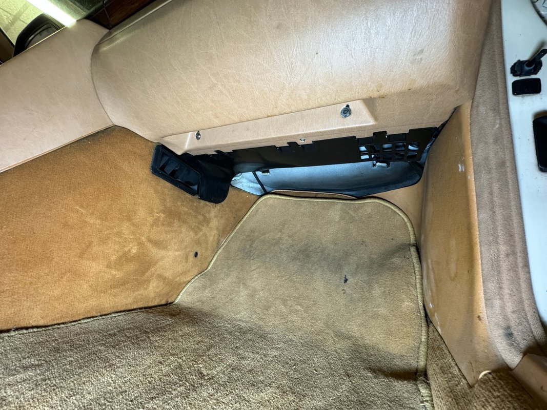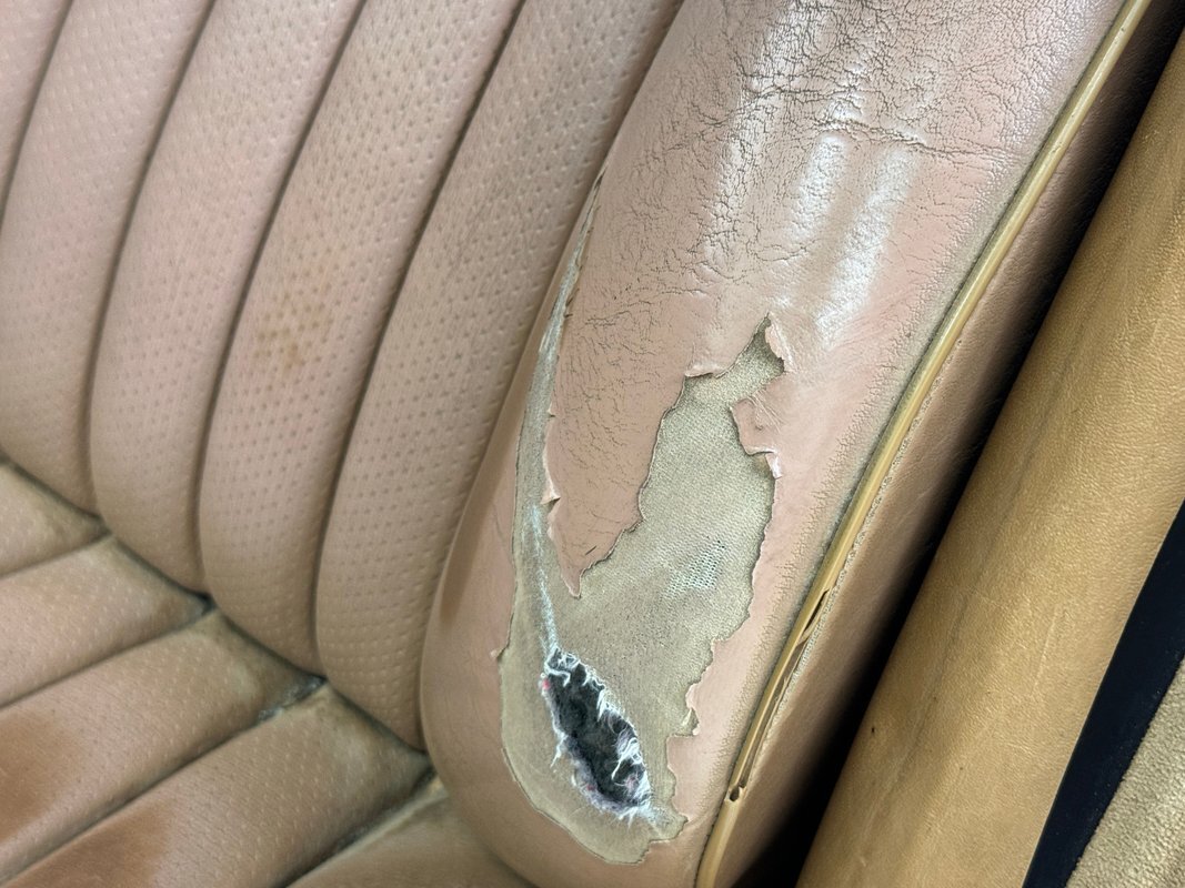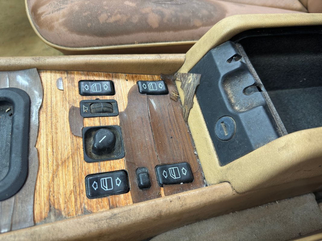 Soiled and worn, the door panels still look handsome to us! A deep detailing could bring this back to its former glory with the wood applique and leather panel. All the components and hardware are intact and after more than 200,000 miles, you won't be able to say that about very many cars from this era. Anyway, the leather bucket seats, notably the driver's, are peeling, torn, discolored, and weathered. The rear seat fares much better, as usual, and looks good, but dirty. Some aluminum trim is peeling from the sill plate. From the steering wheel forward, it's about simplicity and quality, and although dusty and dirty, the plastics and wood are in good condition. On the center stack there is some cracking in the urethane that coats the wood while the center console around the shifter is peeling badly as the recipient of direct sun through the windshield. There's obvious usage on the carpet and discoloration of the footwell walls and the headliner is loose.