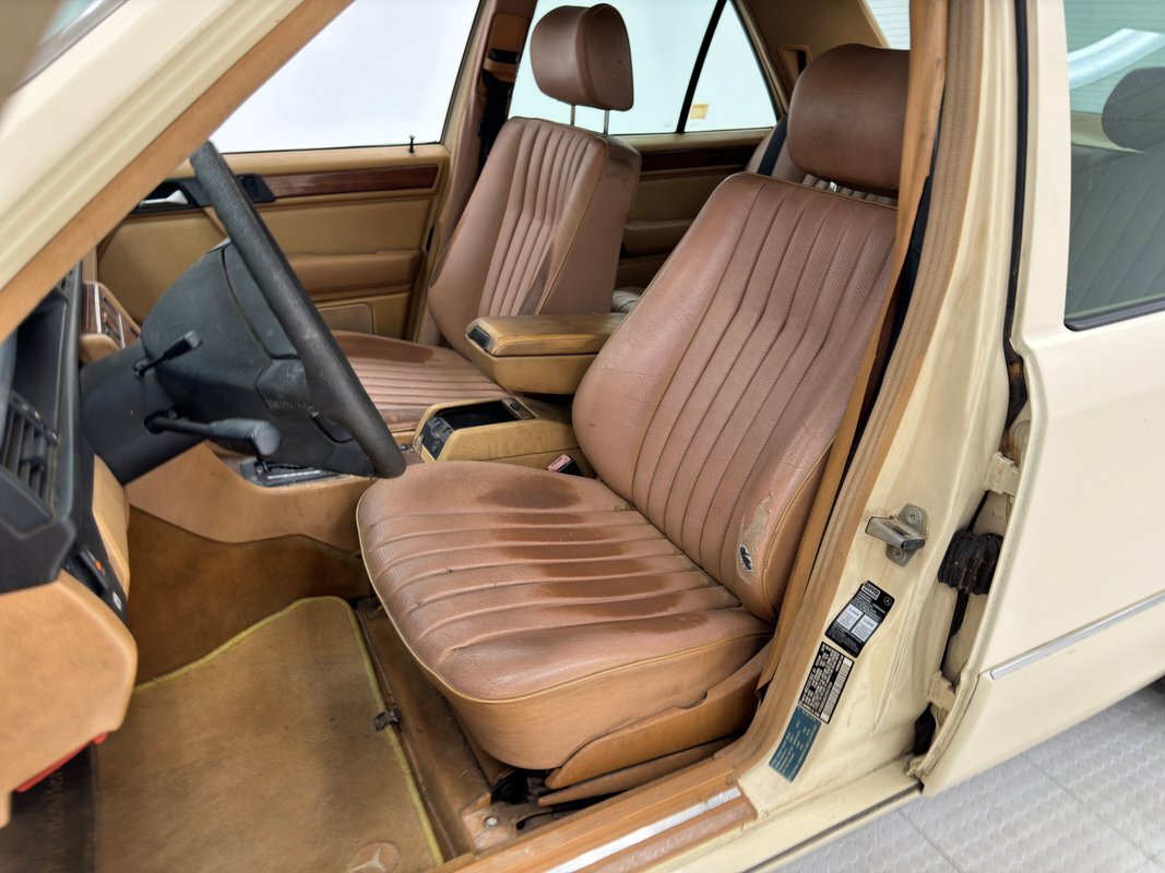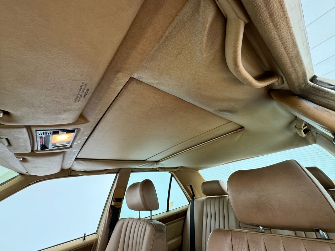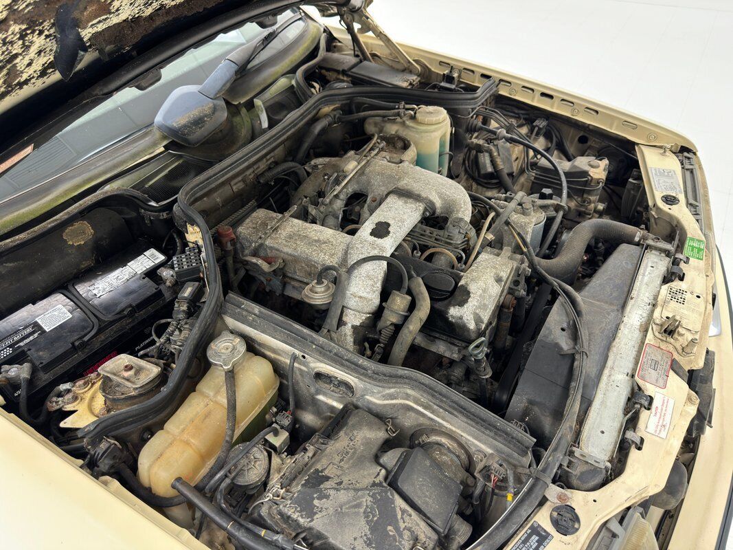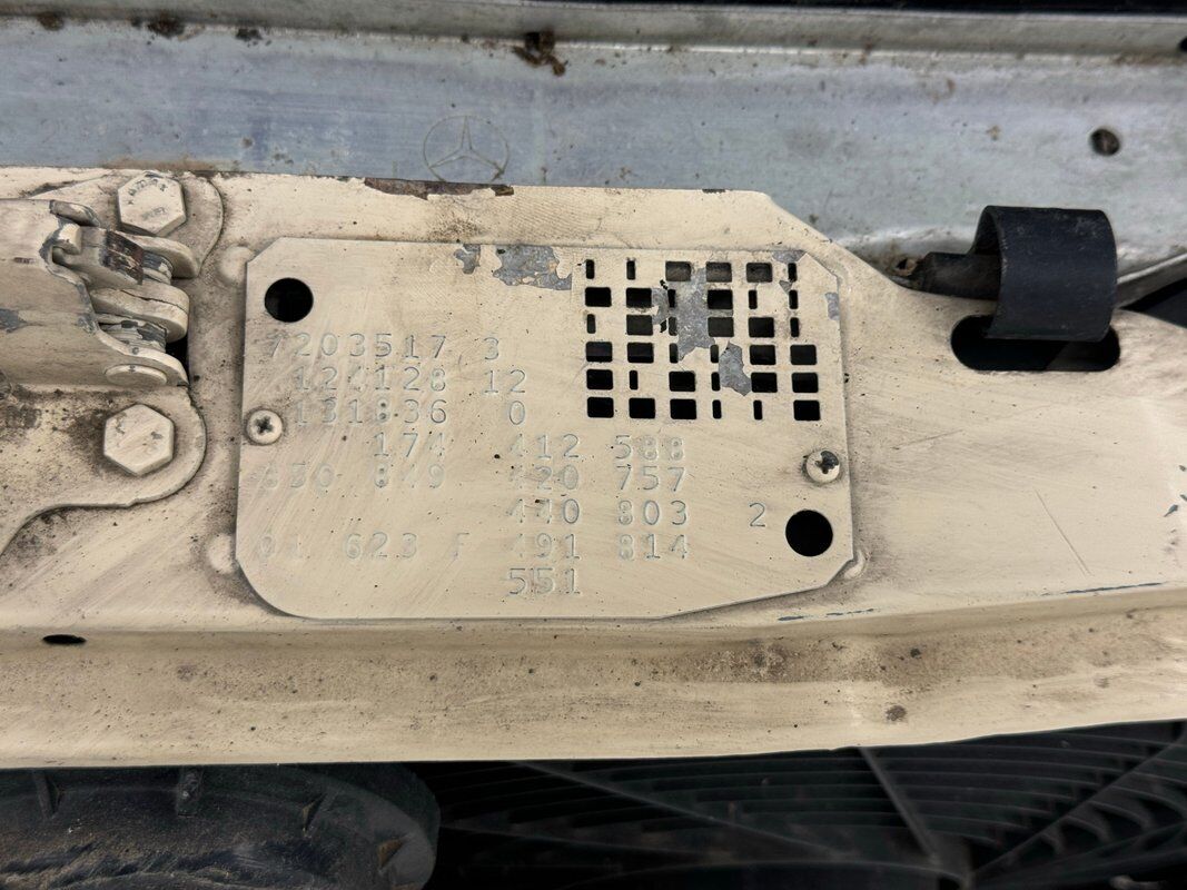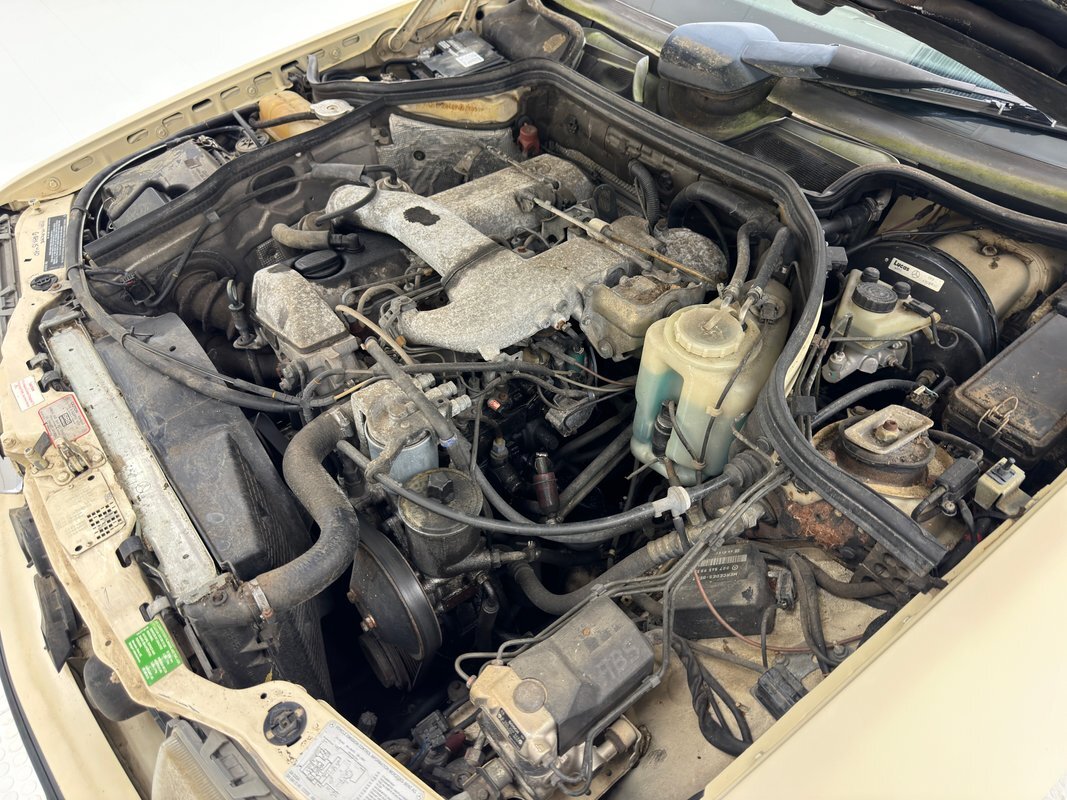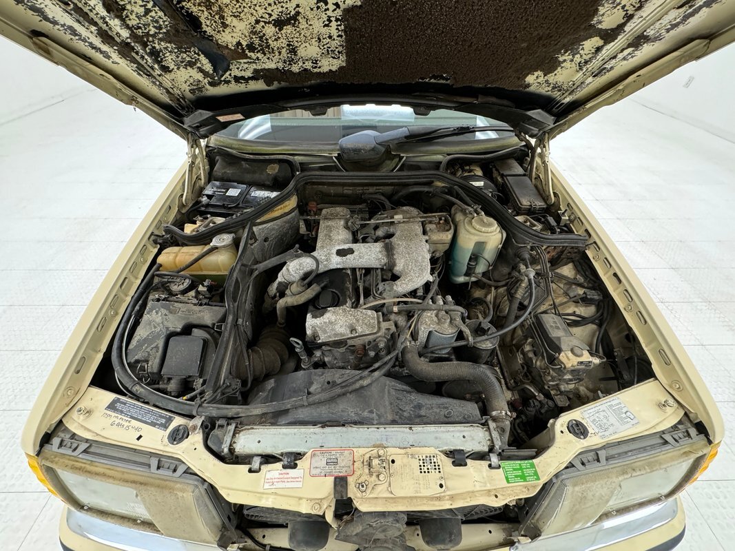 Opening the hood, we find a driver quality engine depicting its high mileage and the hood liner is shredded. What's under there is a 2.5 liter inline 5 cylinder engine rated at 121 horsepower. It is fuel injected and tied to a 4-speed automatic transmission which drives the rear wheels via 2.87 gears. Nothing short of power disc brakes would do for Mercedes and that's what we have at all four wheels.