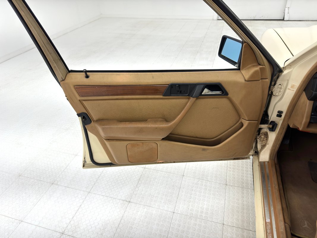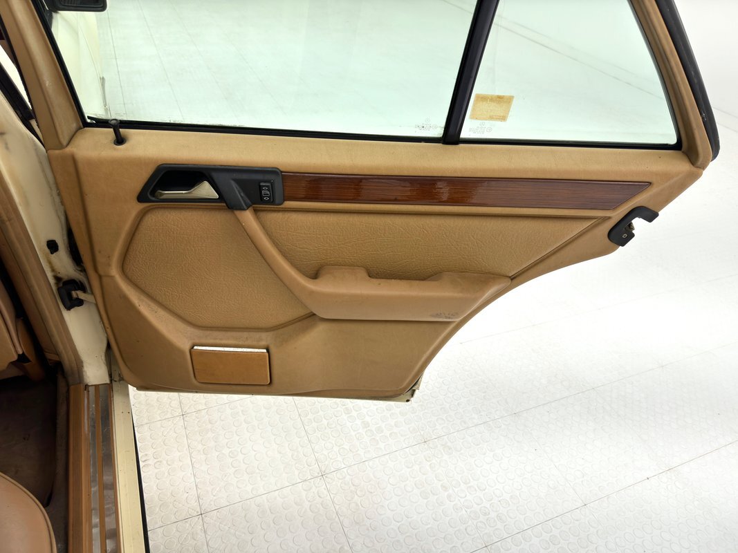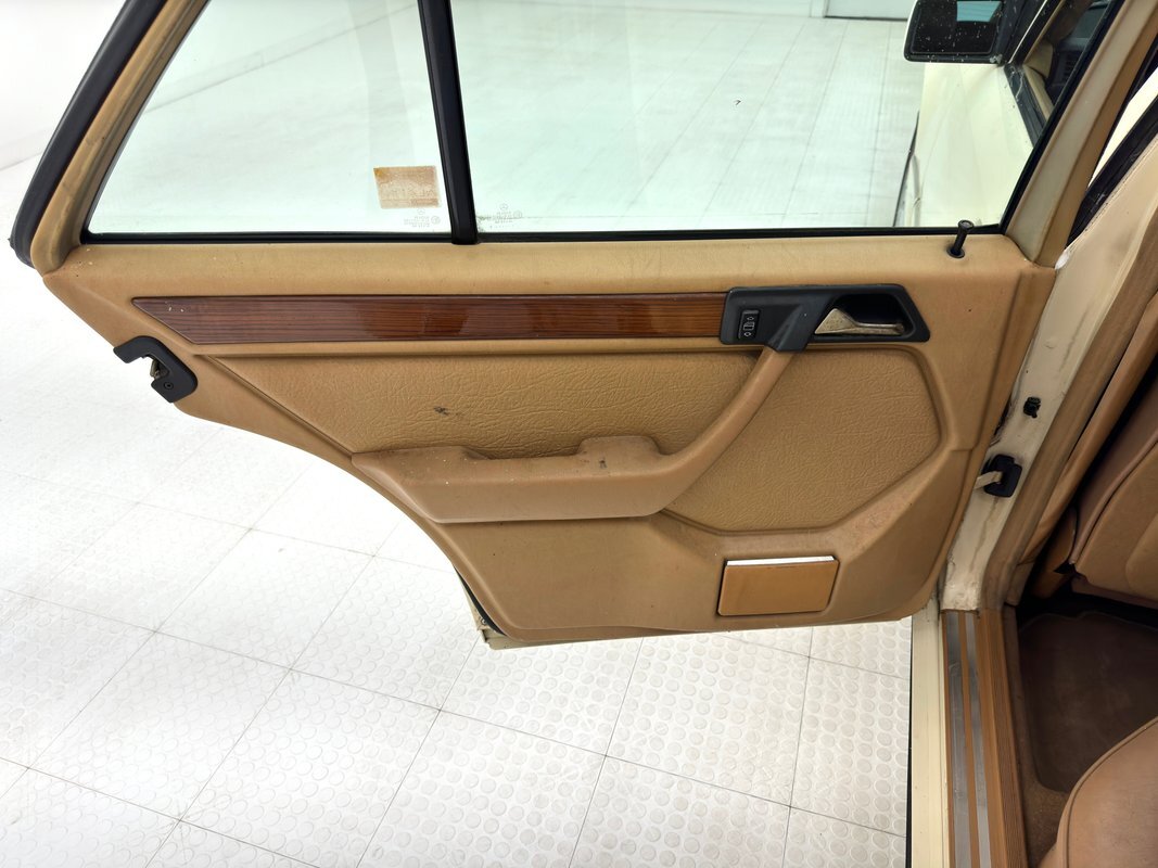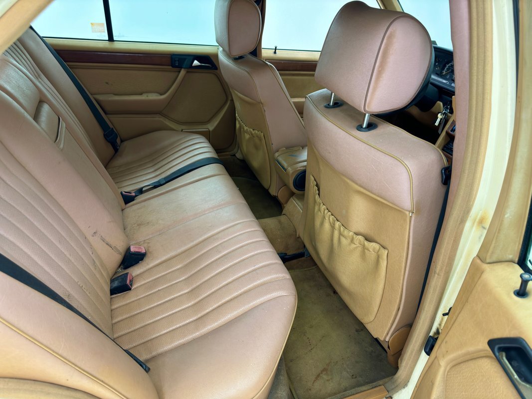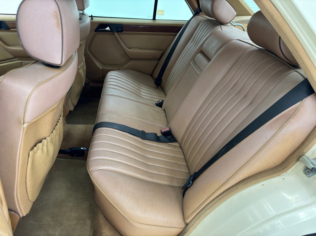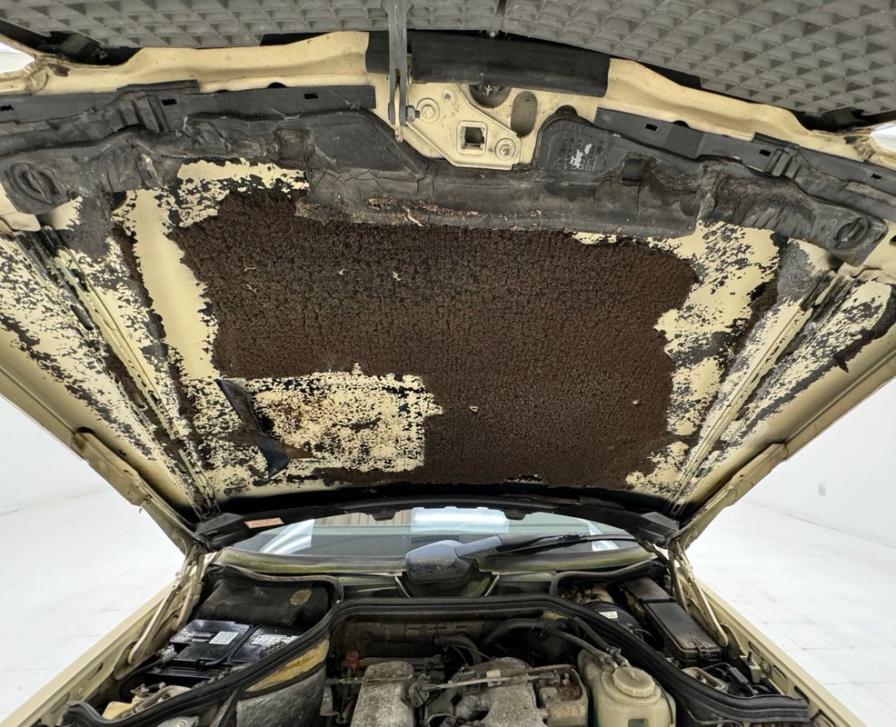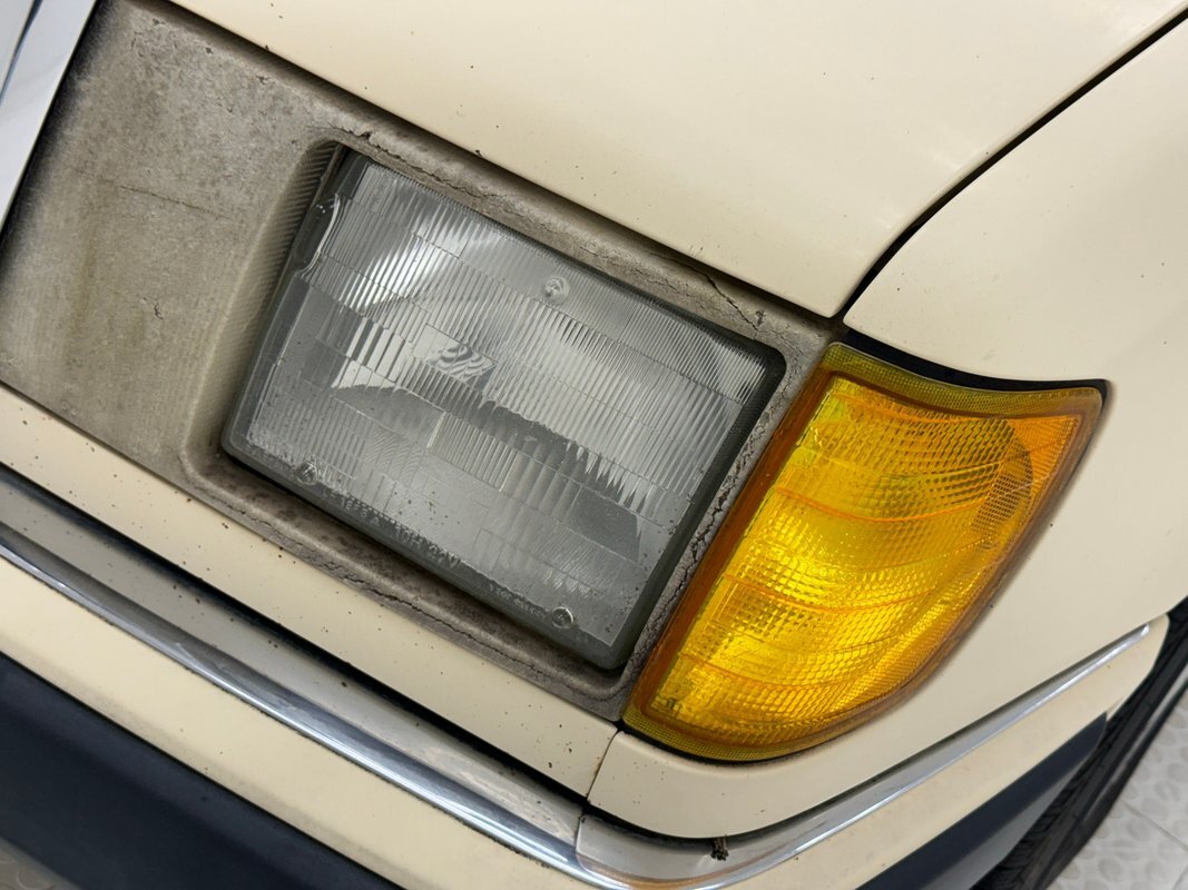 Opening the hood, we find a driver quality engine depicting its high mileage and the hood liner is shredded. What's under there is a 2.5 liter inline 5 cylinder engine rated at 121 horsepower. It is fuel injected and tied to a 4-speed automatic transmission which drives the rear wheels via 2.87 gears. Nothing short of power disc brakes would do for Mercedes and that's what we have at all four wheels.