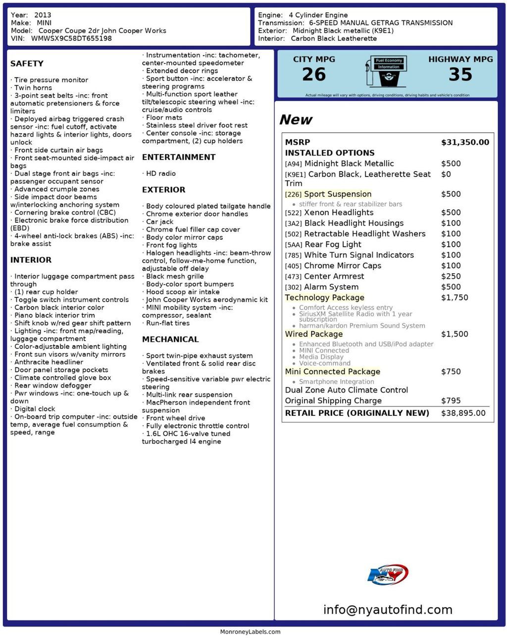 Take a look at this 2013 Midnight Black Metallic MINI Cooper John Cooper Works with Carbon Black Leatherette Interior. This car is sleek, sporty and stylish. The tasteful markings, stunning wheels, and well maintained surfaces give this a look that is unforgettable. It also has an abundance of packages and options making this one desirable vehicle. It comes equipped with a 2.0L 4-cylinder engine paired to an 8-speed Automatic Transmission, Technology Package (with Harman/Kardon Premium Sound System, SiriusXM Satellite Radio, Comfort Access Keyless Entry), Wired Package (with Enhanced Bluetooth and USB, MINI Connected, Media Display, Voice Command), MINI Connected Package (with Smartphone Integration), Sport Suspension (with Stiffer Front and Rear Stabilizer Bars), Xenon Headlights, Black Headlight Housings, Retractable Headlight Washers, Rear Fog Light, White Turn Signal Indicators, Chrome Mirror Caps, Alarm System, Dual Zone Automatic Climate Control, Center Armrest, Cruise Control, AM/FM/HD Radio, Steering Wheel Controls, Power Windows, Power Locks, Air Conditioning and so much more. Every NY Auto Find vehicle comes with a complimentary Limited Warranty and a Carfax Vehicle Report. Our vehicles are priced to sell quickly. Please call to check availability and to schedule an appointment. -