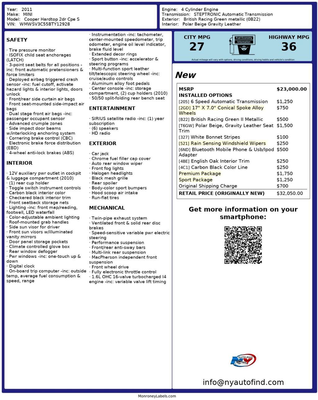 Take a look at this British Racing Green Metallic 2011 MINI Cooper S with Polar Beige Gravity Leather Interior, a Clean Carfax and only 90,726 miles. When you see this car, you know you are looking at something amazing. It has a ton of optional features, low mileage and a classy well maintained appearance. It even has a super clean history, making this a car that is great in every way. It comes equipped with a 1.6L 4-cylinder Engine paired to a 6-speed Automatic Transmission, Premium Package (with Dual Pane Panoramic Sunroof, Dual Zone Automatic Climate Control, Harman/Kardon Premium Sound System), Sport Package (with 17 Conical Spoke Alloy Wheels, Dynamic Traction Control, White Turn Signal Lights, Xenon Headlights), Gravity Leather Seat Trim, White Bonnet Stripes, Rain Sensing Windshield Wipers, Bluetooth Mobile Phone and USB, English Oak Interior Trim, Carbon Black Color Line, Cruise Control, Steering Wheel Controls, AM/FM/HD Radio, Sirius Satellite Radio, Power Windows, Power Locks, Air Conditioning and so much more. Every NY Auto Find vehicle comes with a complimentary Limited Warranty and a Carfax Vehicle Report. Our vehicles are priced to sell quickly. Please call to check availability and schedule an appointment. -