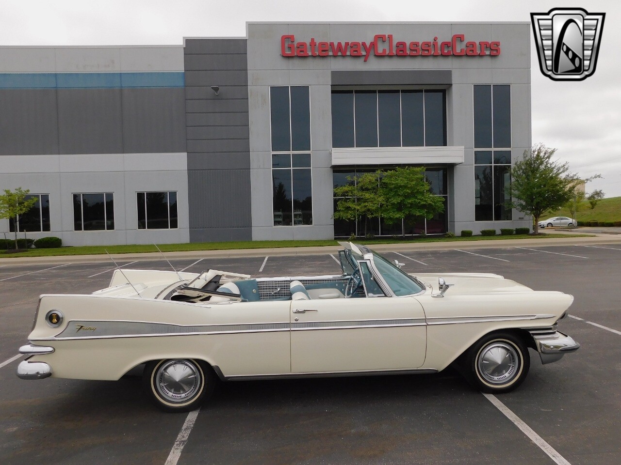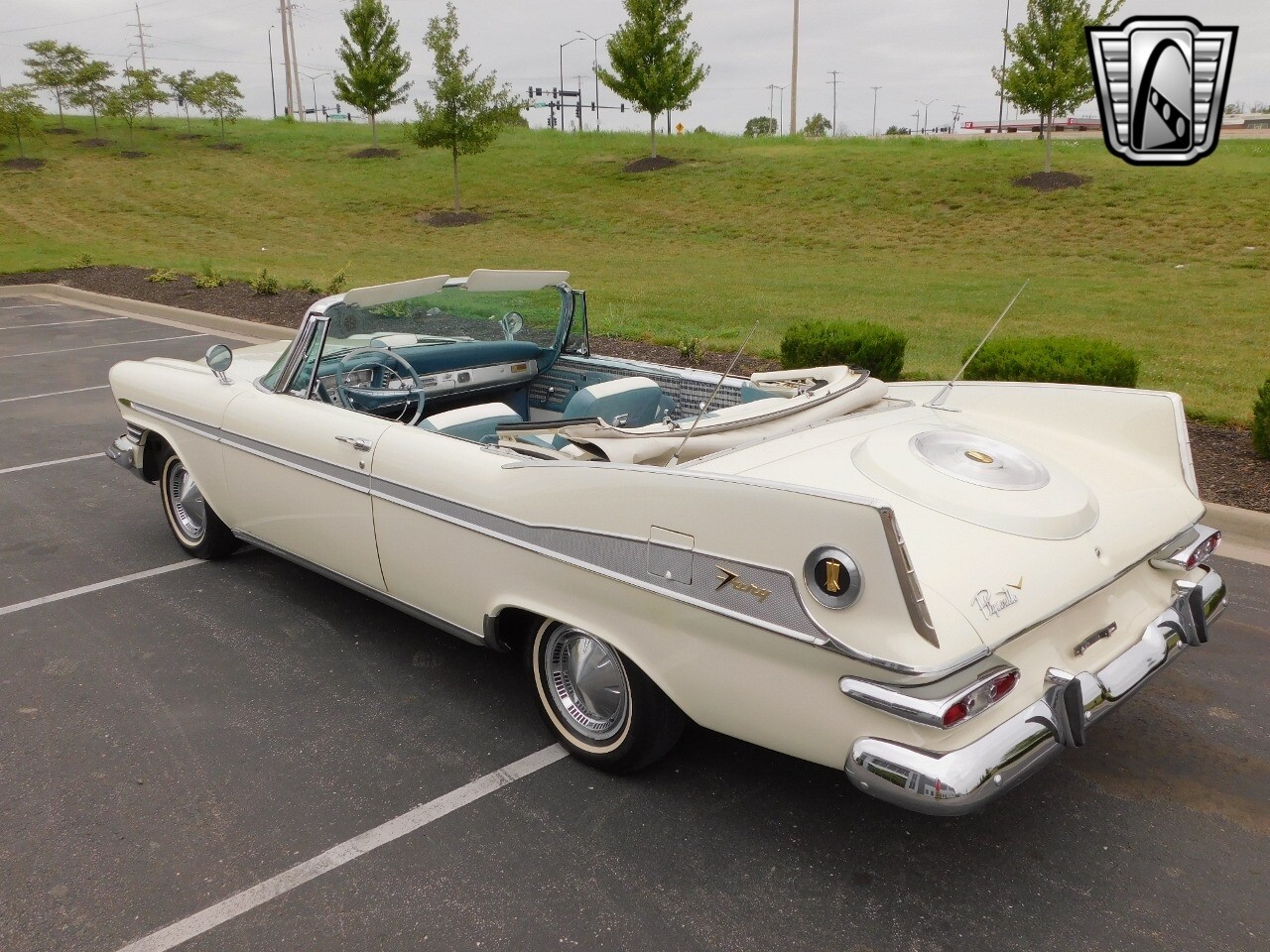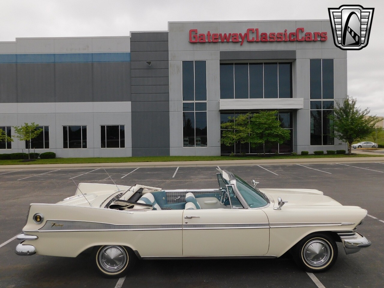 Gateway Classic Cars of Kansas City is proud to digitally present this 1959 Plymouth Sport Fury Convertible, a classic embodiment of automotive design and engineering. This stunning vehicle boasts a pristine white exterior that uniquely complements its sophisticated blue and white interior, creating a striking visual appeal that is sure to turn heads wherever you go.