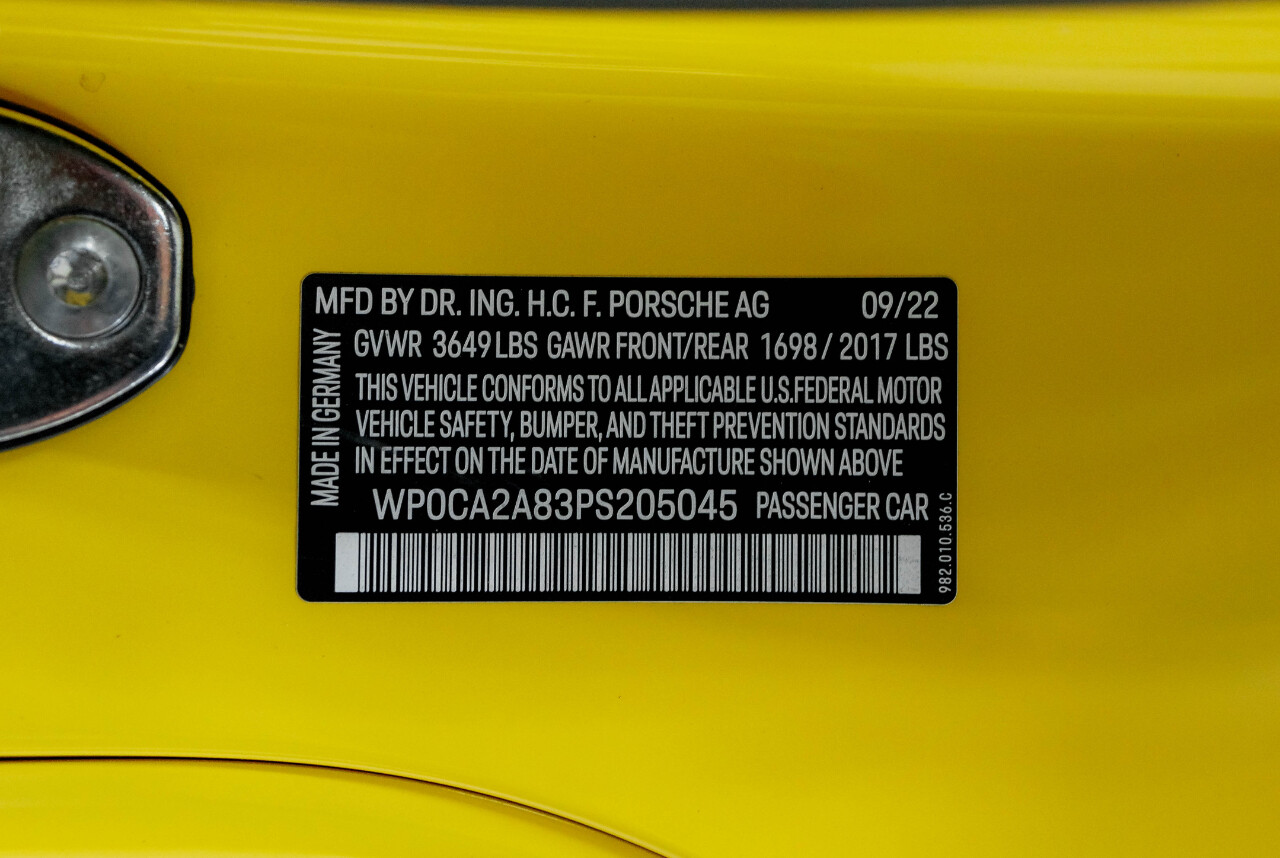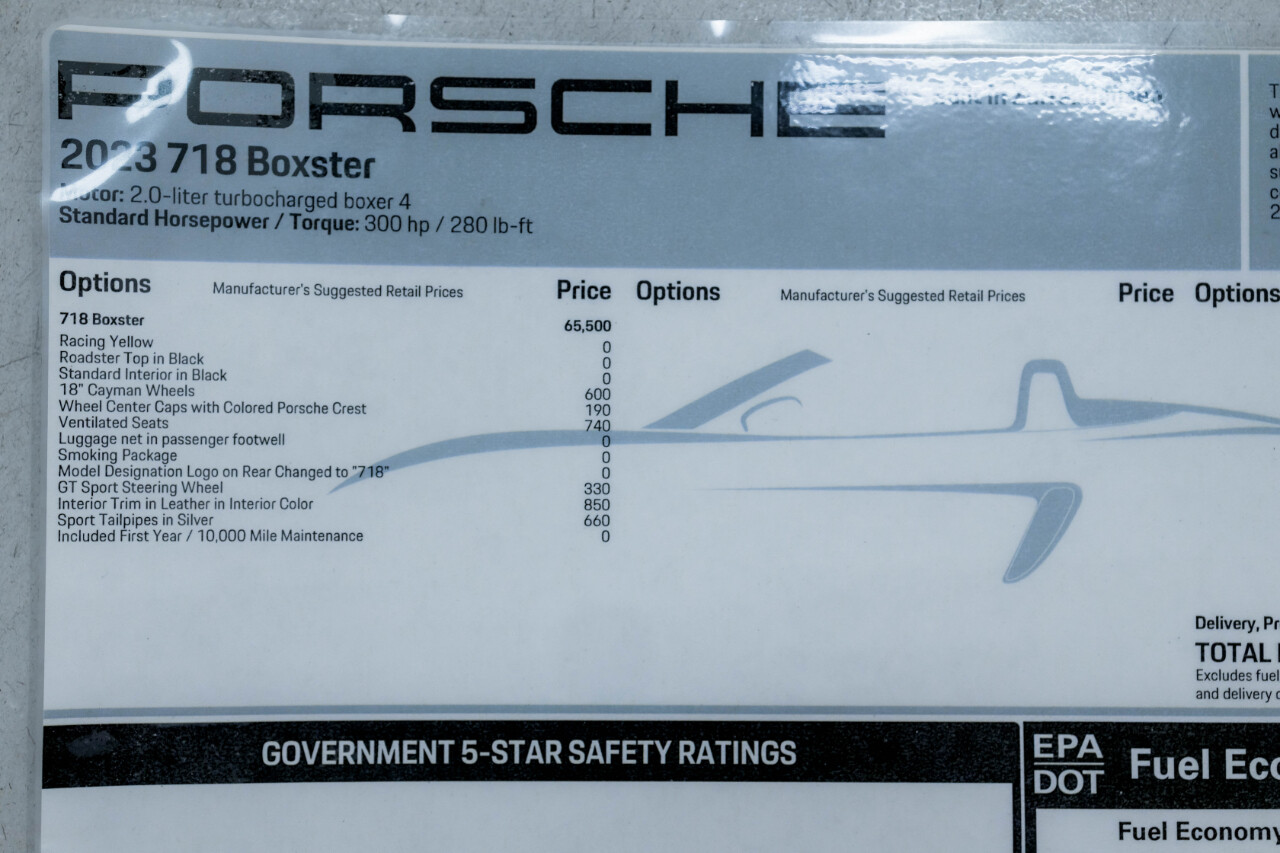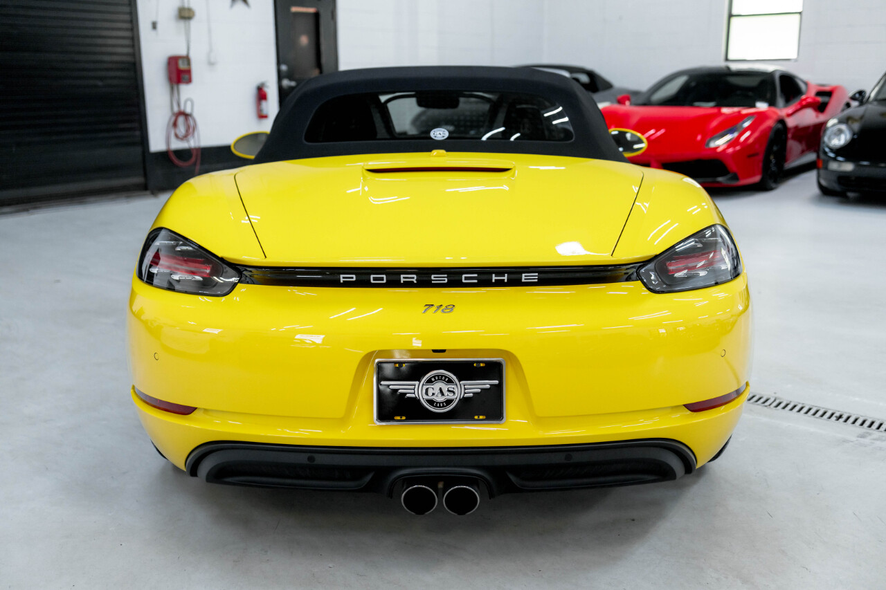 FULL HIGH RESOLUTION PHOTOS AND DETAILED DESCRIPTION ON YOU HAVE A VEHICLE YOU ARE LOOKING TO SELL, PLEASE CALL US AT 770-769-1398WE SHOW VEHICLES BY APPOINTMENT ONLY. PLEASE CALL TO SCHEDULE AN APPOINTMENT IN ORDER TO VIEW A LISTING IN PERSON.NEW ARRIVAL!! 1 OWNER!! QUALIFIES FOR CERTIFIED EXTENDED WARRANTY, PLEASE INQUIRE FOR MORE DETAILS! RACING YELLOW PORSCHE 718 BOXSTERWITH PPF ON FRONT CLIP!! STUNNING CAR INSIDE AND OUT; ALWAYS GARAGE KEPT. DEALER SERVICED. COMES WITH BOOKS, MANUALS, AND ORIGINAL WINDOW STICKER. $70,320 ORIGINAL MSRP!!EXTERIOR IS FINISHED IN RACING YELLOW WITH BLACK LEATHER INTERIOR AND A BLACK TOP.2.0L TURBOCHARGED BOXER 46-SPEED MANUAL TRANSMISSIONROADSTER TOP IN BLACK18 CAYMAN WHEELSWHEEL CENTER CAPS WITH COLORED PORSCHE CRESTHEATED AND VENTILATED FRONT SEATSGT SPORT STEERING WHEELSPORT TAILPIPES IN LEATHERAND MUCH MORE.GAS MOTORCARS IS A FAMILY OWNED AND OPERATED CAR DEALERSHIP LOCATED IN MARIETTA, GA. WE ONLY SELL VEHICLES OF THE HIGHEST QUALITY. WE SHIP VEHICLES WORLDWIDE AT THE BUYER'S EXPENSE. WE TAKE CONSIGNMENTS AS WELL AS TRADES.WE SHOW VEHICLES BY APPOINTMENT ONLY.PLEASE CALL AHEAD TO SCHEDULE A DATE AND TIME IN ORDER TO VIEW A LISTING IN PERSON.CONNECT WITH US ON INSTAGRAM @GASMOTORCARSIt is the customers sole responsibility to verify the existence and condition of any equipment listed. Neither the dealership nor DealerCarSearch is responsible for misprints on prices or equipment. It is the customers sole responsibility to verify the accuracy of the prices with the dealer, including the pricing for all added accessories. Visit Gas Motorcars online at to see more pictures of this vehicle or call us at770-769-1398 today to schedule your test drive.