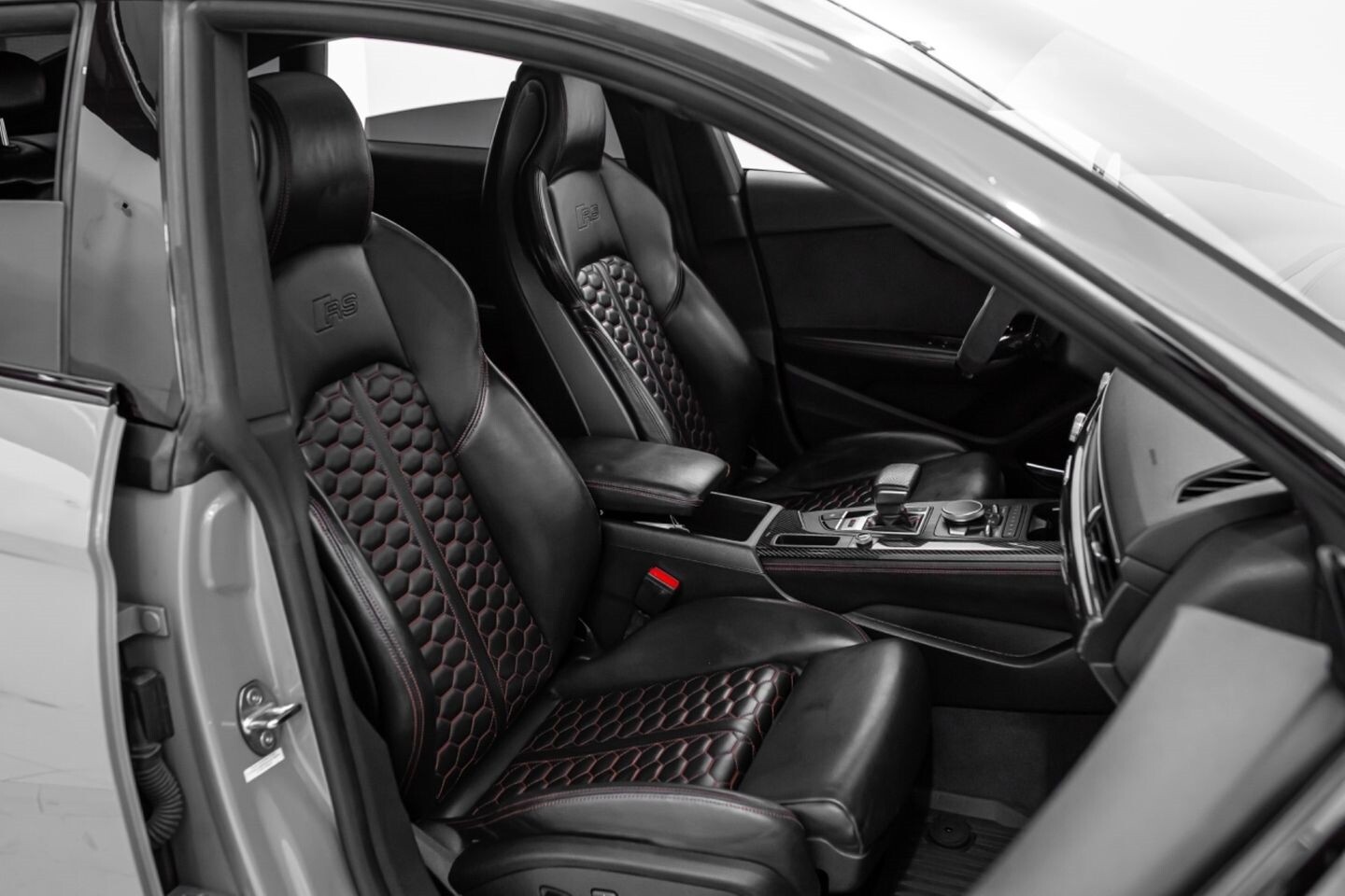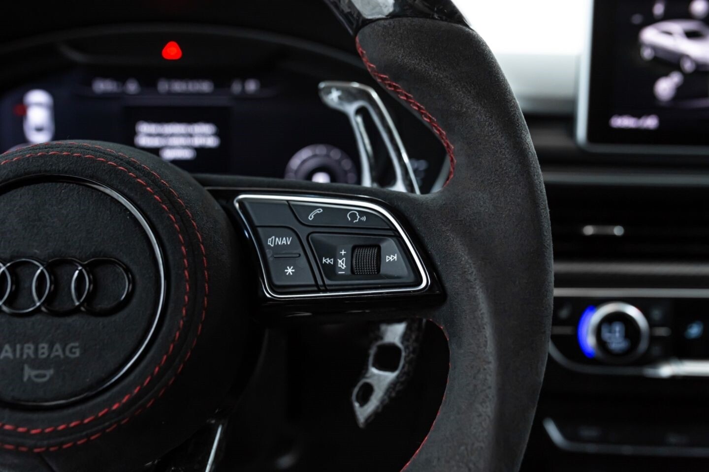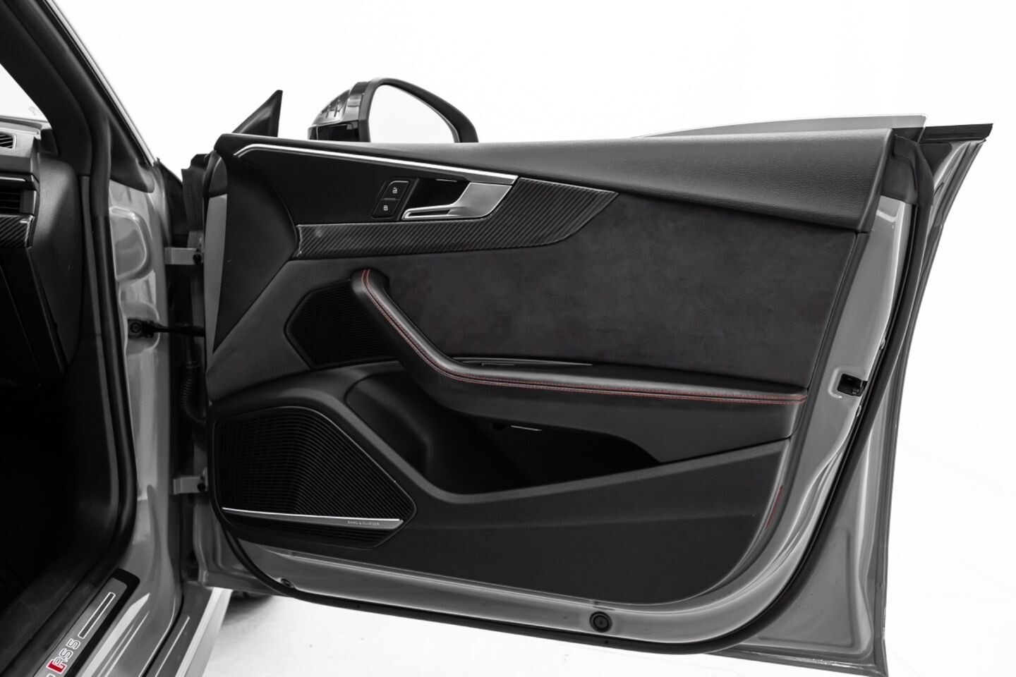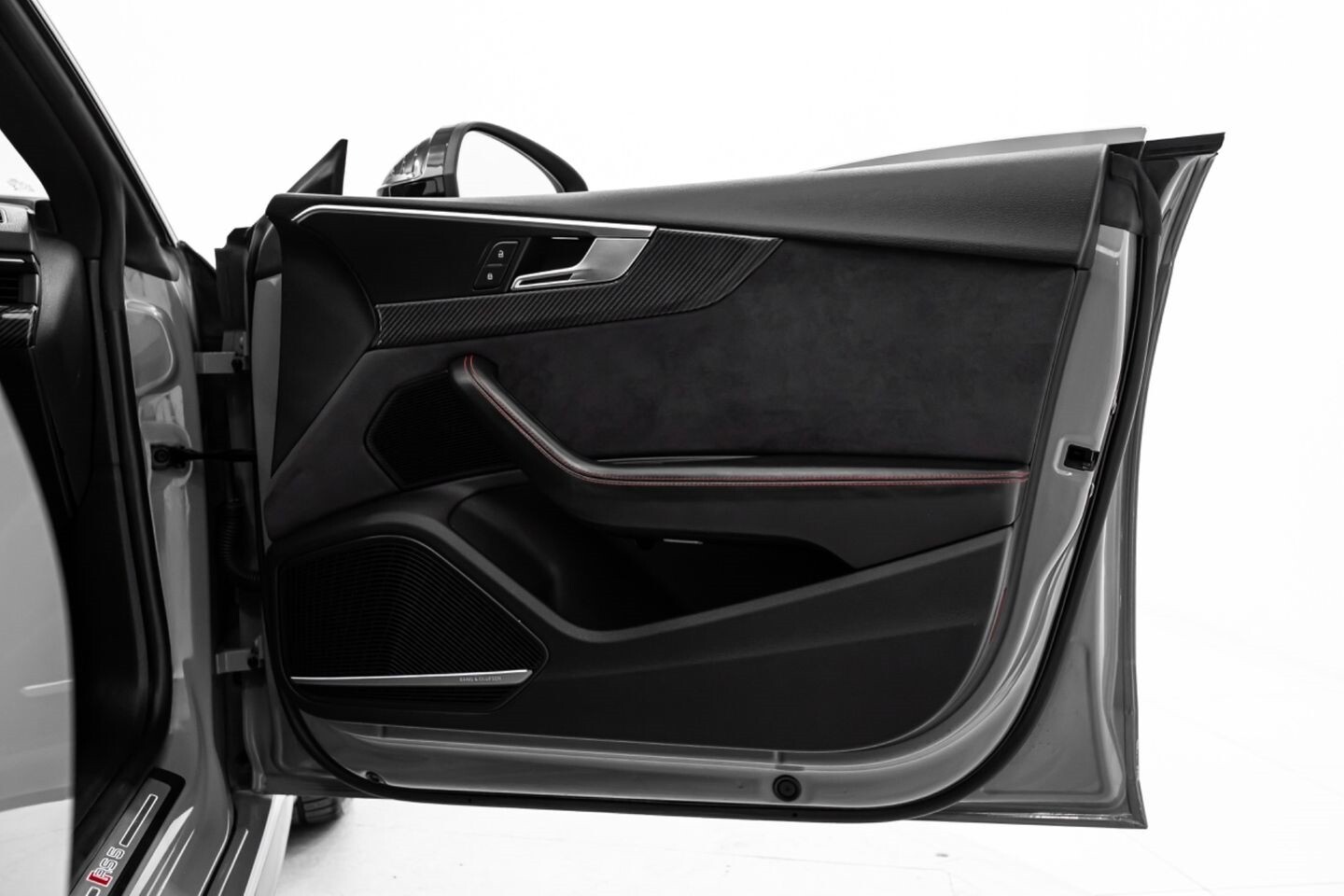 This 2019 Audi RS 5 Sportback is a luxury sedan that seamlessly blends performance and style. Under the hood is a twin-turbocharged 2.9-liter V6 engine that produces 444 horsepower and 443 lb-ft of torque, all of which is sent through a eight-speed automatic transmission to all four wheels. This sleek machine comes equipped with 20" Vorsteiner Technik Performance wheels and is finished in Nardo Gray, an iconic color that enhances the car's aggressive lines. In the interior, this RS 5 offers heated leather "RS"-embossed sport seats, a forged carbon fiber and suede "RS" steering wheel, carbon fiber paddle shifters, carbon fiber interior trim pieces, multi-zone climate controls, selectable drive modes, a digital instrument cluster with multiple displays, and an infotainment system with Bluetooth, navigation, phone connectivity, AUX, Apple CarPlay, Android Auto, and a backup camera, truly making this car the complete package.