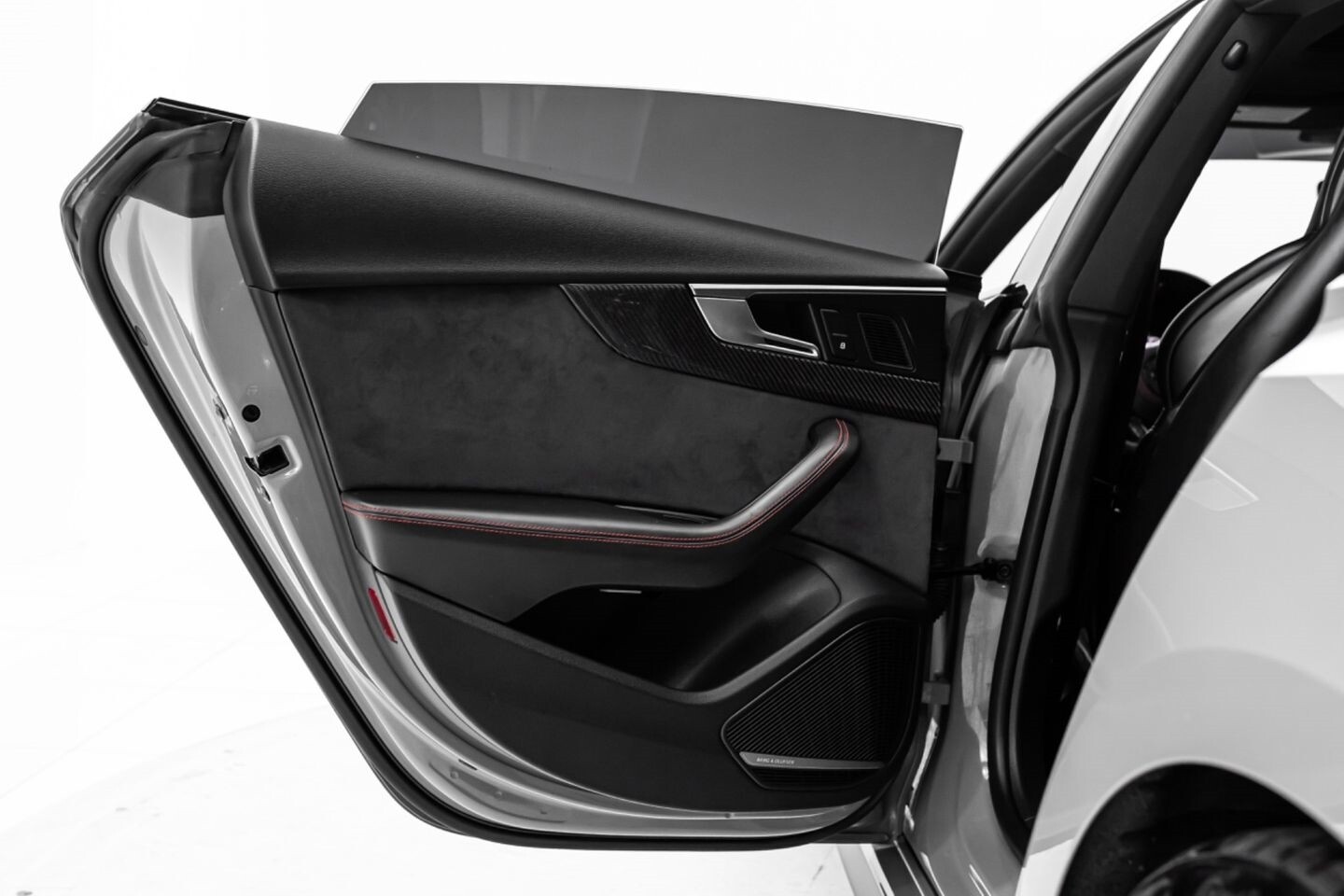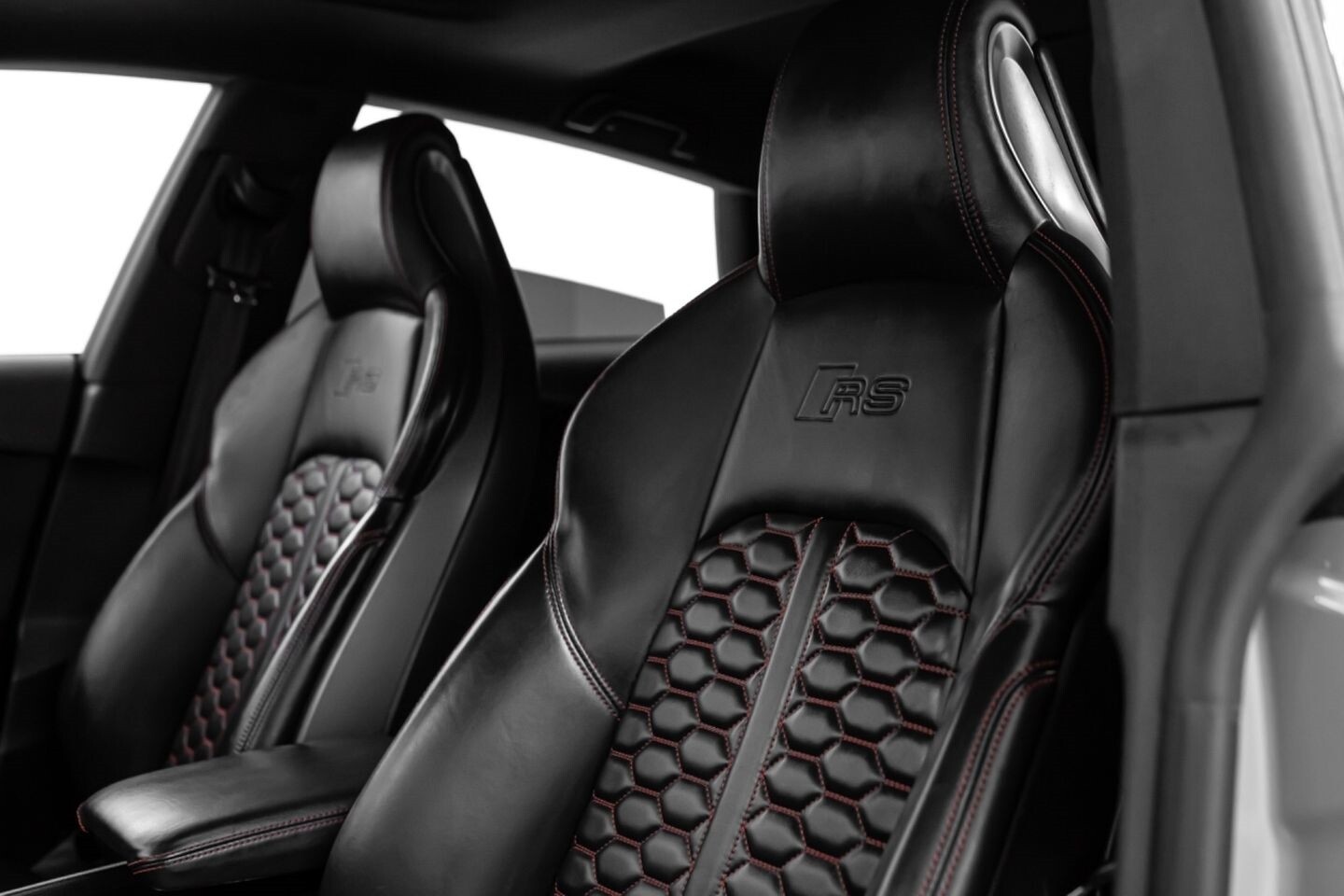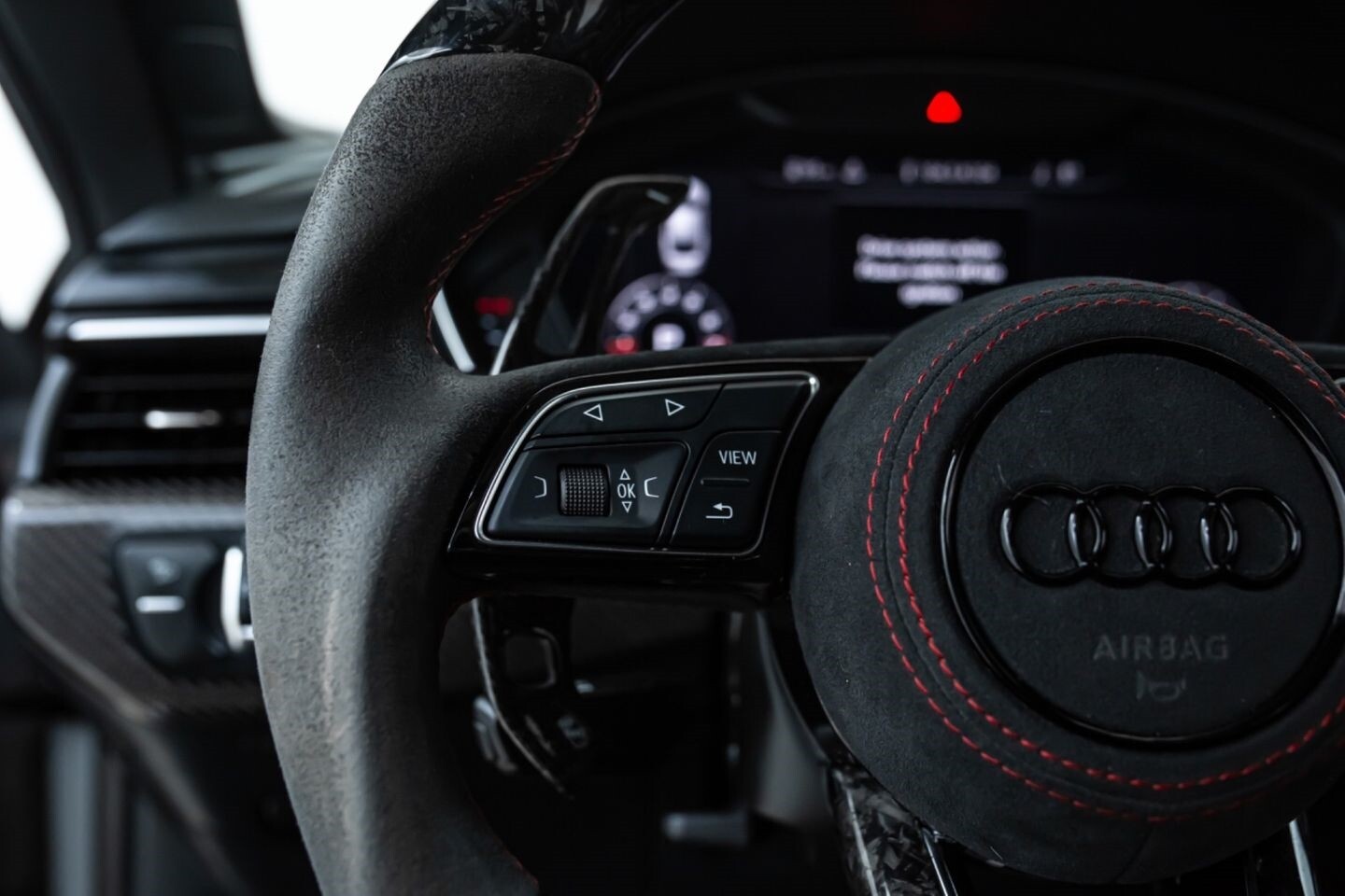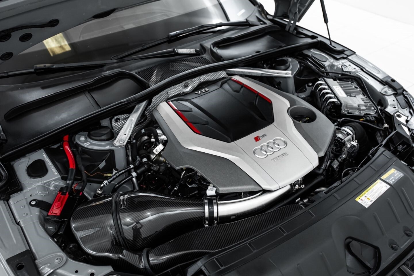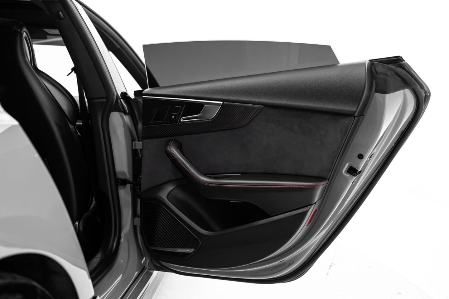 This 2019 Audi RS 5 Sportback is a luxury sedan that seamlessly blends performance and style. Under the hood is a twin-turbocharged 2.9-liter V6 engine that produces 444 horsepower and 443 lb-ft of torque, all of which is sent through a eight-speed automatic transmission to all four wheels. This sleek machine comes equipped with 20" Vorsteiner Technik Performance wheels and is finished in Nardo Gray, an iconic color that enhances the car's aggressive lines. In the interior, this RS 5 offers heated leather "RS"-embossed sport seats, a forged carbon fiber and suede "RS" steering wheel, carbon fiber paddle shifters, carbon fiber interior trim pieces, multi-zone climate controls, selectable drive modes, a digital instrument cluster with multiple displays, and an infotainment system with Bluetooth, navigation, phone connectivity, AUX, Apple CarPlay, Android Auto, and a backup camera, truly making this car the complete package.
