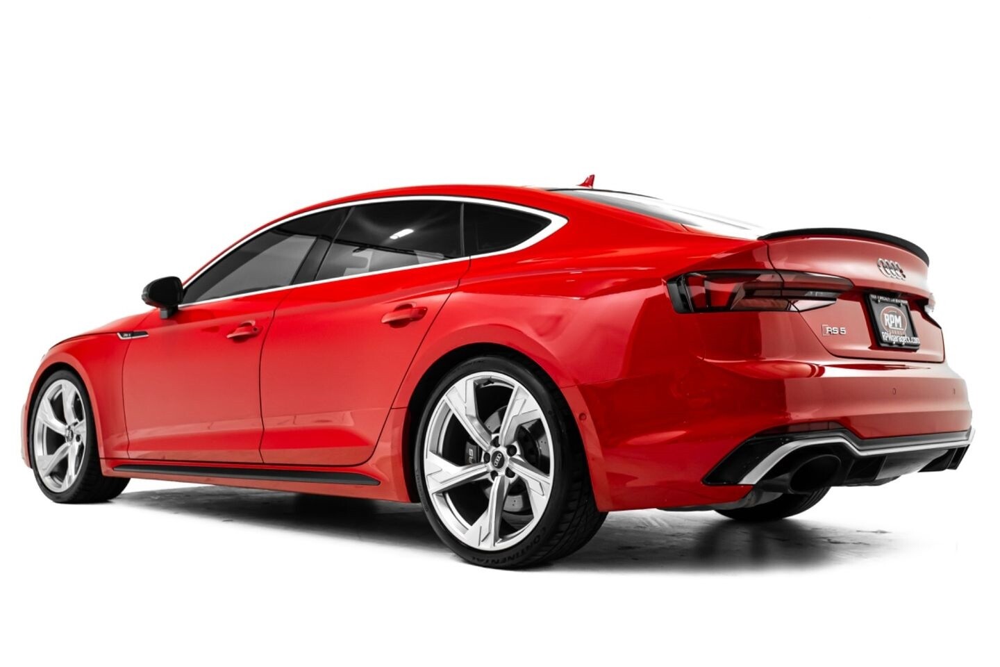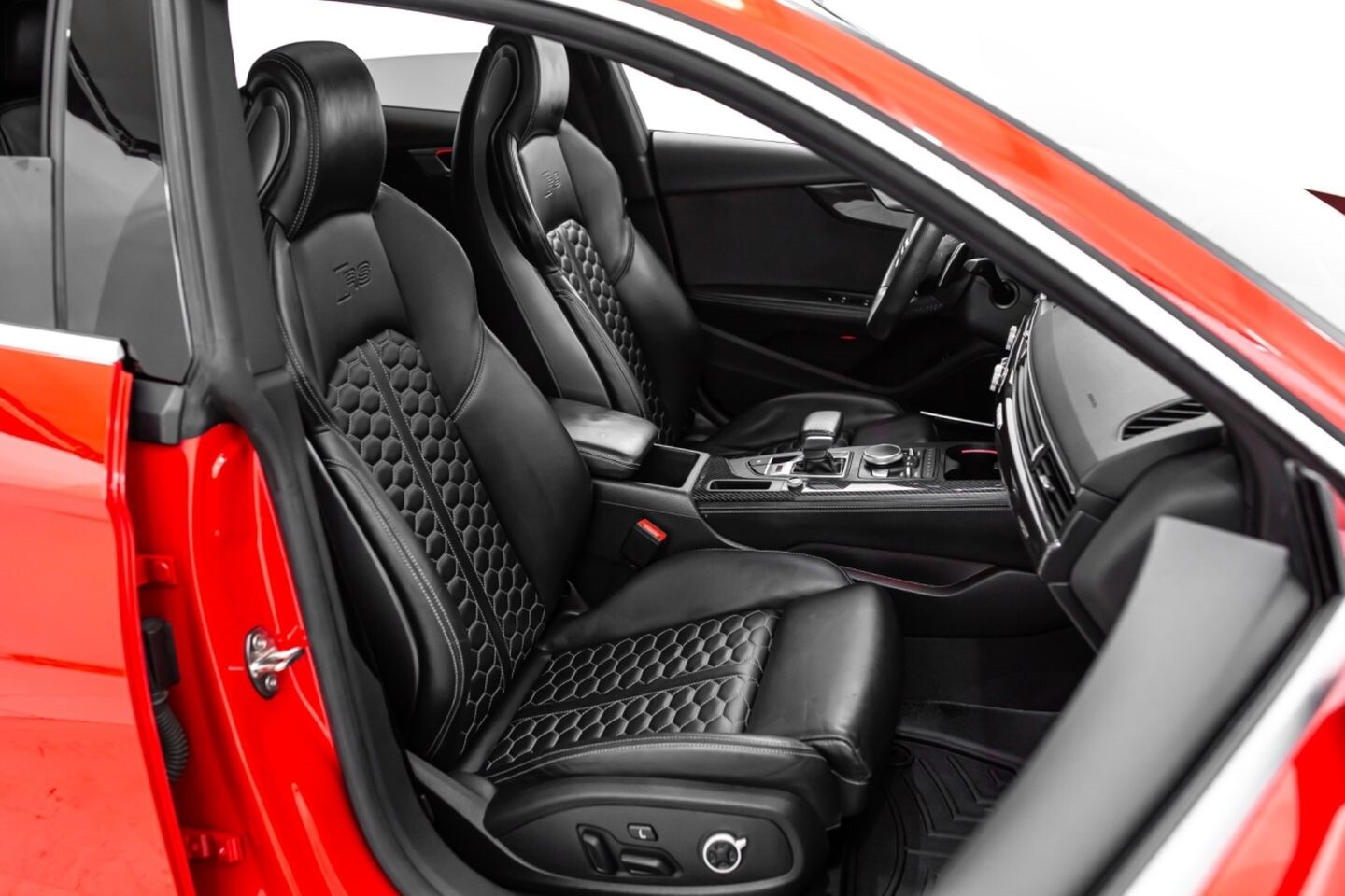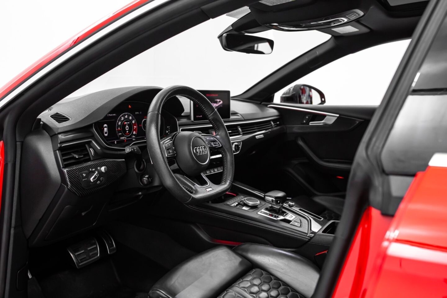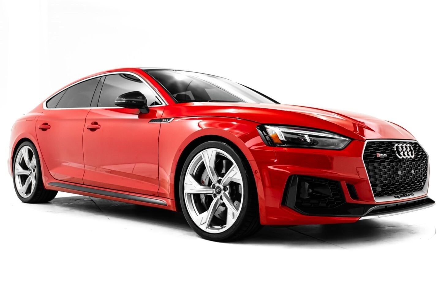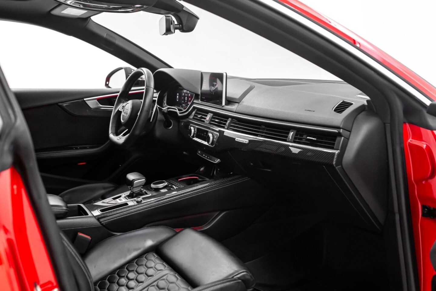 This 2019 Audi RS5 Sportback is a sporty sedan that provides a seamless blend of performance and luxury. Under the hood is a twin-turbocharged 2.9-liter V6 engine that produces 444 horsepower and 443 lb-ft of torque, all of which is sent through a eight-speed automatic transmission to all four wheels. This well-proportioned vehicle comes equipped with 20" OEM Audi wheels and is finished in Misano Red, a rare color that is sure to turn heads. The exterior of this Audi has been made even more aggressive with the addition of several carbon fiber pieces, which include a carbon fiber ducktail lip spoiler, carbon fiber mirror caps, carbon fiber front aero, and carbon fiber side skirt trim, tinted windows. In the interior, this RS5 offers "RS"-embossed heated leather bucket seats, a digital gauge cluster with multiple displays, selectable drive modes, multi-zone A/C, a heads-up display, carbon fiber interior trim, a flat-bottomed leather "RS" steering wheel, and an infotainment system with Bluetooth, navigation, apps, phone connectivity, AM/FM radio, AUX, a 360-degree camera, a backup camera, and a front-facing camera, truly making this car the complete package.