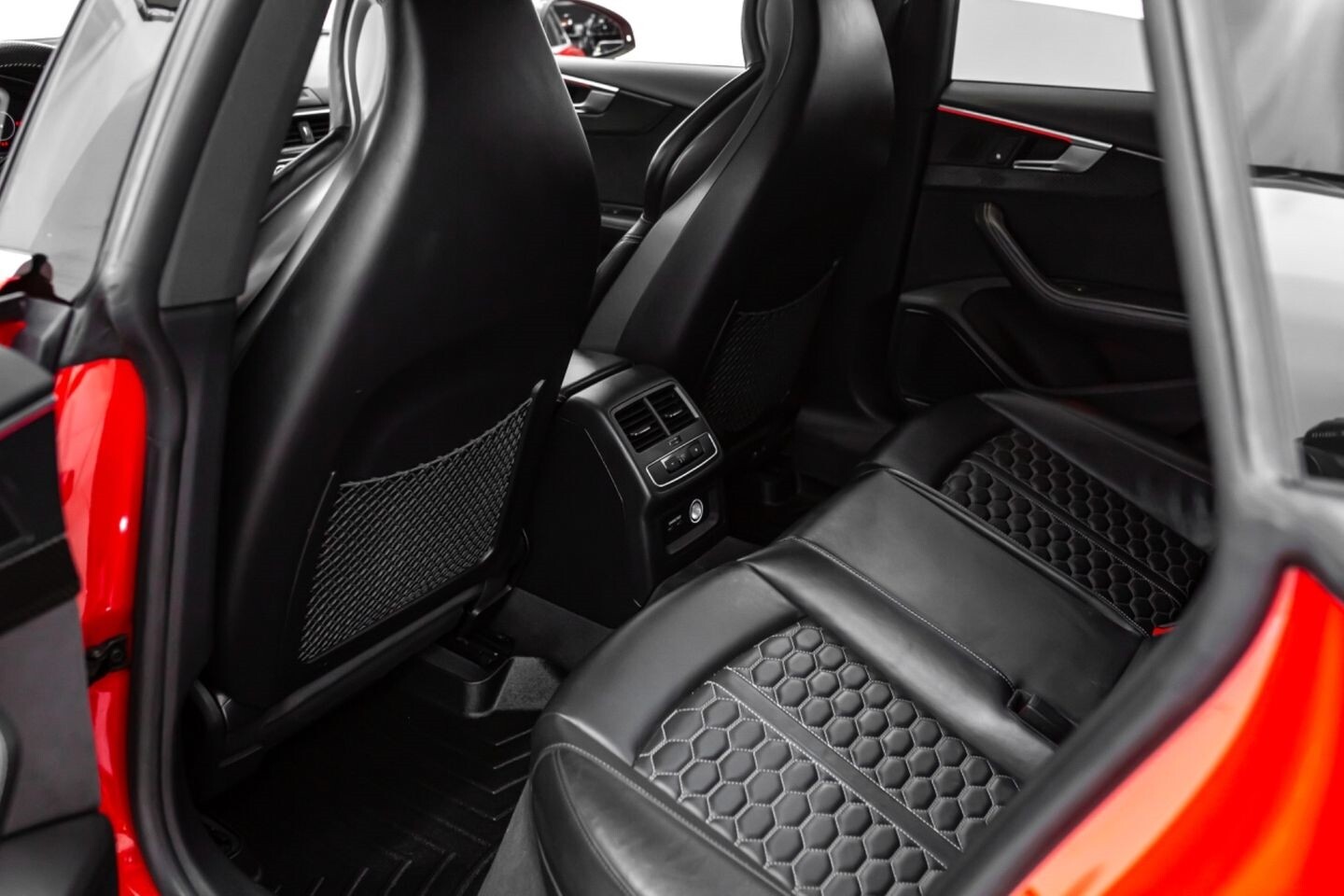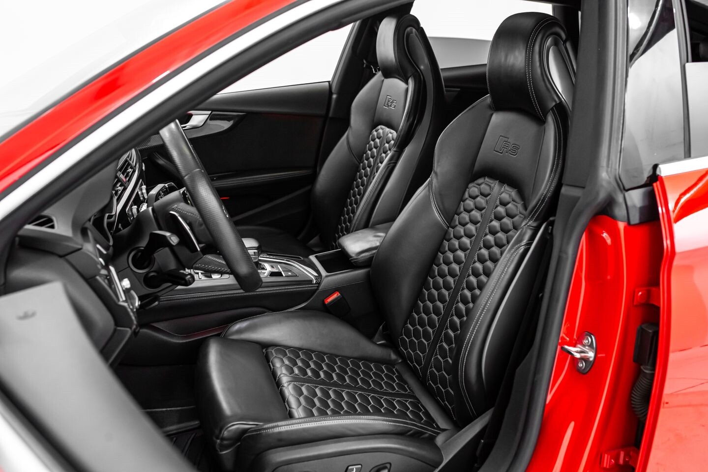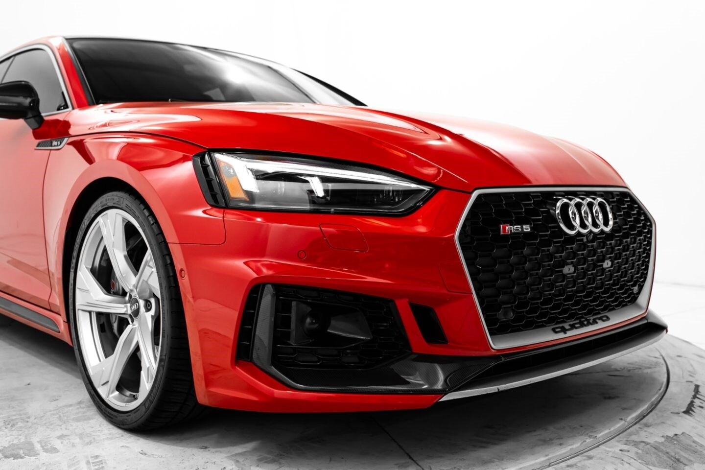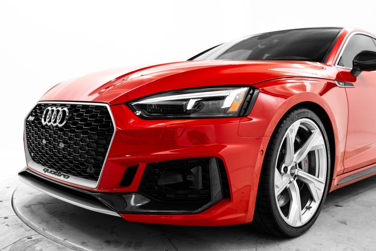 This 2019 Audi RS5 Sportback is a sporty sedan that provides a seamless blend of performance and luxury. Under the hood is a twin-turbocharged 2.9-liter V6 engine that produces 444 horsepower and 443 lb-ft of torque, all of which is sent through a eight-speed automatic transmission to all four wheels. This well-proportioned vehicle comes equipped with 20" OEM Audi wheels and is finished in Misano Red, a rare color that is sure to turn heads. The exterior of this Audi has been made even more aggressive with the addition of several carbon fiber pieces, which include a carbon fiber ducktail lip spoiler, carbon fiber mirror caps, carbon fiber front aero, and carbon fiber side skirt trim, tinted windows. In the interior, this RS5 offers "RS"-embossed heated leather bucket seats, a digital gauge cluster with multiple displays, selectable drive modes, multi-zone A/C, a heads-up display, carbon fiber interior trim, a flat-bottomed leather "RS" steering wheel, and an infotainment system with Bluetooth, navigation, apps, phone connectivity, AM/FM radio, AUX, a 360-degree camera, a backup camera, and a front-facing camera, truly making this car the complete package.
