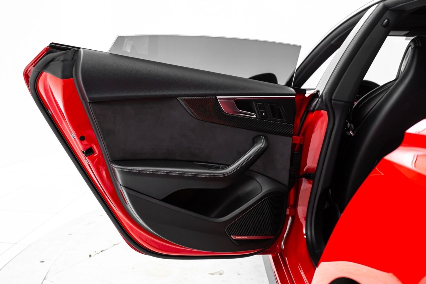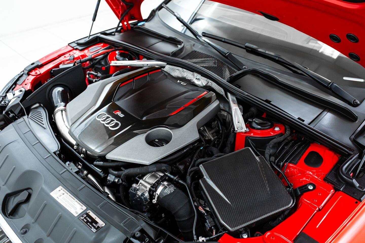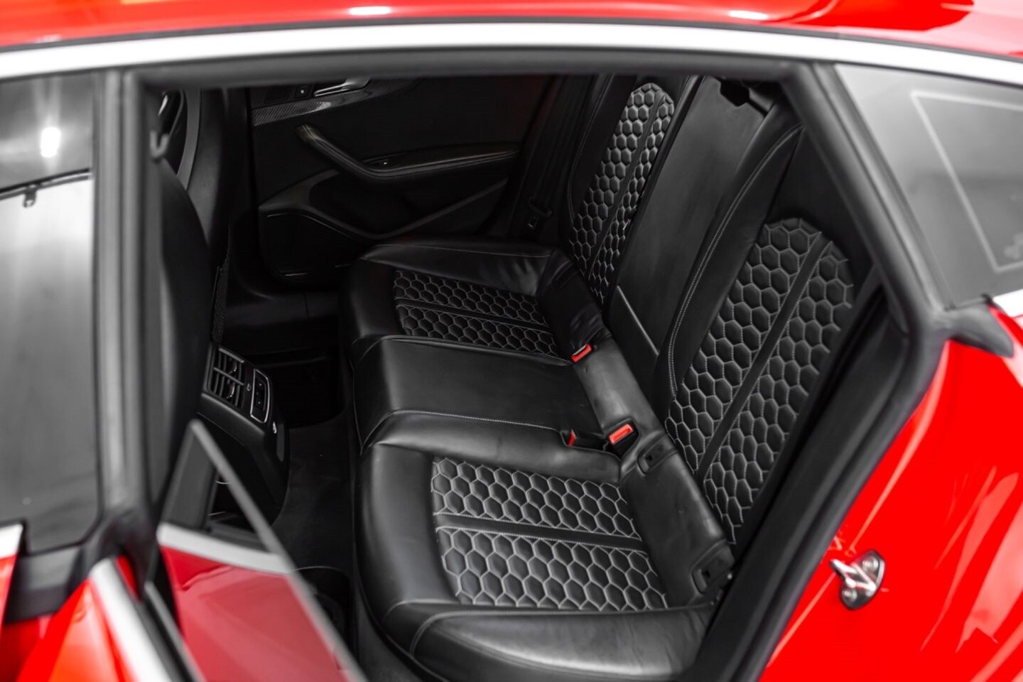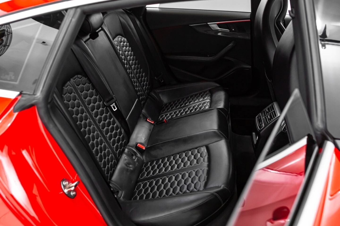This 2019 Audi RS5 Sportback is a sporty sedan that provides a seamless blend of performance and luxury. Under the hood is a twin-turbocharged 2.9-liter V6 engine that produces 444 horsepower and 443 lb-ft of torque, all of which is sent through a eight-speed automatic transmission to all four wheels. This well-proportioned vehicle comes equipped with 20" OEM Audi wheels and is finished in Misano Red, a rare color that is sure to turn heads. The exterior of this Audi has been made even more aggressive with the addition of several carbon fiber pieces, which include a carbon fiber ducktail lip spoiler, carbon fiber mirror caps, carbon fiber front aero, and carbon fiber side skirt trim, tinted windows. In the interior, this RS5 offers "RS"-embossed heated leather bucket seats, a digital gauge cluster with multiple displays, selectable drive modes, multi-zone A/C, a heads-up display, carbon fiber interior trim, a flat-bottomed leather "RS" steering wheel, and an infotainment system with Bluetooth, navigation, apps, phone connectivity, AM/FM radio, AUX, a 360-degree camera, a backup camera, and a front-facing camera, truly making this car the complete package.