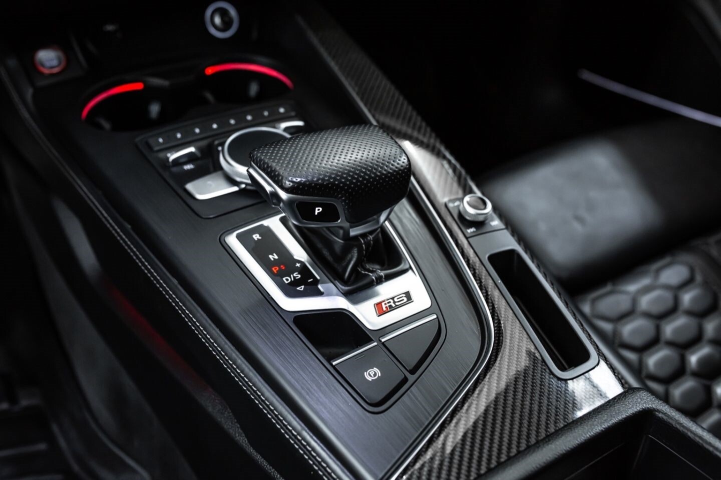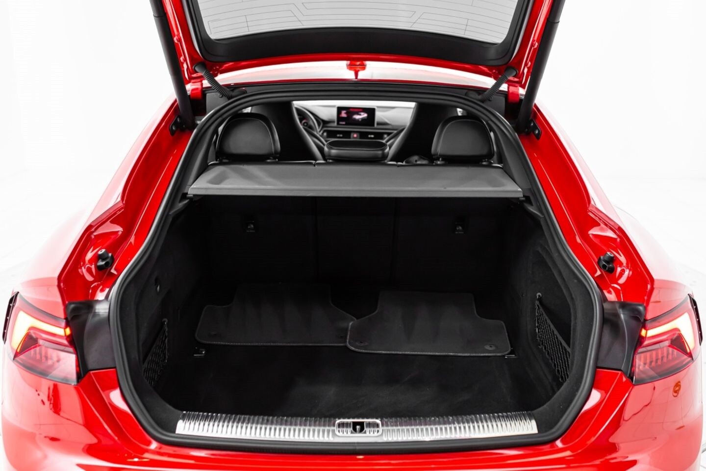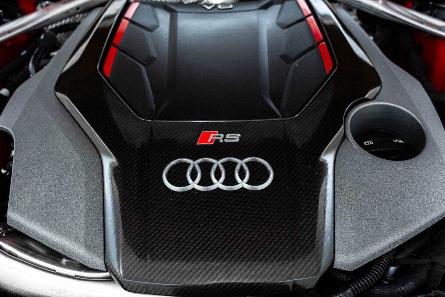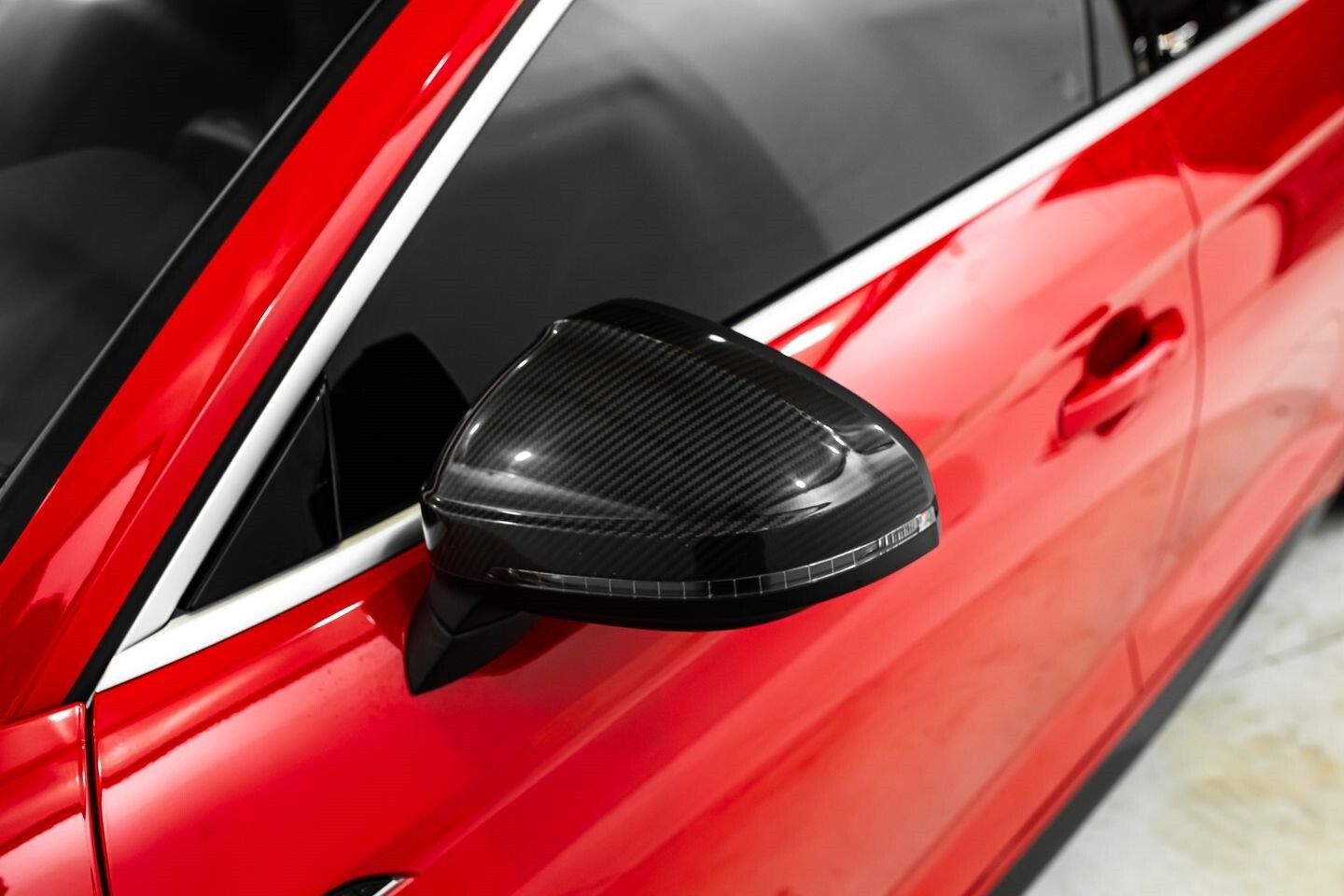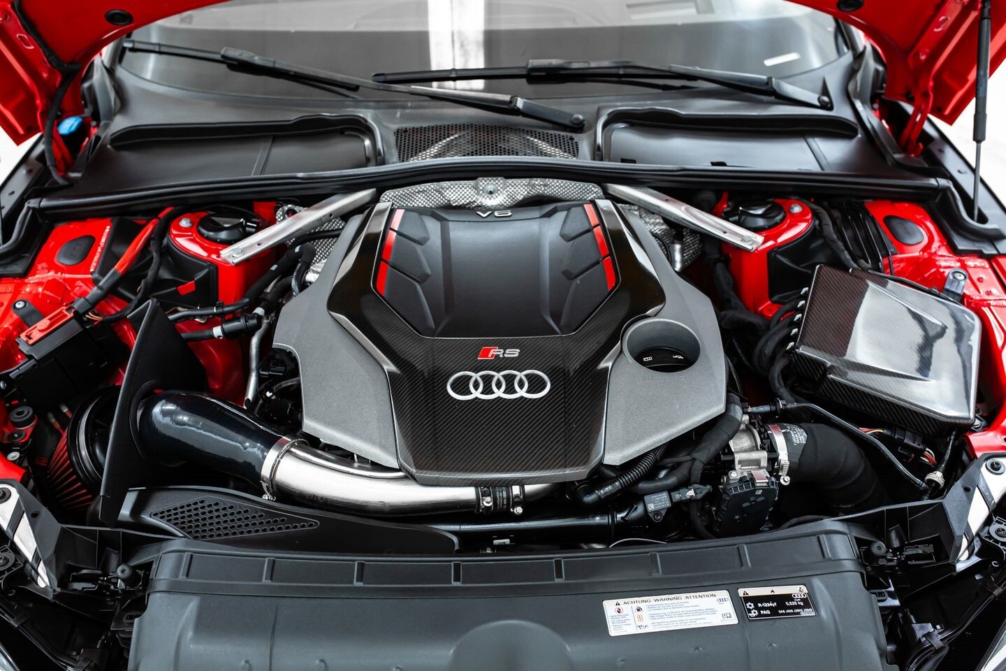 This 2019 Audi RS5 Sportback is a sporty sedan that provides a seamless blend of performance and luxury. Under the hood is a twin-turbocharged 2.9-liter V6 engine that produces 444 horsepower and 443 lb-ft of torque, all of which is sent through a eight-speed automatic transmission to all four wheels. This well-proportioned vehicle comes equipped with 20" OEM Audi wheels and is finished in Misano Red, a rare color that is sure to turn heads. The exterior of this Audi has been made even more aggressive with the addition of several carbon fiber pieces, which include a carbon fiber ducktail lip spoiler, carbon fiber mirror caps, carbon fiber front aero, and carbon fiber side skirt trim, tinted windows. In the interior, this RS5 offers "RS"-embossed heated leather bucket seats, a digital gauge cluster with multiple displays, selectable drive modes, multi-zone A/C, a heads-up display, carbon fiber interior trim, a flat-bottomed leather "RS" steering wheel, and an infotainment system with Bluetooth, navigation, apps, phone connectivity, AM/FM radio, AUX, a 360-degree camera, a backup camera, and a front-facing camera, truly making this car the complete package.