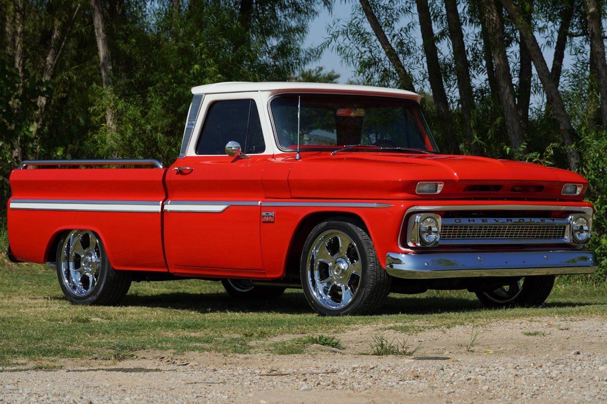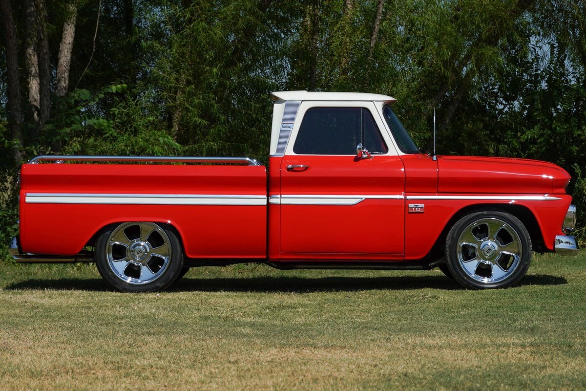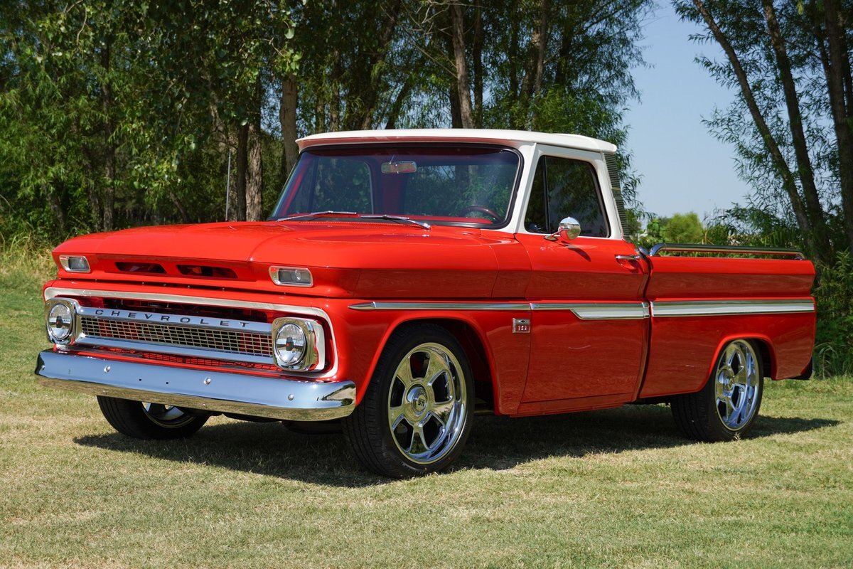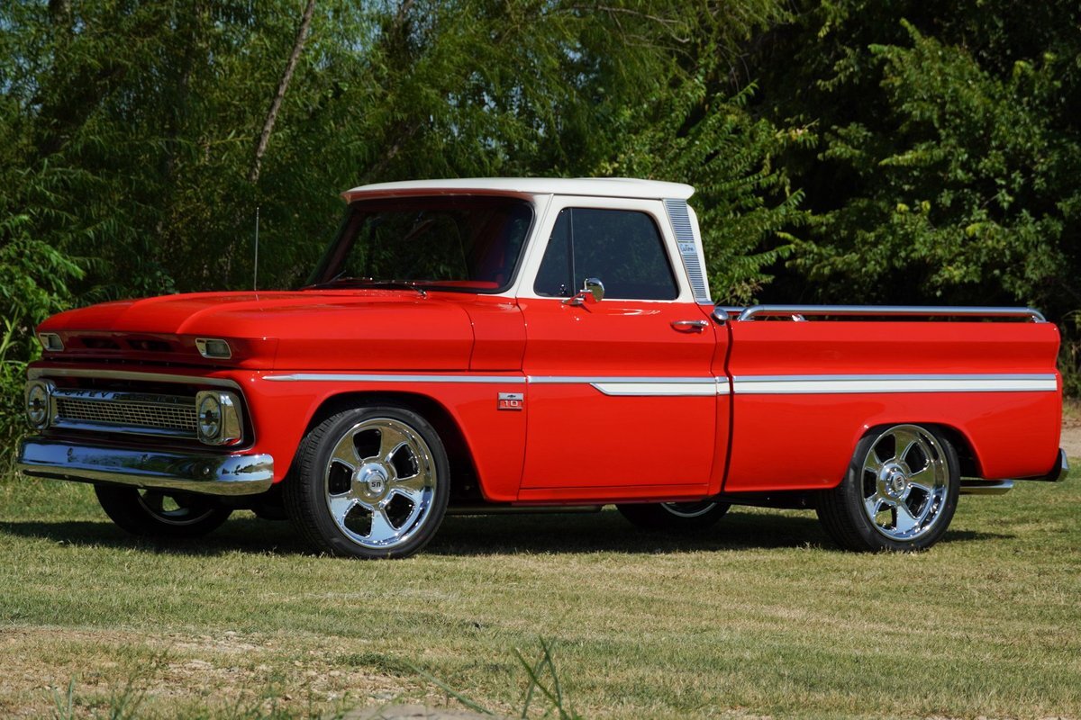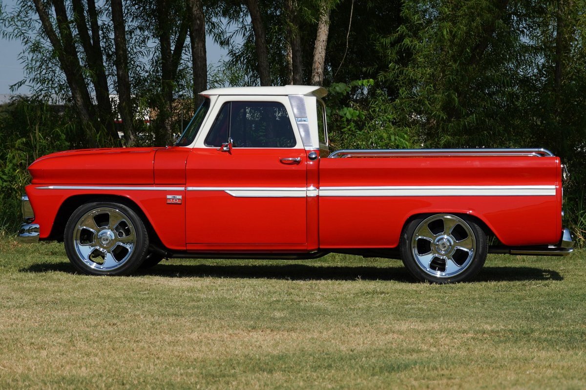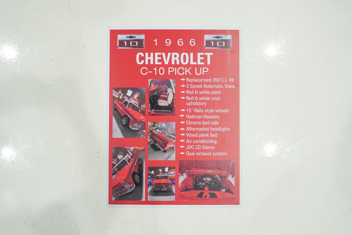 Truck can be seen on Hotrodcollection .com We welcome trade-ins Frame Off Restoration 350 CID Engine New Glass and Trim Detailed Frame and Suspension Oak Bed FloorBig Back Window Truck Vintage Heat and AirPower Steering Power Front Disc Brakes Tilt Wheel Mega Omega Kustom Gauges All New Black Interior New Bumpers and Grille New Wiring Dual Exhaust Custom Chrome US Mags Rears 275-45-20s Front 245-45-20 This 1966 Chevrolet C10 is a short-bed pickup that was refurbished under prior ownership around 2021, including the installation of a 350ci V8 and a three-speed TH400 automatic transmission. The truck has been repainted red with a white roof over a matching interior, and additional equipment includes, power-assisted drum brakes, a wood bed floor, chrome bed rails, Hedman headers, a dual exhaust system, and air conditioning. A wood plank bed floor has been added, and additional equipment includes aftermarket headlights, chrome bed rails, a retractable antenna, and dual side mirrors. A JVC CD stereo is housed in the stock location, and an under-dash air conditioning system has been added. The fuel tank is located behind the seat. The wood-rimmed three-spoke steering wheel frames a polished bezel housing Omega Kustom gauges, including a 140-mph speedometer, an 8k-rpm tachometer, and readouts for fuel level, coolant temperature, oil pressure, and voltage. The five-digit odometer shows 1,400 miles, and total mileage is unknown. Power is routed to the rear wheels through a TH400 three-speed automatic transmission
