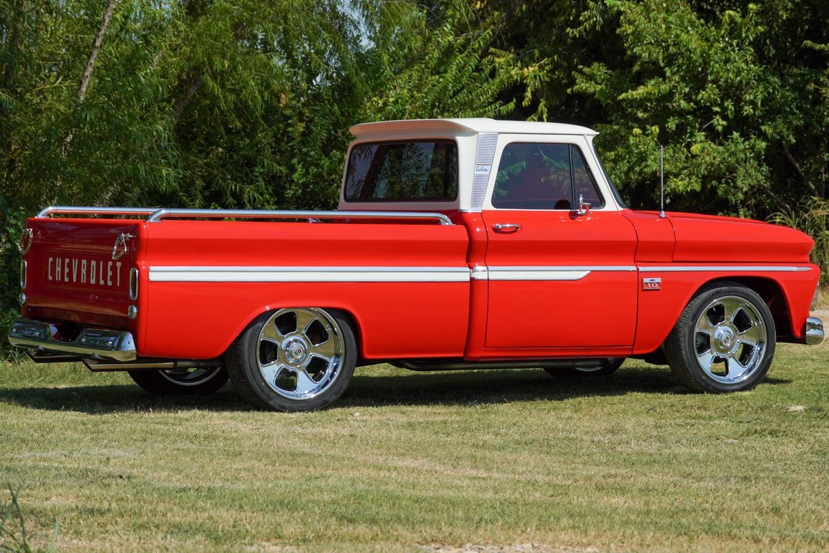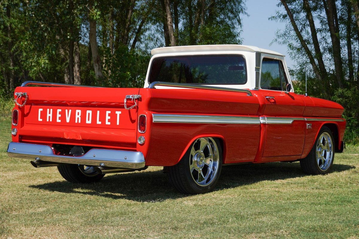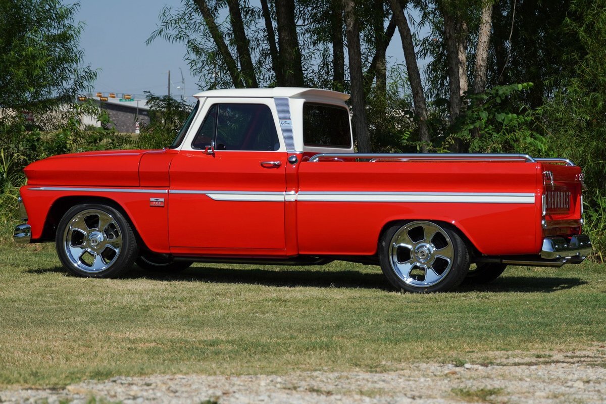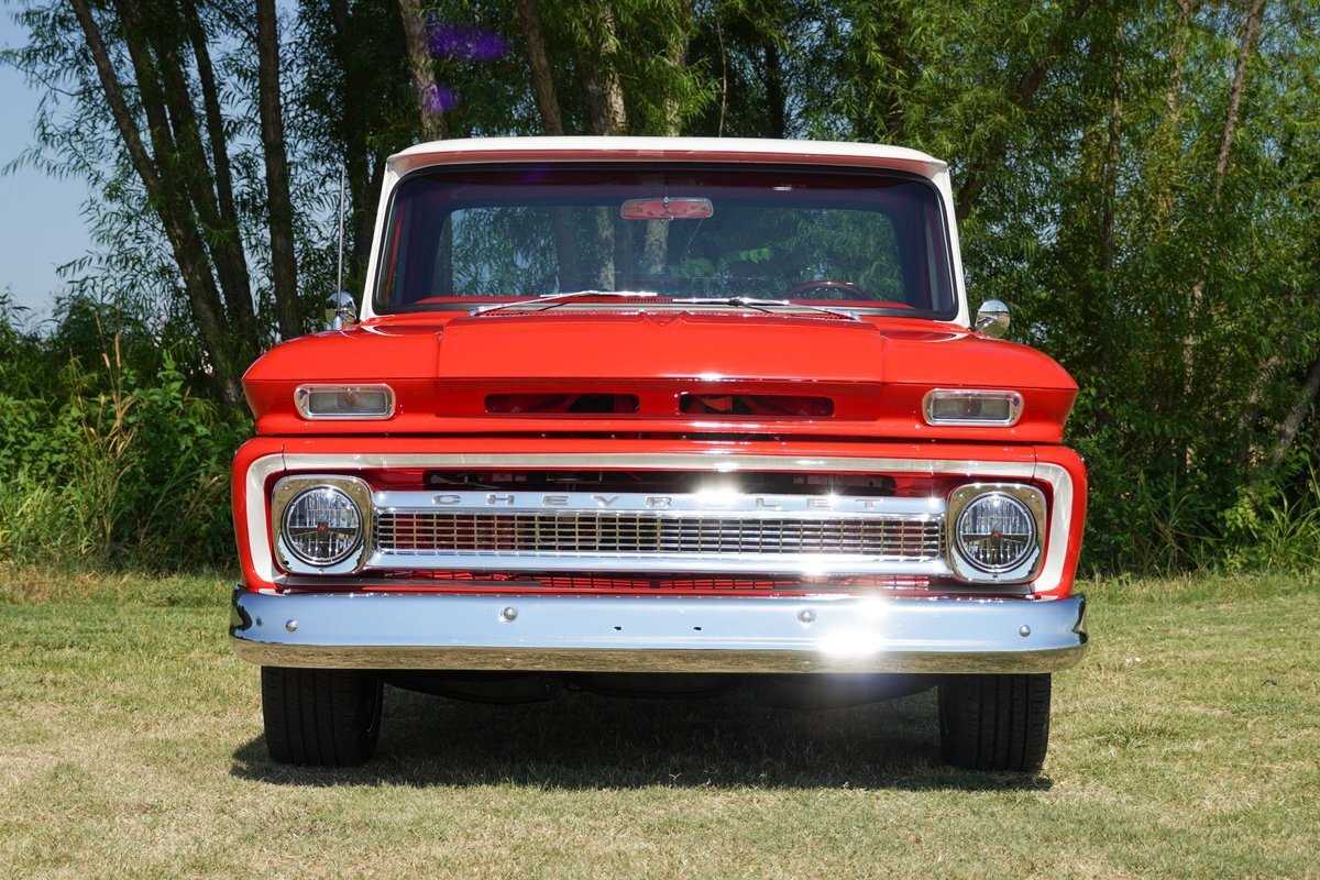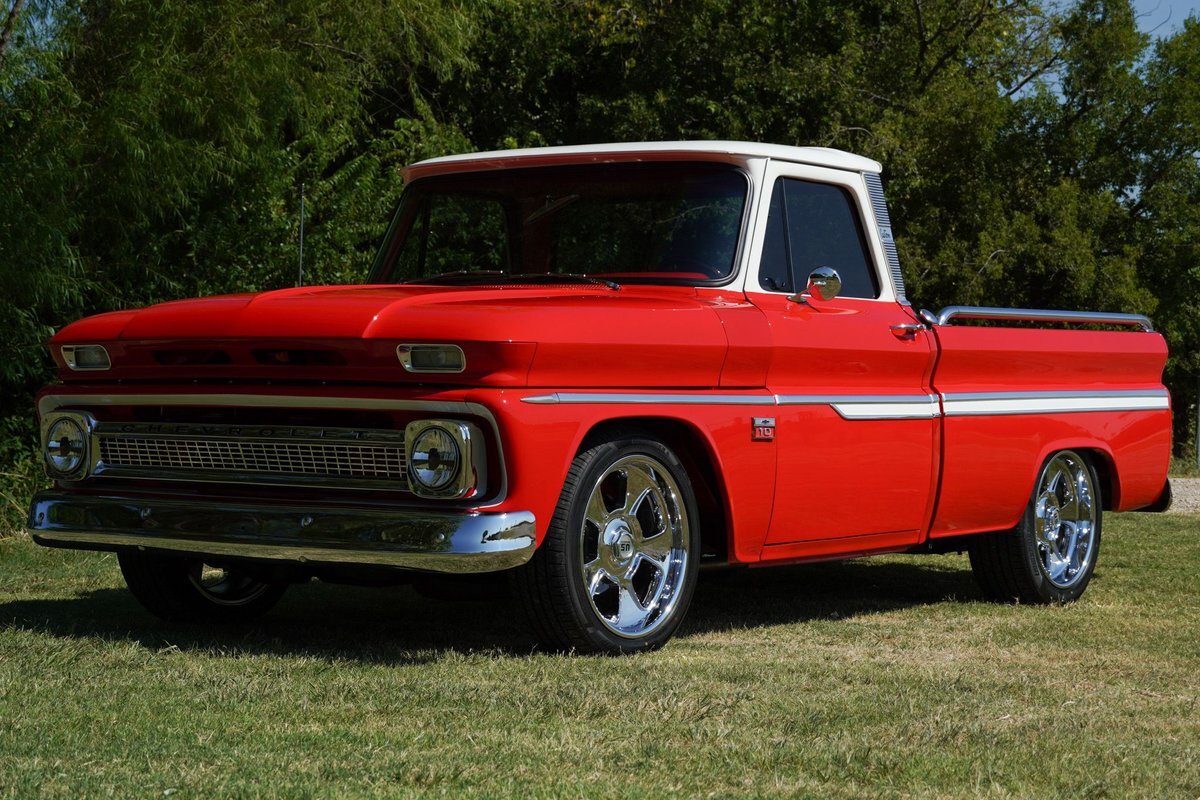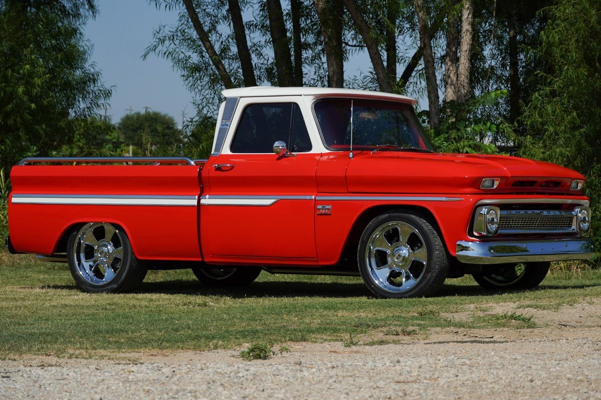 Truck can be seen on Hotrodcollection .com We welcome trade-ins Frame Off Restoration 350 CID Engine New Glass and Trim Detailed Frame and Suspension Oak Bed FloorBig Back Window Truck Vintage Heat and AirPower Steering Power Front Disc Brakes Tilt Wheel Mega Omega Kustom Gauges All New Black Interior New Bumpers and Grille New Wiring Dual Exhaust Custom Chrome US Mags Rears 275-45-20s Front 245-45-20 This 1966 Chevrolet C10 is a short-bed pickup that was refurbished under prior ownership around 2021, including the installation of a 350ci V8 and a three-speed TH400 automatic transmission. The truck has been repainted red with a white roof over a matching interior, and additional equipment includes, power-assisted drum brakes, a wood bed floor, chrome bed rails, Hedman headers, a dual exhaust system, and air conditioning. A wood plank bed floor has been added, and additional equipment includes aftermarket headlights, chrome bed rails, a retractable antenna, and dual side mirrors. A JVC CD stereo is housed in the stock location, and an under-dash air conditioning system has been added. The fuel tank is located behind the seat. The wood-rimmed three-spoke steering wheel frames a polished bezel housing Omega Kustom gauges, including a 140-mph speedometer, an 8k-rpm tachometer, and readouts for fuel level, coolant temperature, oil pressure, and voltage. The five-digit odometer shows 1,400 miles, and total mileage is unknown. Power is routed to the rear wheels through a TH400 three-speed automatic transmission
