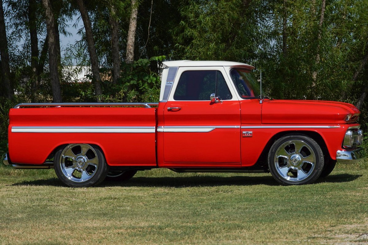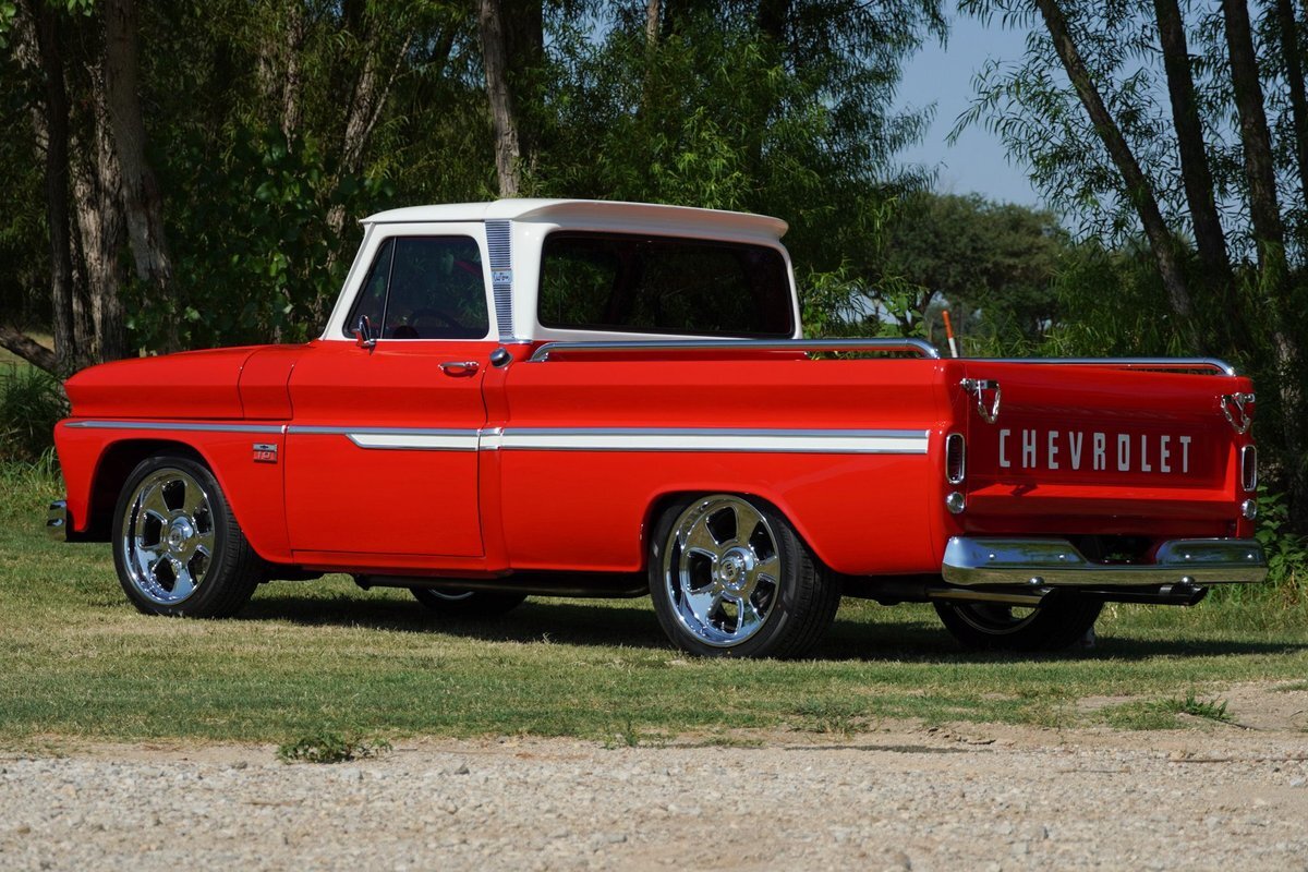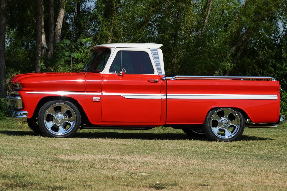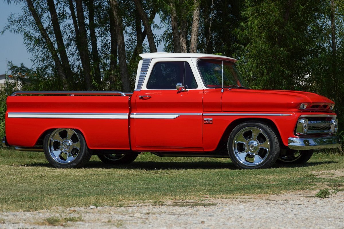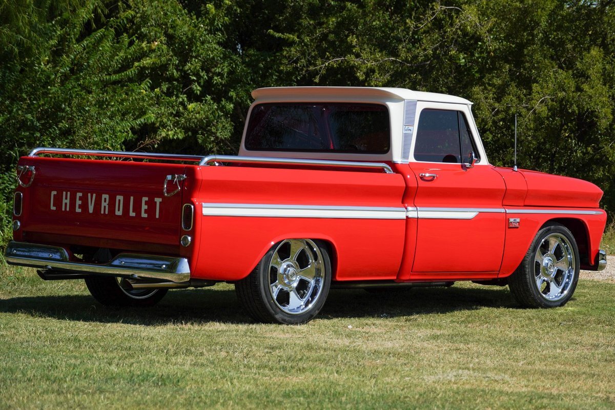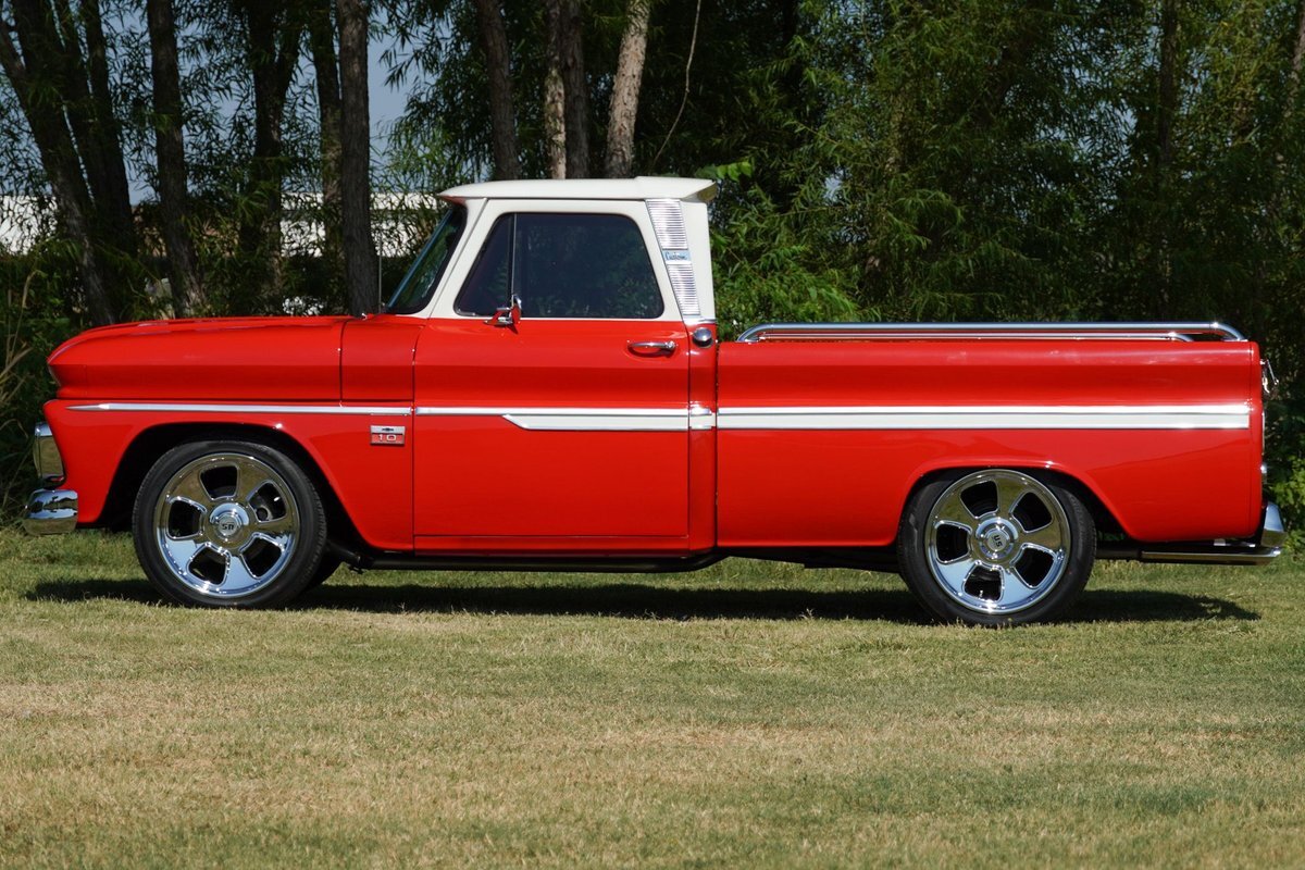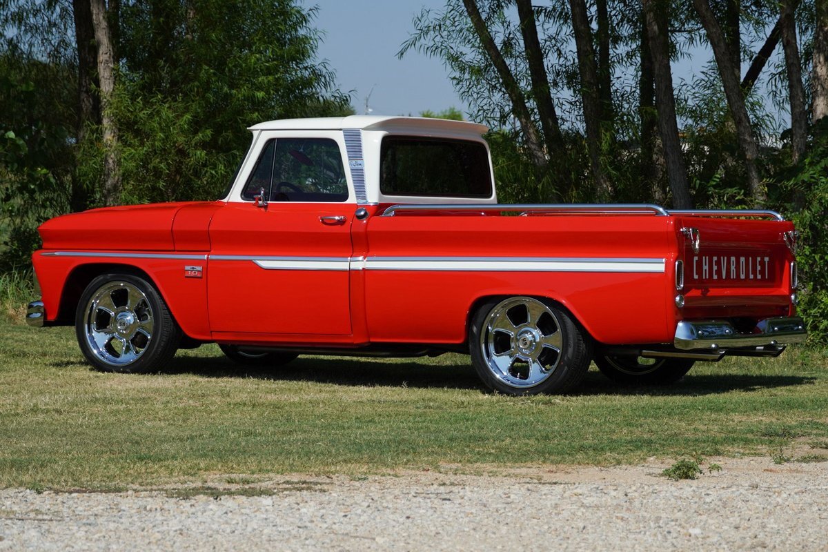 Truck can be seen on Hotrodcollection .com We welcome trade-ins Frame Off Restoration 350 CID Engine New Glass and Trim Detailed Frame and Suspension Oak Bed FloorBig Back Window Truck Vintage Heat and AirPower Steering Power Front Disc Brakes Tilt Wheel Mega Omega Kustom Gauges All New Black Interior New Bumpers and Grille New Wiring Dual Exhaust Custom Chrome US Mags Rears 275-45-20s Front 245-45-20 This 1966 Chevrolet C10 is a short-bed pickup that was refurbished under prior ownership around 2021, including the installation of a 350ci V8 and a three-speed TH400 automatic transmission. The truck has been repainted red with a white roof over a matching interior, and additional equipment includes, power-assisted drum brakes, a wood bed floor, chrome bed rails, Hedman headers, a dual exhaust system, and air conditioning. A wood plank bed floor has been added, and additional equipment includes aftermarket headlights, chrome bed rails, a retractable antenna, and dual side mirrors. A JVC CD stereo is housed in the stock location, and an under-dash air conditioning system has been added. The fuel tank is located behind the seat. The wood-rimmed three-spoke steering wheel frames a polished bezel housing Omega Kustom gauges, including a 140-mph speedometer, an 8k-rpm tachometer, and readouts for fuel level, coolant temperature, oil pressure, and voltage. The five-digit odometer shows 1,400 miles, and total mileage is unknown. Power is routed to the rear wheels through a TH400 three-speed automatic transmission