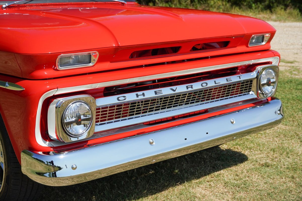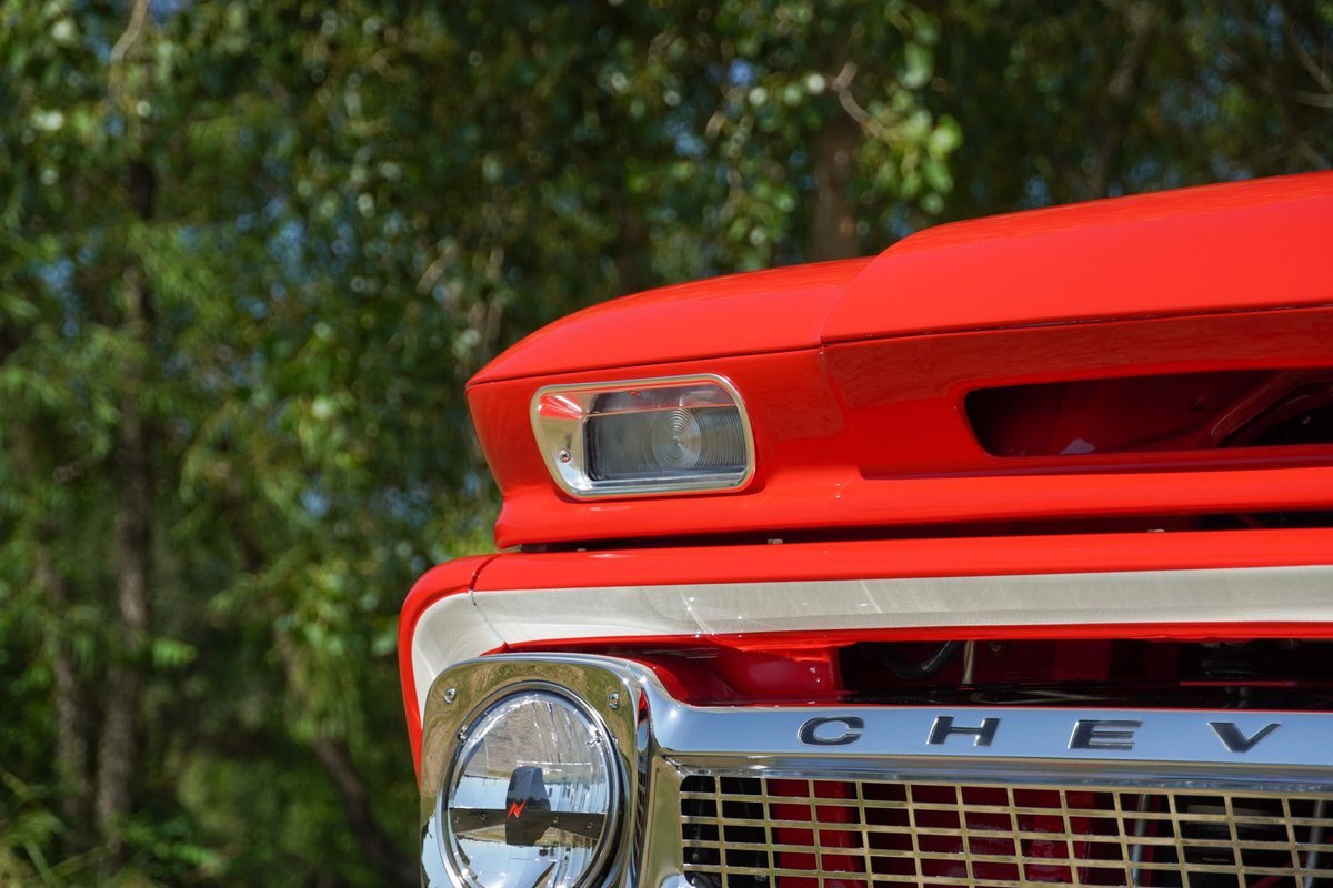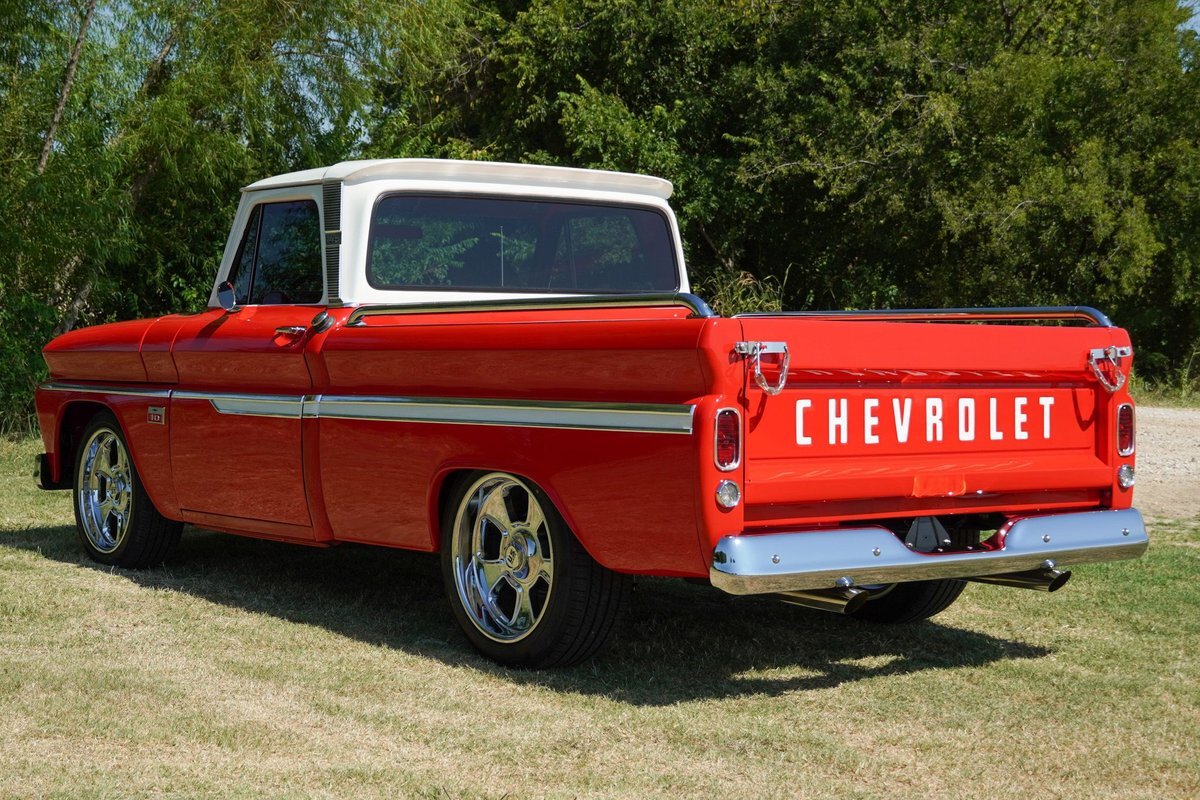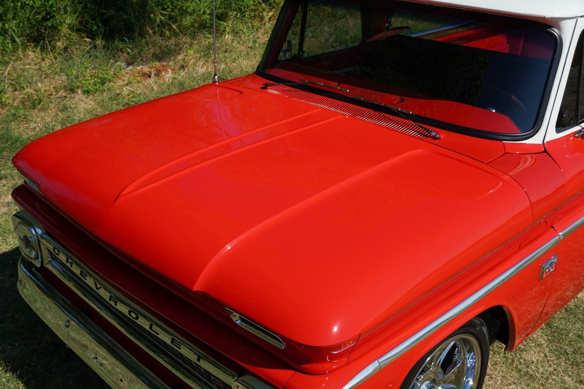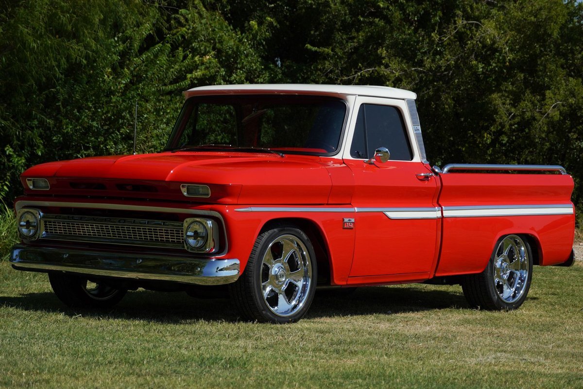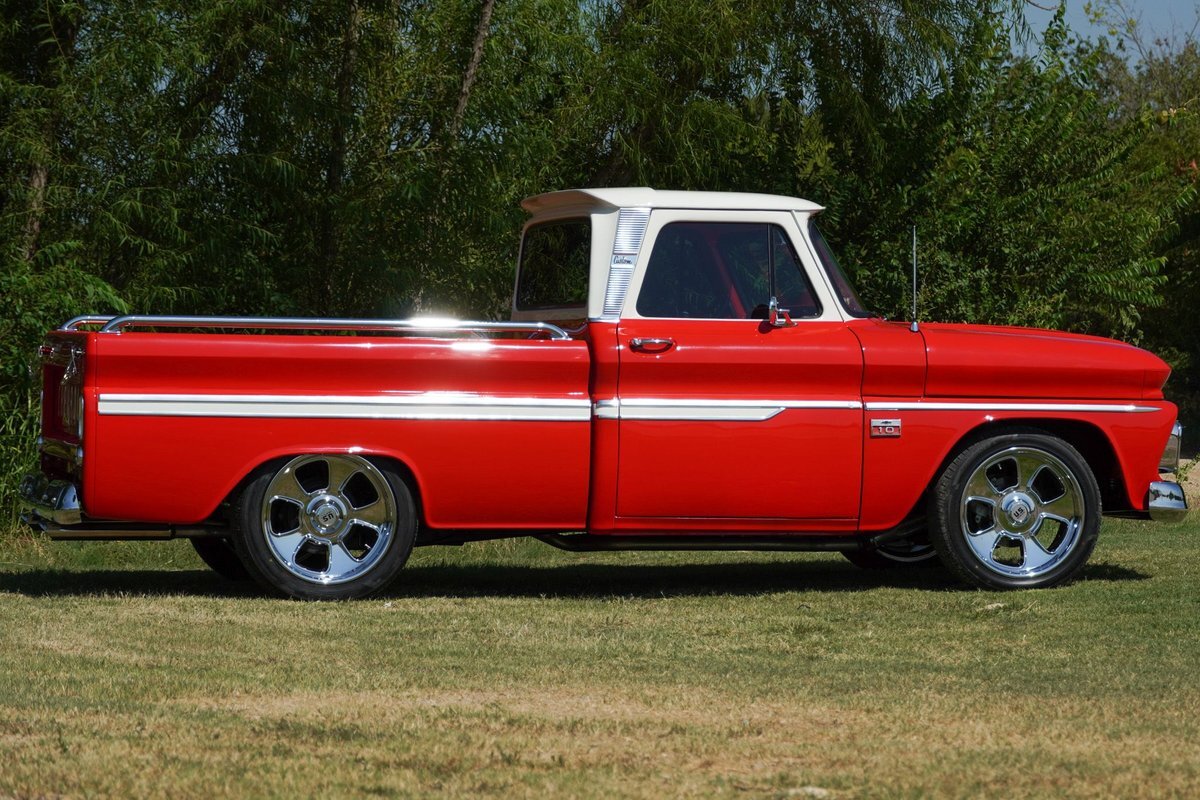 Truck can be seen on Hotrodcollection .com We welcome trade-ins Frame Off Restoration 350 CID Engine New Glass and Trim Detailed Frame and Suspension Oak Bed FloorBig Back Window Truck Vintage Heat and AirPower Steering Power Front Disc Brakes Tilt Wheel Mega Omega Kustom Gauges All New Black Interior New Bumpers and Grille New Wiring Dual Exhaust Custom Chrome US Mags Rears 275-45-20s Front 245-45-20 This 1966 Chevrolet C10 is a short-bed pickup that was refurbished under prior ownership around 2021, including the installation of a 350ci V8 and a three-speed TH400 automatic transmission. The truck has been repainted red with a white roof over a matching interior, and additional equipment includes, power-assisted drum brakes, a wood bed floor, chrome bed rails, Hedman headers, a dual exhaust system, and air conditioning. A wood plank bed floor has been added, and additional equipment includes aftermarket headlights, chrome bed rails, a retractable antenna, and dual side mirrors. A JVC CD stereo is housed in the stock location, and an under-dash air conditioning system has been added. The fuel tank is located behind the seat. The wood-rimmed three-spoke steering wheel frames a polished bezel housing Omega Kustom gauges, including a 140-mph speedometer, an 8k-rpm tachometer, and readouts for fuel level, coolant temperature, oil pressure, and voltage. The five-digit odometer shows 1,400 miles, and total mileage is unknown. Power is routed to the rear wheels through a TH400 three-speed automatic transmission