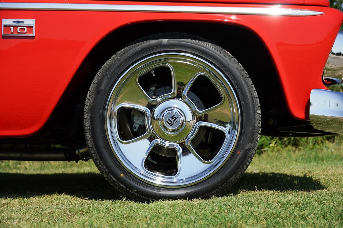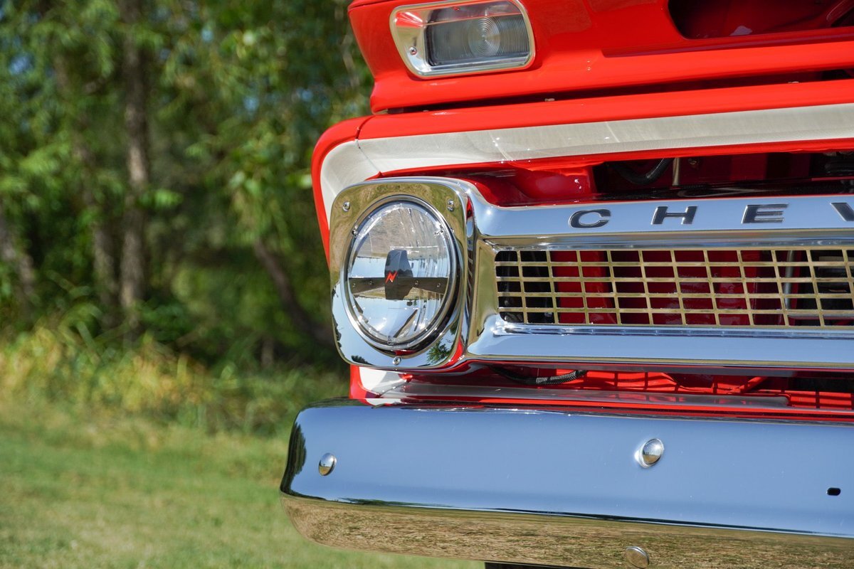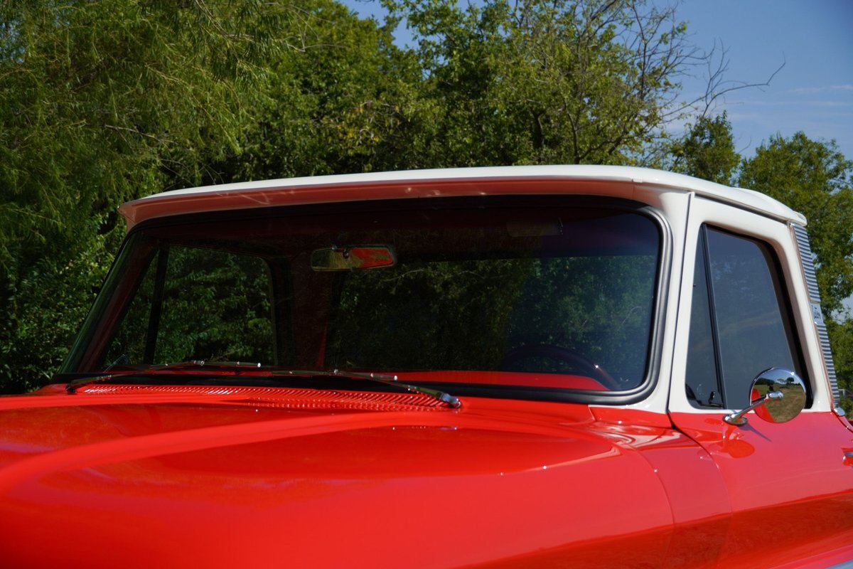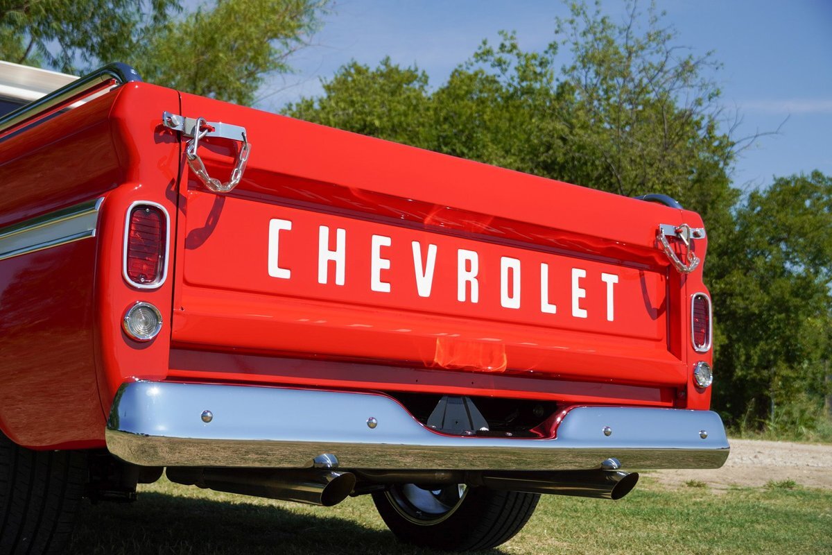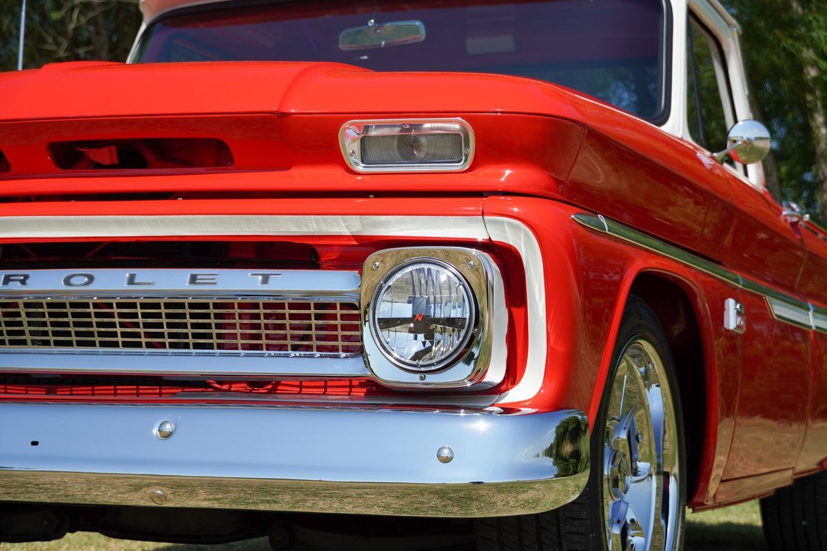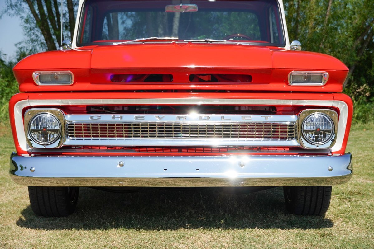 Truck can be seen on Hotrodcollection .com We welcome trade-ins Frame Off Restoration 350 CID Engine New Glass and Trim Detailed Frame and Suspension Oak Bed FloorBig Back Window Truck Vintage Heat and AirPower Steering Power Front Disc Brakes Tilt Wheel Mega Omega Kustom Gauges All New Black Interior New Bumpers and Grille New Wiring Dual Exhaust Custom Chrome US Mags Rears 275-45-20s Front 245-45-20 This 1966 Chevrolet C10 is a short-bed pickup that was refurbished under prior ownership around 2021, including the installation of a 350ci V8 and a three-speed TH400 automatic transmission. The truck has been repainted red with a white roof over a matching interior, and additional equipment includes, power-assisted drum brakes, a wood bed floor, chrome bed rails, Hedman headers, a dual exhaust system, and air conditioning. A wood plank bed floor has been added, and additional equipment includes aftermarket headlights, chrome bed rails, a retractable antenna, and dual side mirrors. A JVC CD stereo is housed in the stock location, and an under-dash air conditioning system has been added. The fuel tank is located behind the seat. The wood-rimmed three-spoke steering wheel frames a polished bezel housing Omega Kustom gauges, including a 140-mph speedometer, an 8k-rpm tachometer, and readouts for fuel level, coolant temperature, oil pressure, and voltage. The five-digit odometer shows 1,400 miles, and total mileage is unknown. Power is routed to the rear wheels through a TH400 three-speed automatic transmission