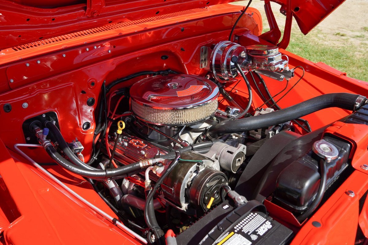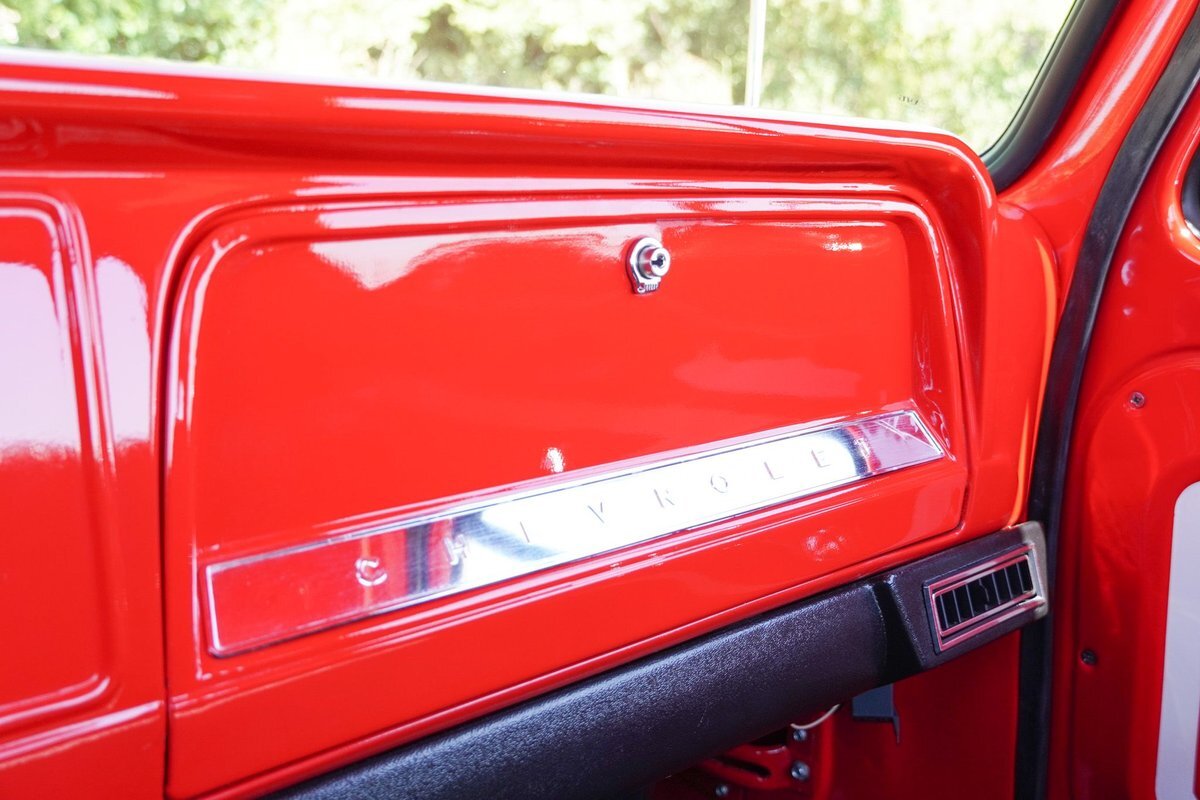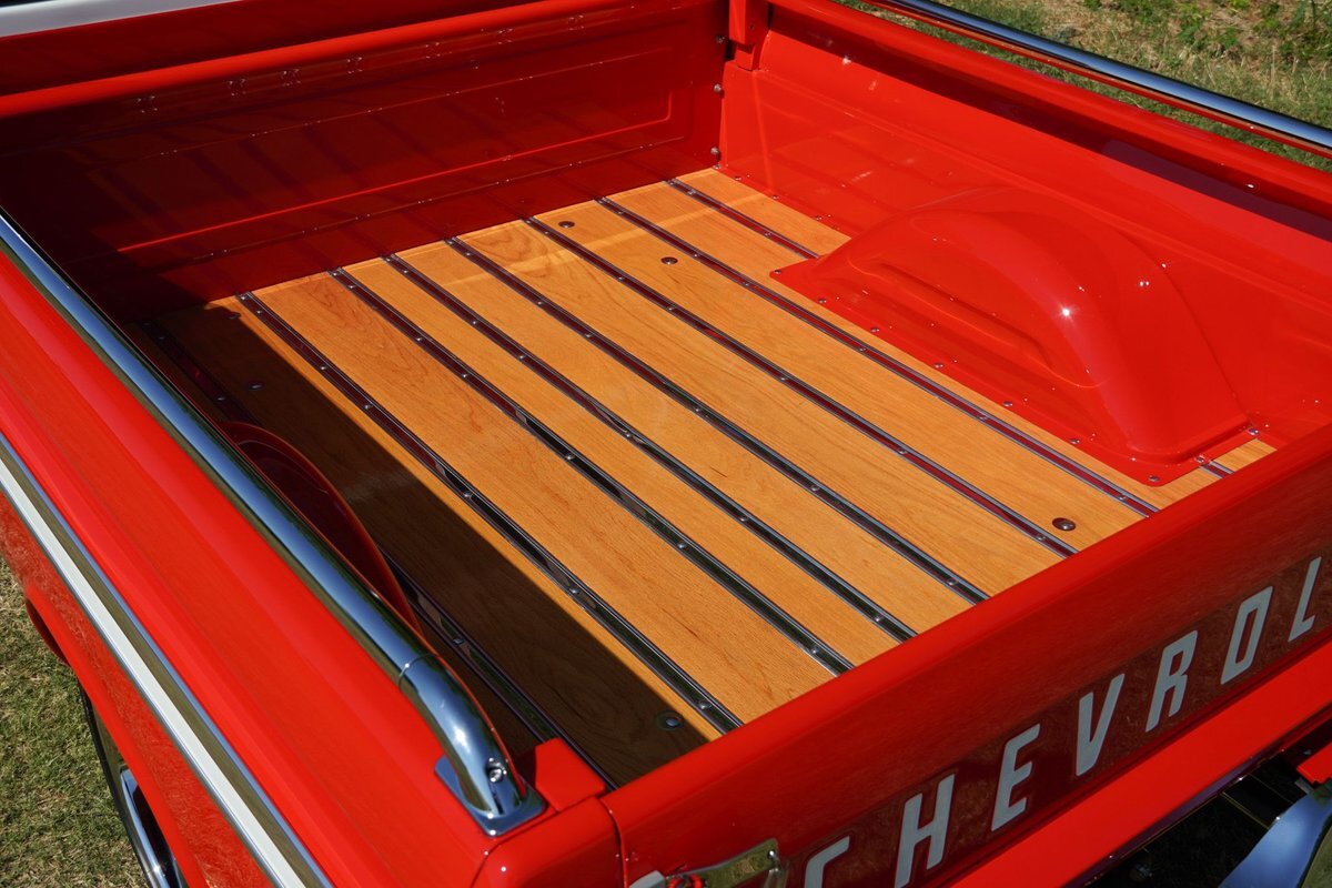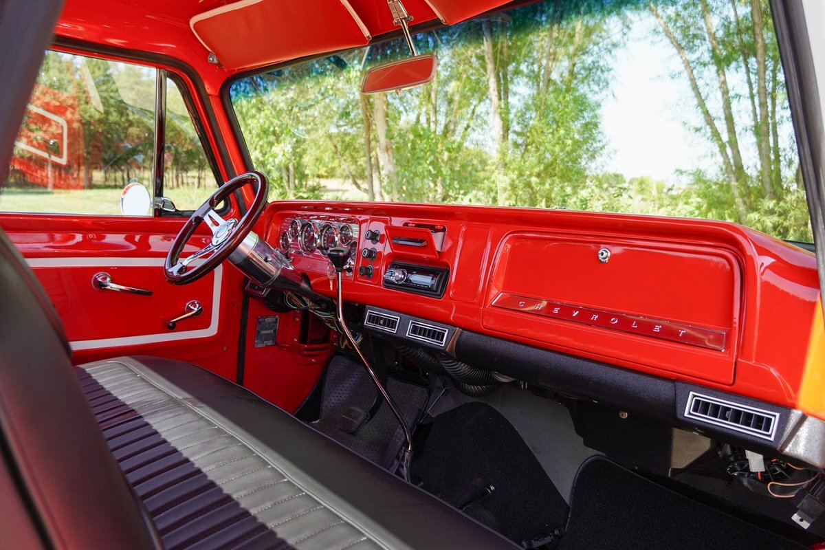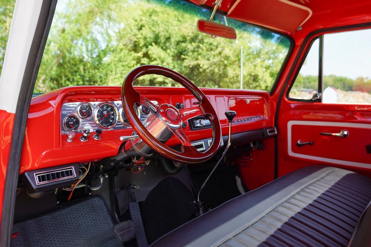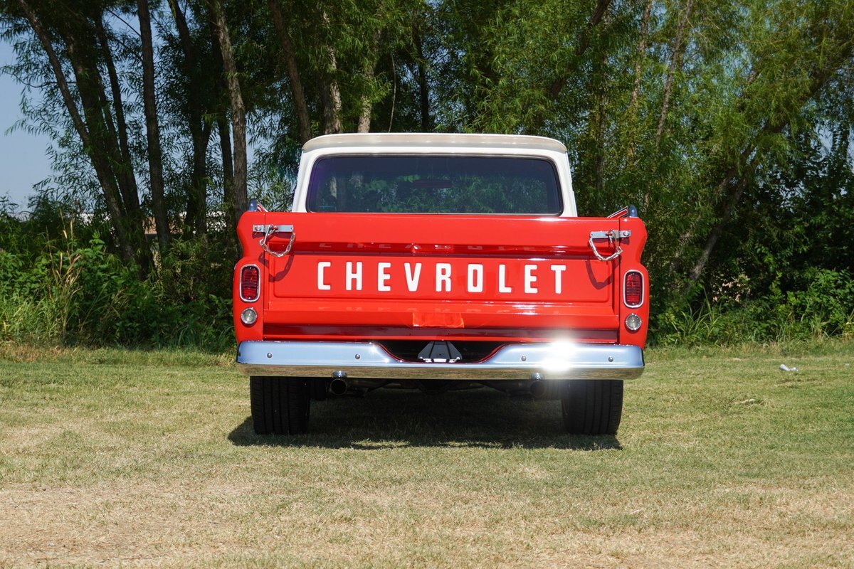 Truck can be seen on Hotrodcollection .com We welcome trade-ins Frame Off Restoration 350 CID Engine New Glass and Trim Detailed Frame and Suspension Oak Bed FloorBig Back Window Truck Vintage Heat and AirPower Steering Power Front Disc Brakes Tilt Wheel Mega Omega Kustom Gauges All New Black Interior New Bumpers and Grille New Wiring Dual Exhaust Custom Chrome US Mags Rears 275-45-20s Front 245-45-20 This 1966 Chevrolet C10 is a short-bed pickup that was refurbished under prior ownership around 2021, including the installation of a 350ci V8 and a three-speed TH400 automatic transmission. The truck has been repainted red with a white roof over a matching interior, and additional equipment includes, power-assisted drum brakes, a wood bed floor, chrome bed rails, Hedman headers, a dual exhaust system, and air conditioning. A wood plank bed floor has been added, and additional equipment includes aftermarket headlights, chrome bed rails, a retractable antenna, and dual side mirrors. A JVC CD stereo is housed in the stock location, and an under-dash air conditioning system has been added. The fuel tank is located behind the seat. The wood-rimmed three-spoke steering wheel frames a polished bezel housing Omega Kustom gauges, including a 140-mph speedometer, an 8k-rpm tachometer, and readouts for fuel level, coolant temperature, oil pressure, and voltage. The five-digit odometer shows 1,400 miles, and total mileage is unknown. Power is routed to the rear wheels through a TH400 three-speed automatic transmission