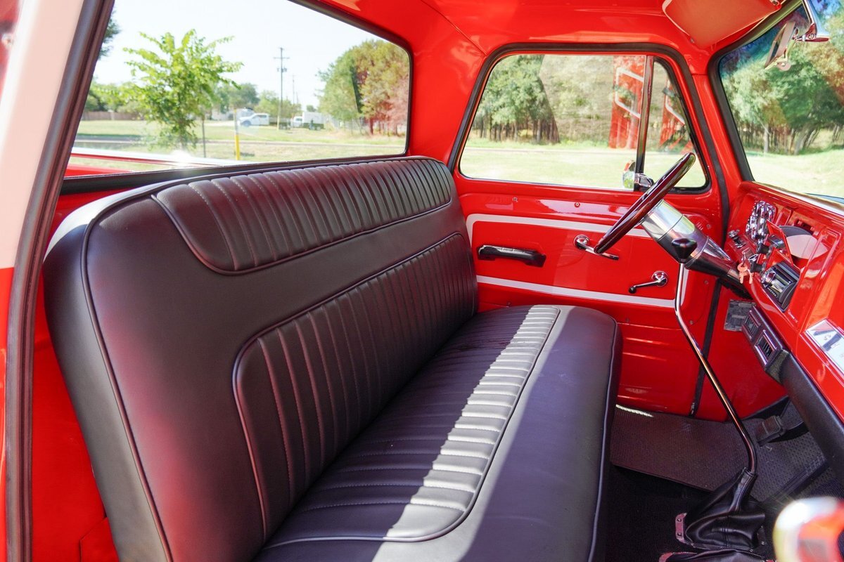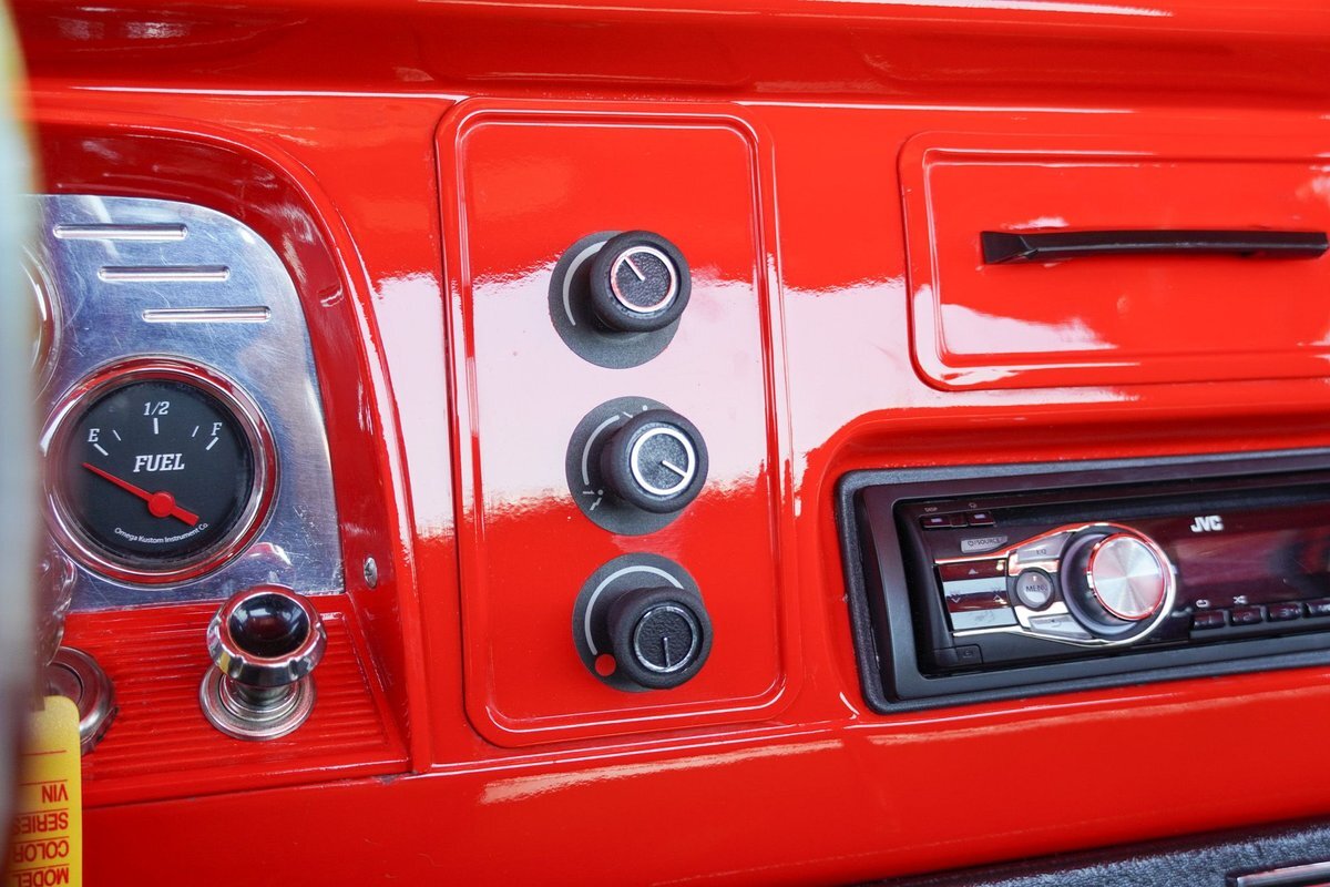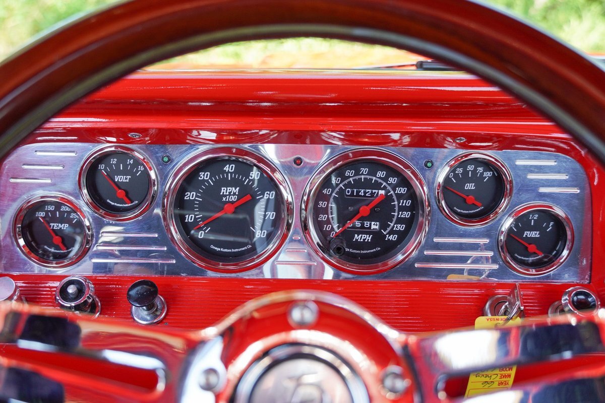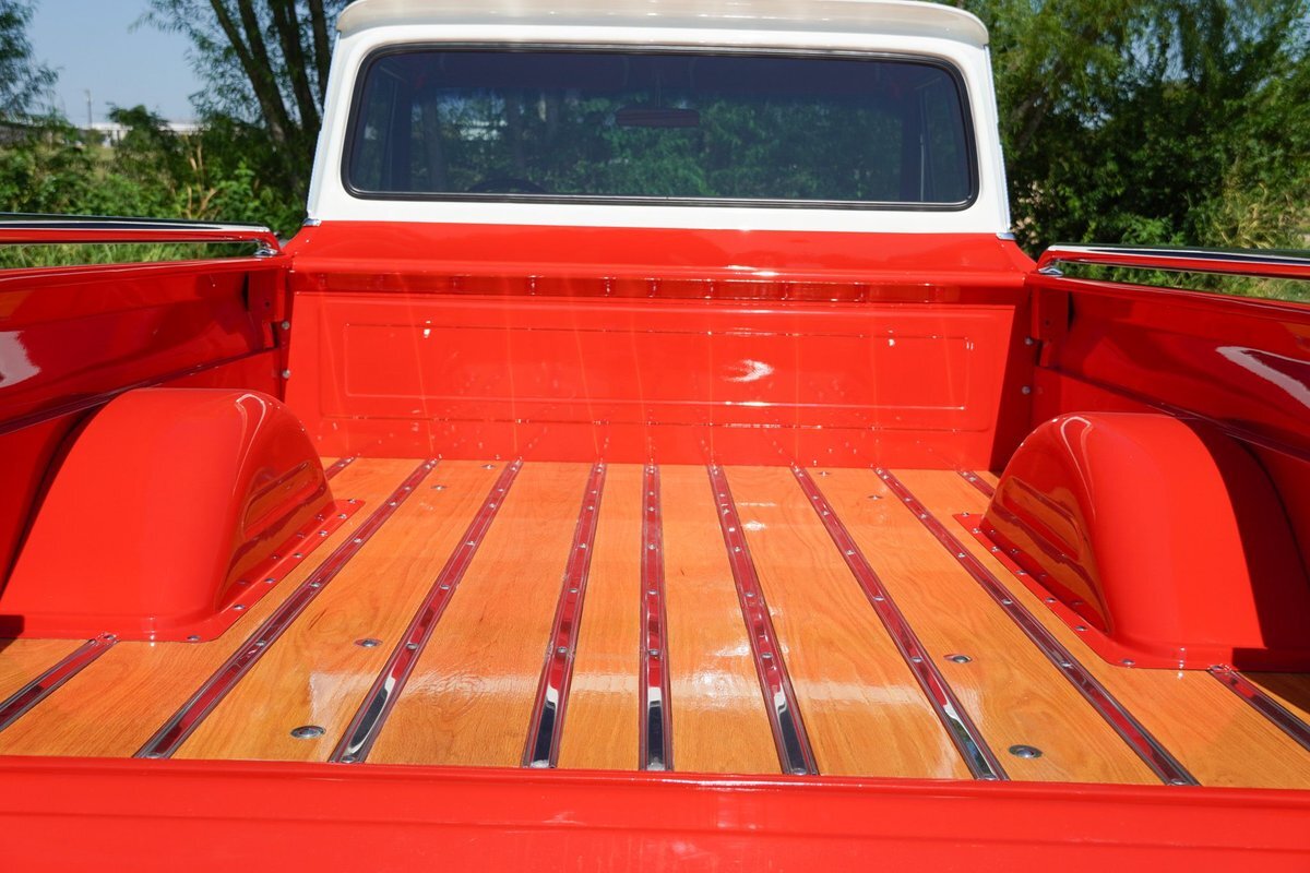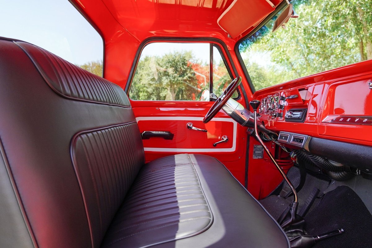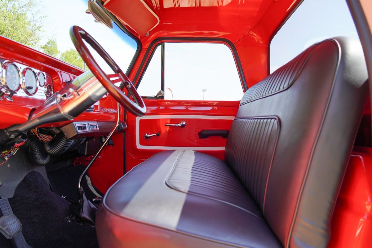 Truck can be seen on Hotrodcollection .com We welcome trade-ins Frame Off Restoration 350 CID Engine New Glass and Trim Detailed Frame and Suspension Oak Bed FloorBig Back Window Truck Vintage Heat and AirPower Steering Power Front Disc Brakes Tilt Wheel Mega Omega Kustom Gauges All New Black Interior New Bumpers and Grille New Wiring Dual Exhaust Custom Chrome US Mags Rears 275-45-20s Front 245-45-20 This 1966 Chevrolet C10 is a short-bed pickup that was refurbished under prior ownership around 2021, including the installation of a 350ci V8 and a three-speed TH400 automatic transmission. The truck has been repainted red with a white roof over a matching interior, and additional equipment includes, power-assisted drum brakes, a wood bed floor, chrome bed rails, Hedman headers, a dual exhaust system, and air conditioning. A wood plank bed floor has been added, and additional equipment includes aftermarket headlights, chrome bed rails, a retractable antenna, and dual side mirrors. A JVC CD stereo is housed in the stock location, and an under-dash air conditioning system has been added. The fuel tank is located behind the seat. The wood-rimmed three-spoke steering wheel frames a polished bezel housing Omega Kustom gauges, including a 140-mph speedometer, an 8k-rpm tachometer, and readouts for fuel level, coolant temperature, oil pressure, and voltage. The five-digit odometer shows 1,400 miles, and total mileage is unknown. Power is routed to the rear wheels through a TH400 three-speed automatic transmission