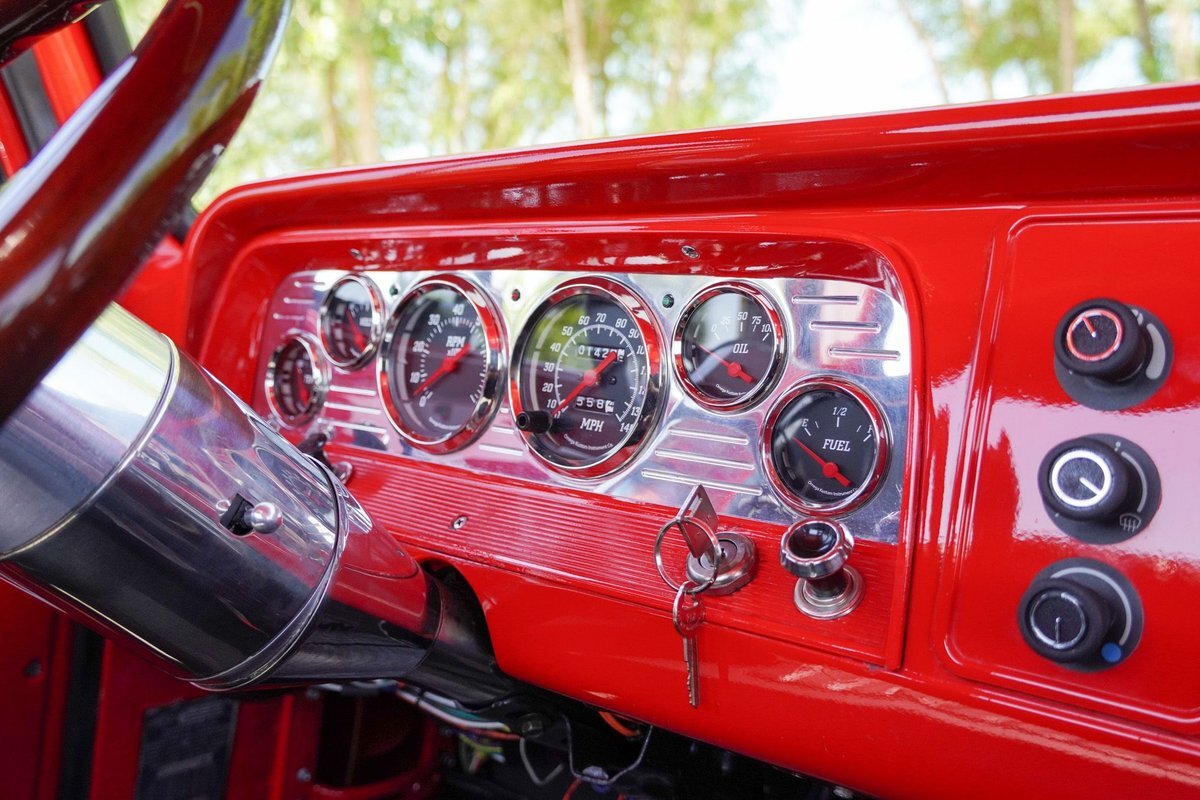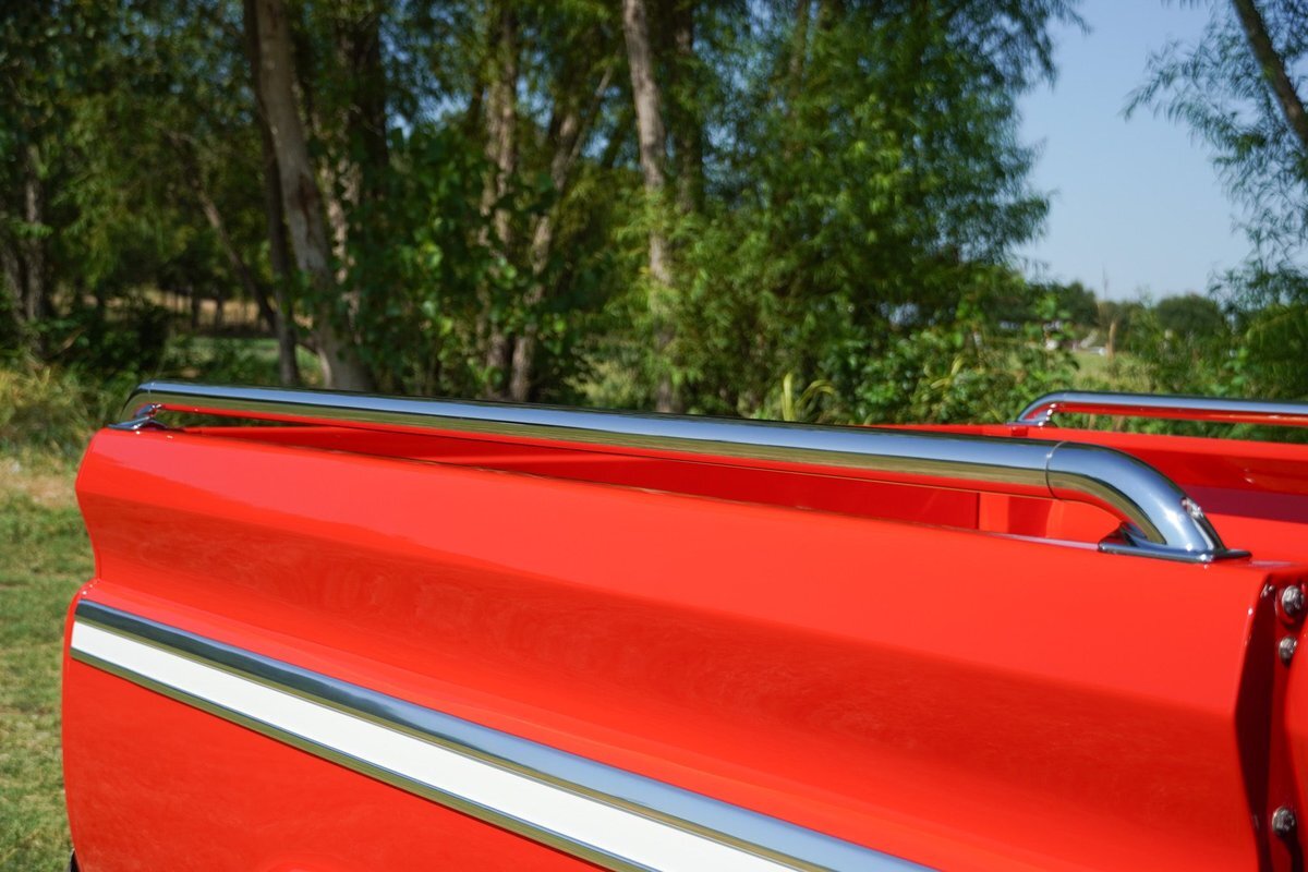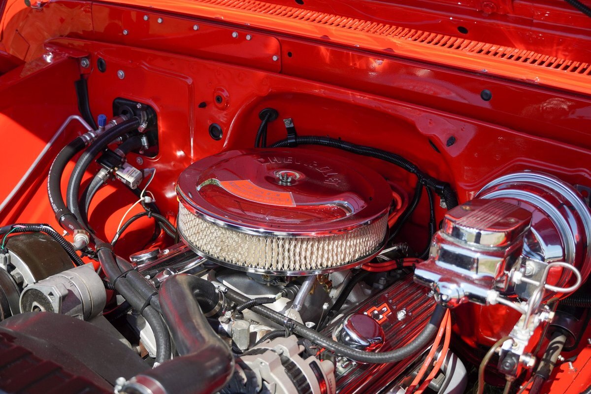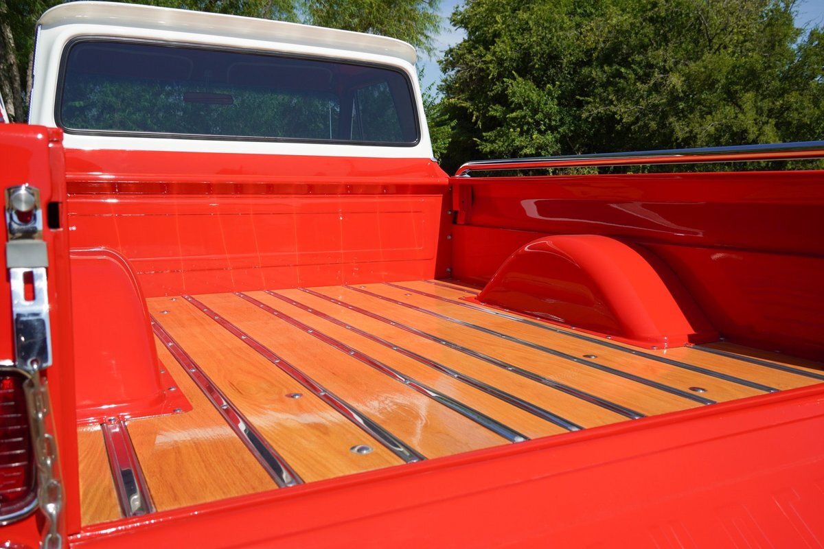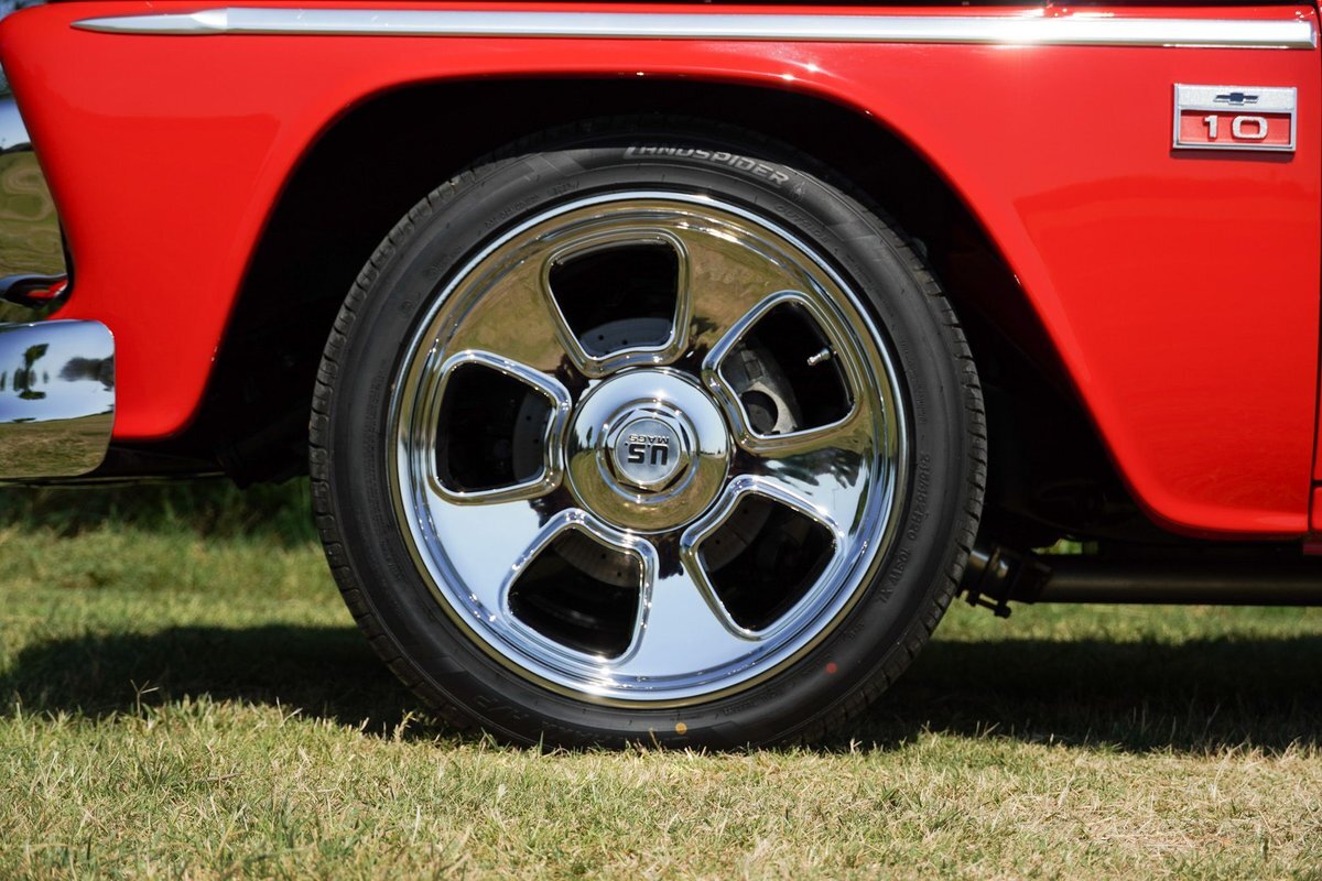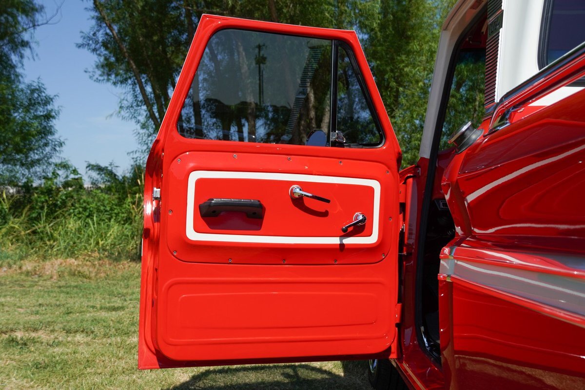 Truck can be seen on Hotrodcollection .com We welcome trade-ins Frame Off Restoration 350 CID Engine New Glass and Trim Detailed Frame and Suspension Oak Bed FloorBig Back Window Truck Vintage Heat and AirPower Steering Power Front Disc Brakes Tilt Wheel Mega Omega Kustom Gauges All New Black Interior New Bumpers and Grille New Wiring Dual Exhaust Custom Chrome US Mags Rears 275-45-20s Front 245-45-20 This 1966 Chevrolet C10 is a short-bed pickup that was refurbished under prior ownership around 2021, including the installation of a 350ci V8 and a three-speed TH400 automatic transmission. The truck has been repainted red with a white roof over a matching interior, and additional equipment includes, power-assisted drum brakes, a wood bed floor, chrome bed rails, Hedman headers, a dual exhaust system, and air conditioning. A wood plank bed floor has been added, and additional equipment includes aftermarket headlights, chrome bed rails, a retractable antenna, and dual side mirrors. A JVC CD stereo is housed in the stock location, and an under-dash air conditioning system has been added. The fuel tank is located behind the seat. The wood-rimmed three-spoke steering wheel frames a polished bezel housing Omega Kustom gauges, including a 140-mph speedometer, an 8k-rpm tachometer, and readouts for fuel level, coolant temperature, oil pressure, and voltage. The five-digit odometer shows 1,400 miles, and total mileage is unknown. Power is routed to the rear wheels through a TH400 three-speed automatic transmission