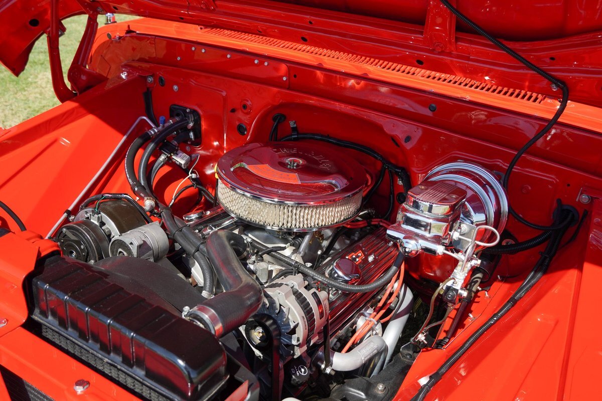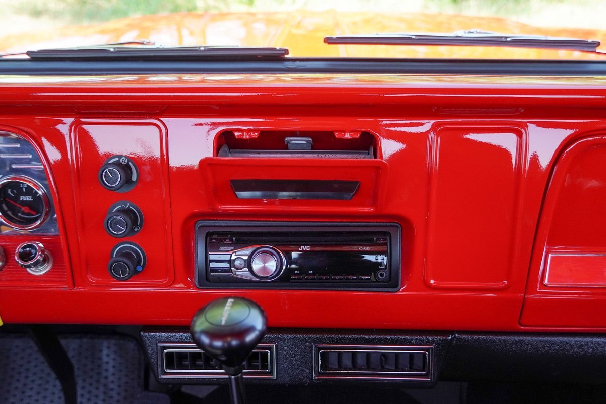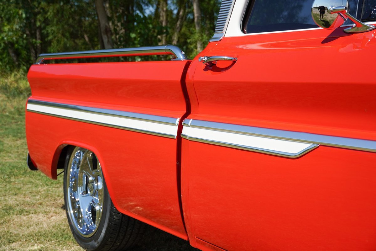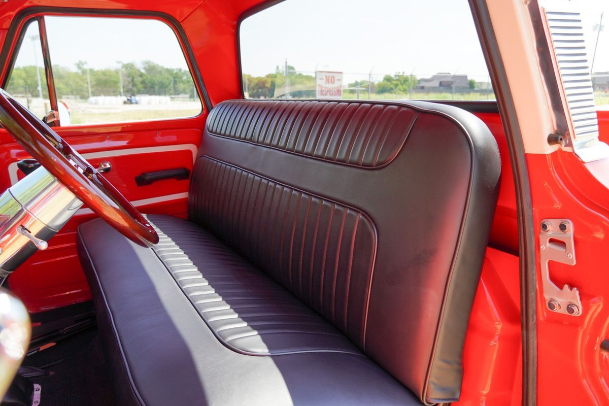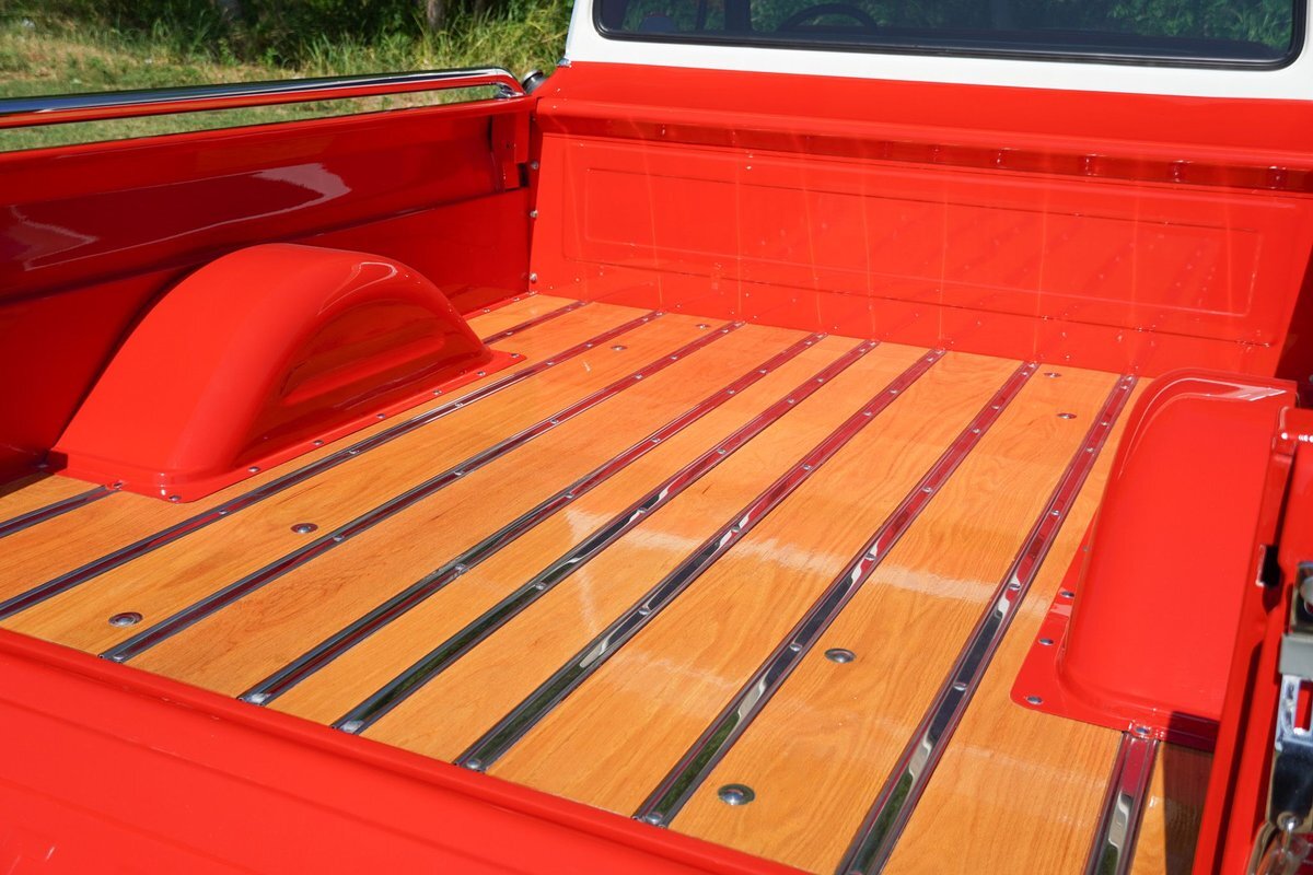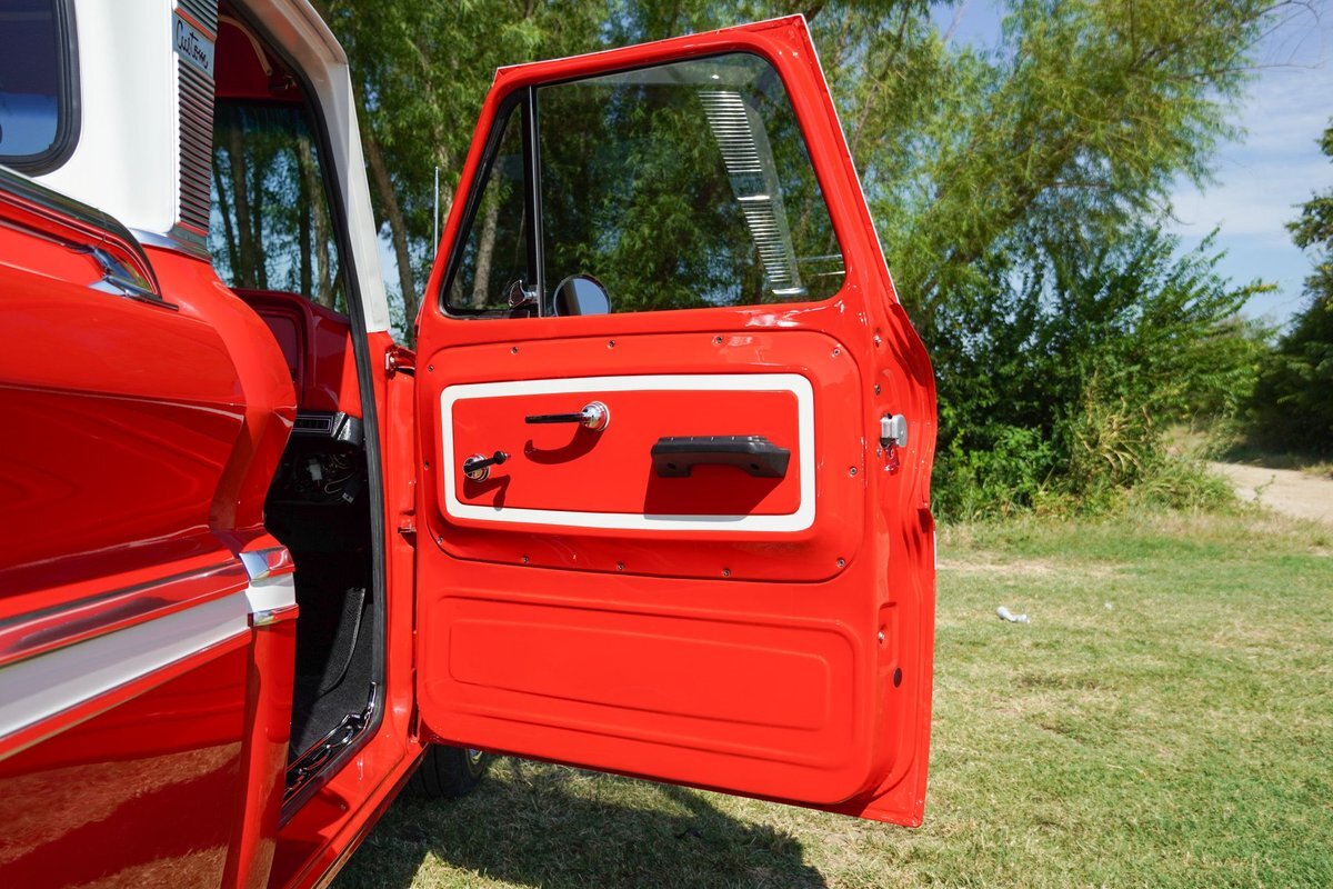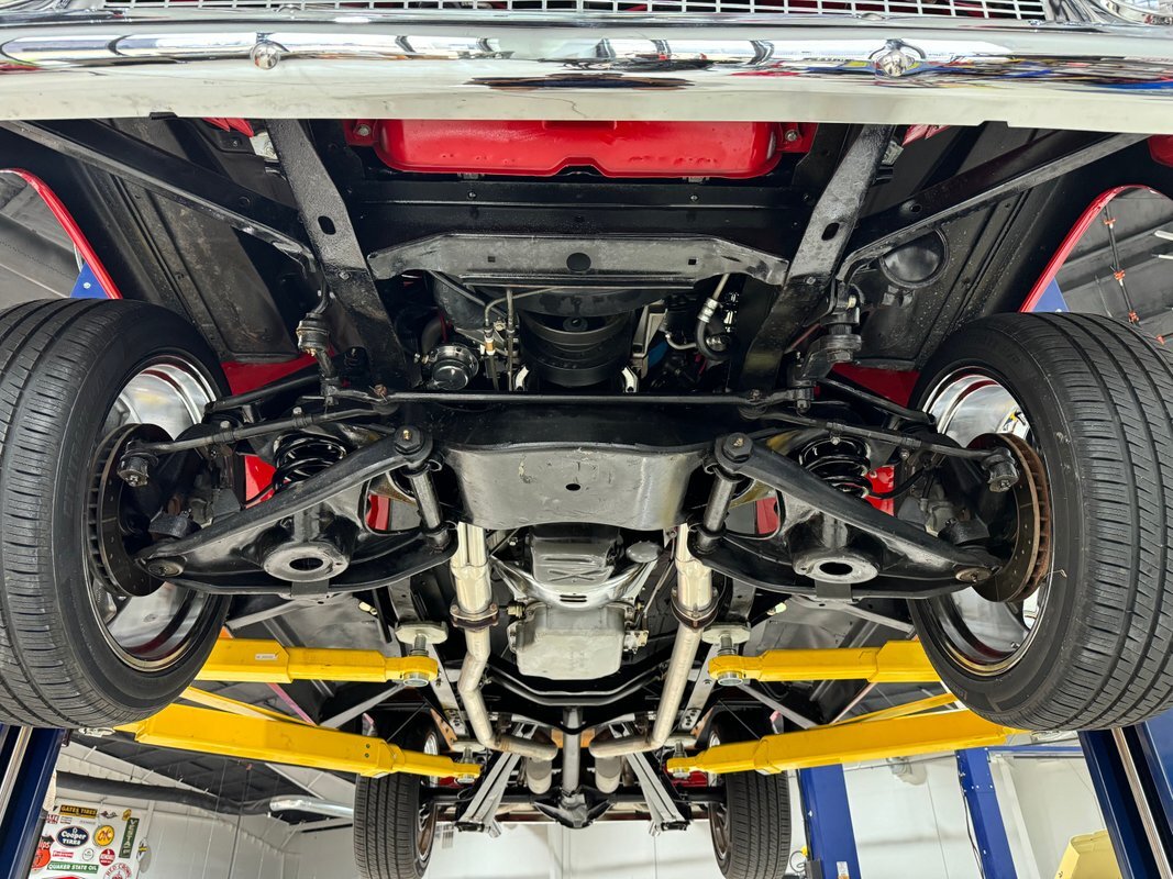 Truck can be seen on Hotrodcollection .com We welcome trade-ins Frame Off Restoration 350 CID Engine New Glass and Trim Detailed Frame and Suspension Oak Bed FloorBig Back Window Truck Vintage Heat and AirPower Steering Power Front Disc Brakes Tilt Wheel Mega Omega Kustom Gauges All New Black Interior New Bumpers and Grille New Wiring Dual Exhaust Custom Chrome US Mags Rears 275-45-20s Front 245-45-20 This 1966 Chevrolet C10 is a short-bed pickup that was refurbished under prior ownership around 2021, including the installation of a 350ci V8 and a three-speed TH400 automatic transmission. The truck has been repainted red with a white roof over a matching interior, and additional equipment includes, power-assisted drum brakes, a wood bed floor, chrome bed rails, Hedman headers, a dual exhaust system, and air conditioning. A wood plank bed floor has been added, and additional equipment includes aftermarket headlights, chrome bed rails, a retractable antenna, and dual side mirrors. A JVC CD stereo is housed in the stock location, and an under-dash air conditioning system has been added. The fuel tank is located behind the seat. The wood-rimmed three-spoke steering wheel frames a polished bezel housing Omega Kustom gauges, including a 140-mph speedometer, an 8k-rpm tachometer, and readouts for fuel level, coolant temperature, oil pressure, and voltage. The five-digit odometer shows 1,400 miles, and total mileage is unknown. Power is routed to the rear wheels through a TH400 three-speed automatic transmission