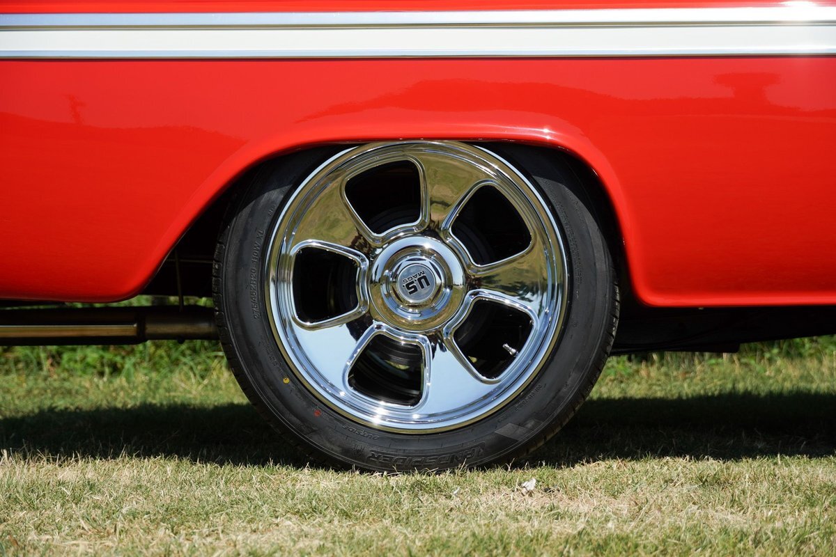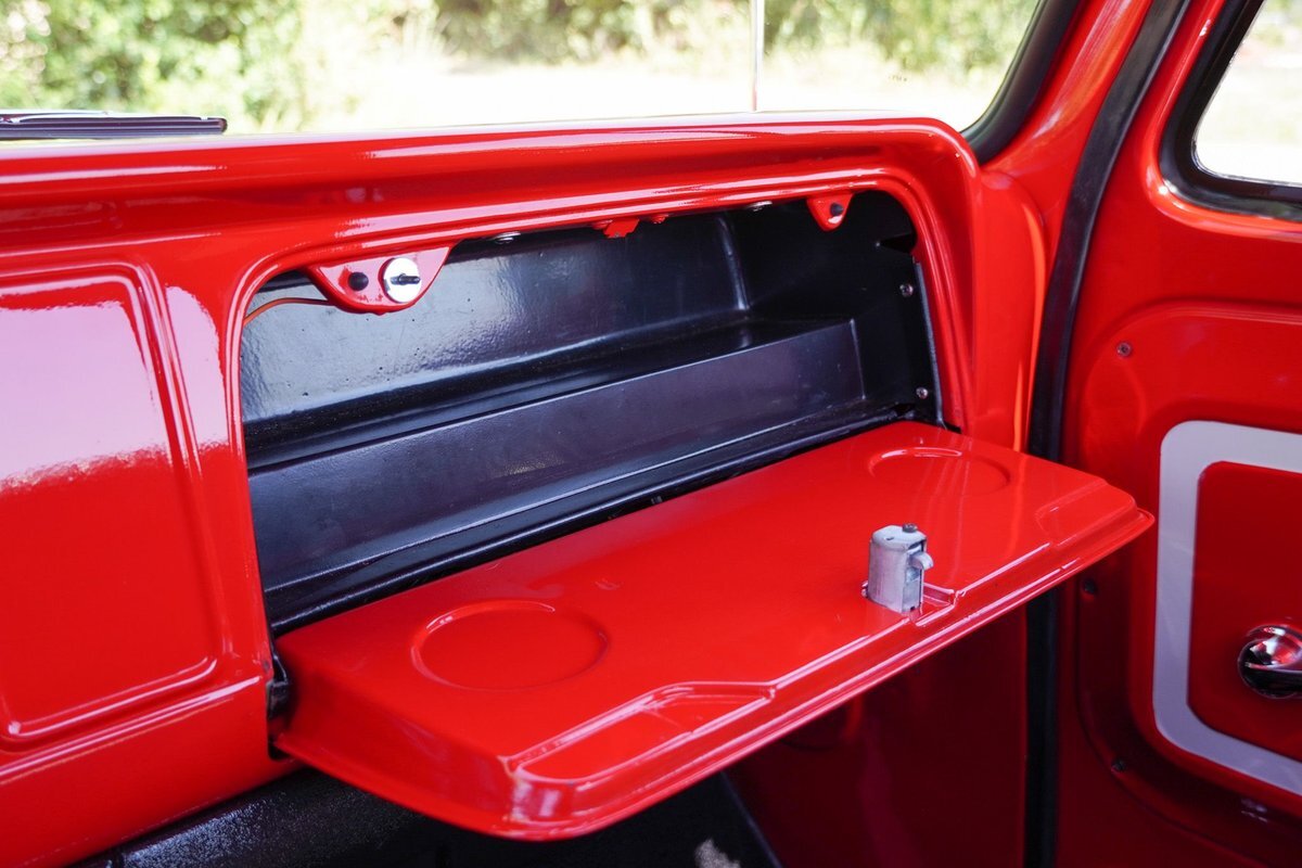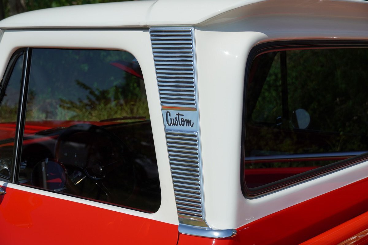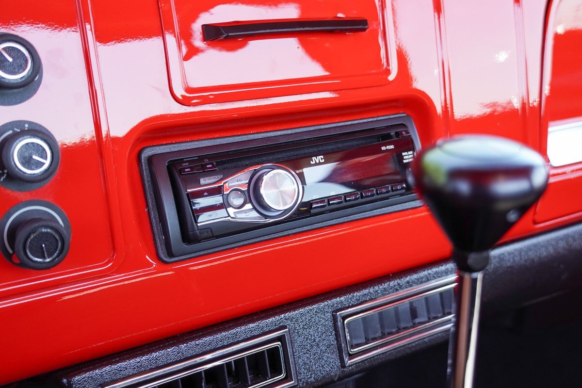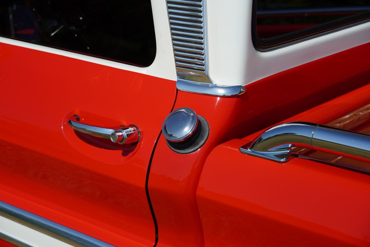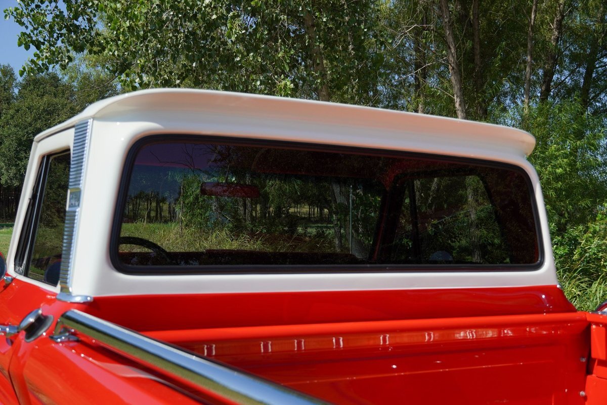 Truck can be seen on Hotrodcollection .com We welcome trade-ins Frame Off Restoration 350 CID Engine New Glass and Trim Detailed Frame and Suspension Oak Bed FloorBig Back Window Truck Vintage Heat and AirPower Steering Power Front Disc Brakes Tilt Wheel Mega Omega Kustom Gauges All New Black Interior New Bumpers and Grille New Wiring Dual Exhaust Custom Chrome US Mags Rears 275-45-20s Front 245-45-20 This 1966 Chevrolet C10 is a short-bed pickup that was refurbished under prior ownership around 2021, including the installation of a 350ci V8 and a three-speed TH400 automatic transmission. The truck has been repainted red with a white roof over a matching interior, and additional equipment includes, power-assisted drum brakes, a wood bed floor, chrome bed rails, Hedman headers, a dual exhaust system, and air conditioning. A wood plank bed floor has been added, and additional equipment includes aftermarket headlights, chrome bed rails, a retractable antenna, and dual side mirrors. A JVC CD stereo is housed in the stock location, and an under-dash air conditioning system has been added. The fuel tank is located behind the seat. The wood-rimmed three-spoke steering wheel frames a polished bezel housing Omega Kustom gauges, including a 140-mph speedometer, an 8k-rpm tachometer, and readouts for fuel level, coolant temperature, oil pressure, and voltage. The five-digit odometer shows 1,400 miles, and total mileage is unknown. Power is routed to the rear wheels through a TH400 three-speed automatic transmission