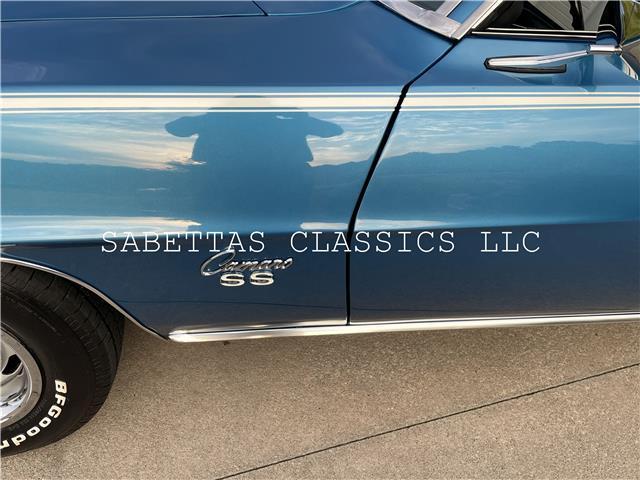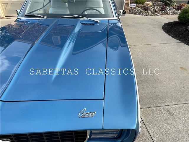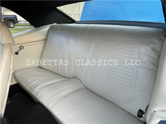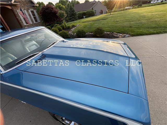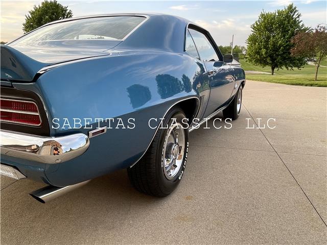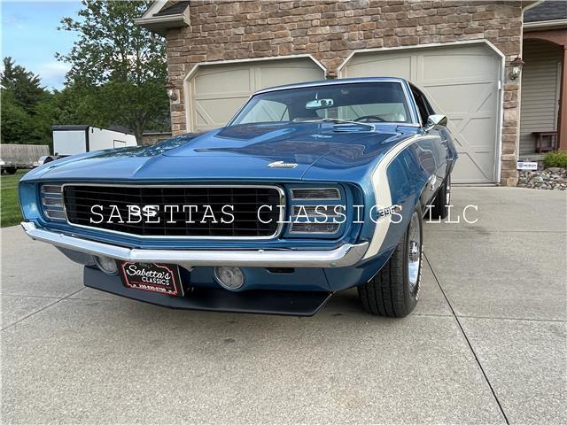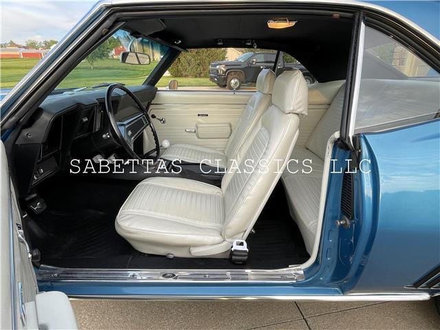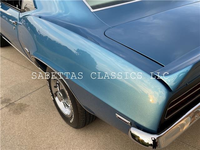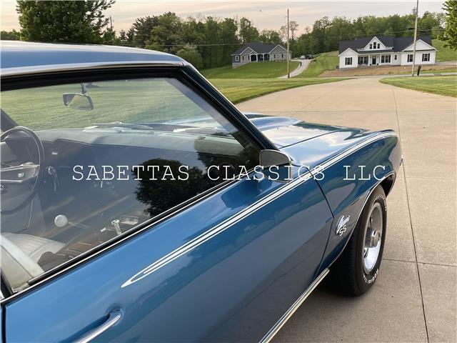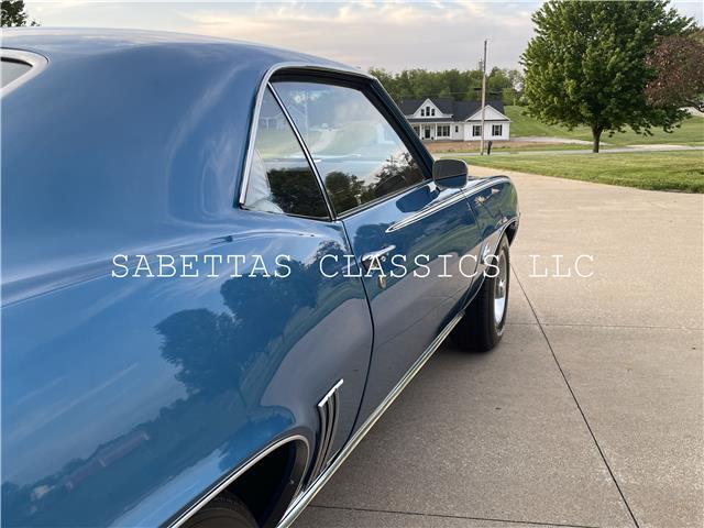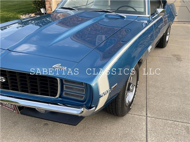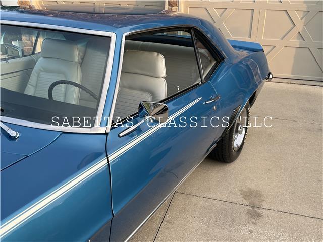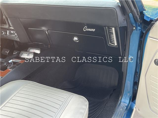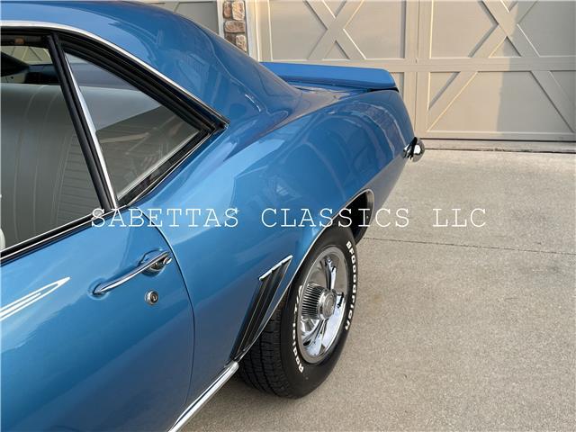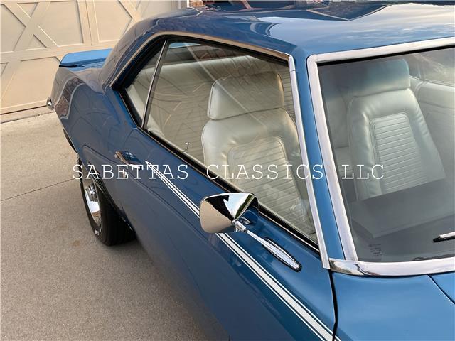This 1969 Camaro is really sweet! It’s LeMans Blue, code 71 with white Hockey stick stripes running down both fenders and doors. This Camaro has a nice clean body and is straight down the sides, paint is very smooth and glossy. The fit and finish is excellent, door jambs are nice and glossy. All new weather stripping and window seals, doors open and shut nice (no sagging). All the bright work has been replaced or polished, front and rear bumpers are like new. The front grill, hide-away headlight bezels and SS emblem have been replaced. It rides on a set of 14x7 Chevy Rally wheels with a set of 215/70/14 BFGoodrich T/A Radial tires.