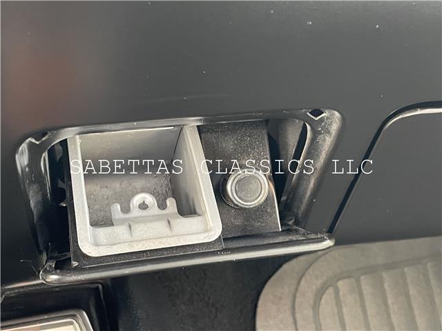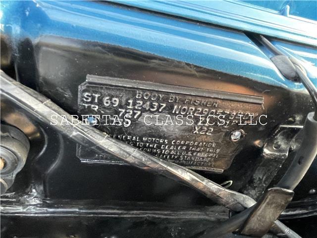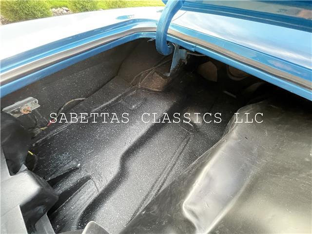 The trunk is nicely detailed with a spare tire. It has been sprayed with black and aqua splatter paint. The trunk looks to be all original metal. The bottom of the trunk lid has the jacking instructions decal. New trunk weather stripping.