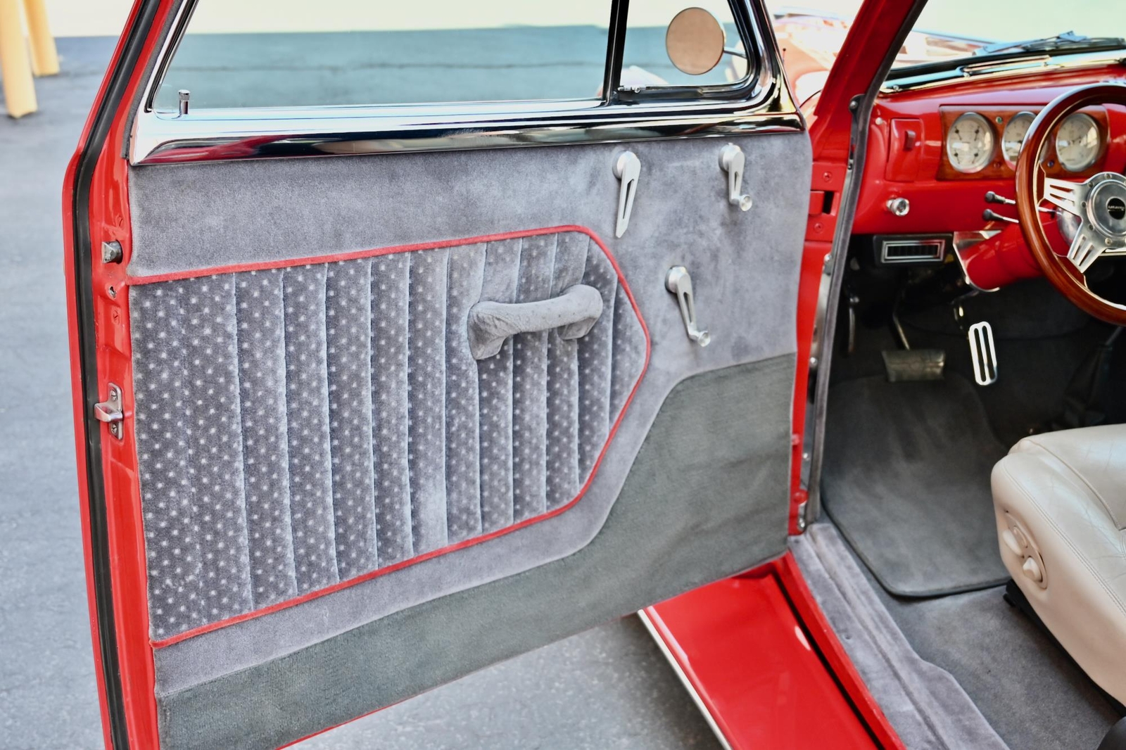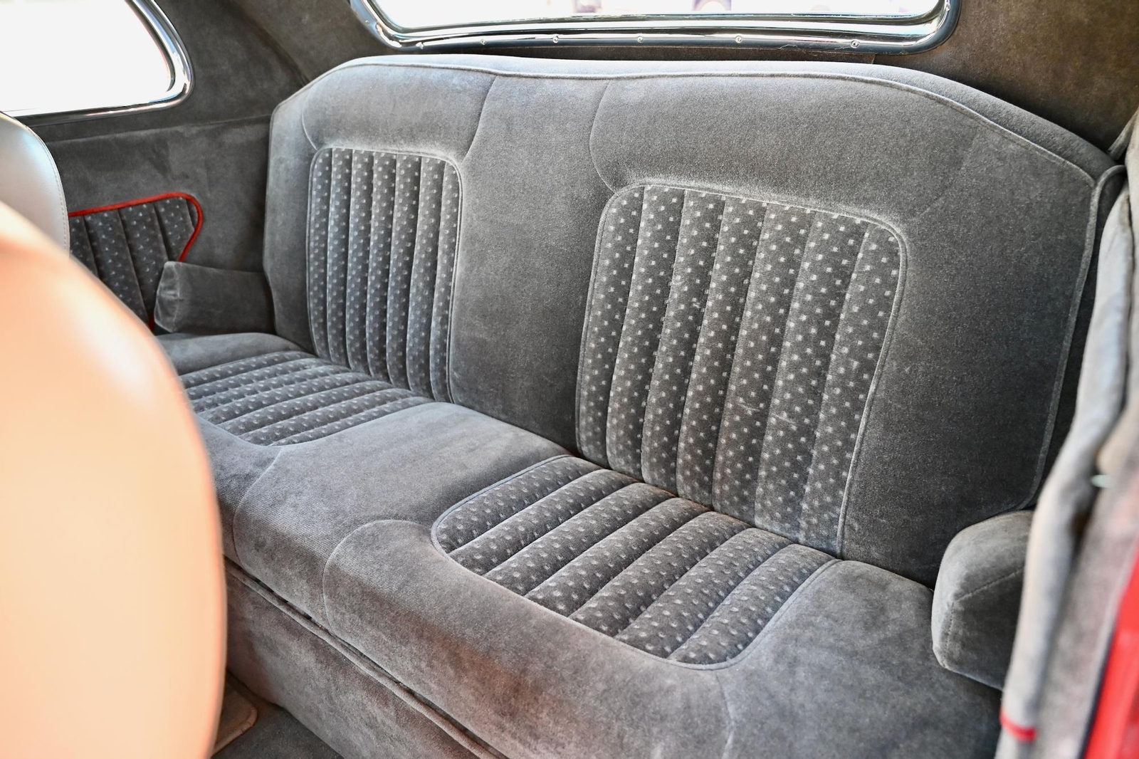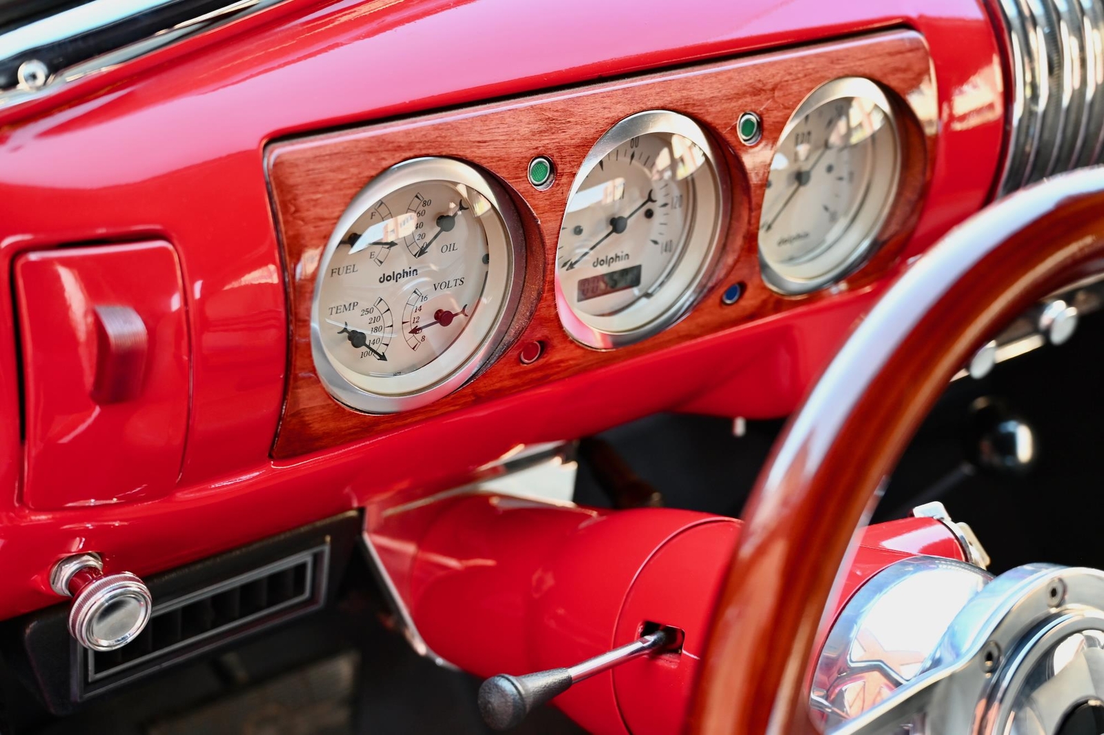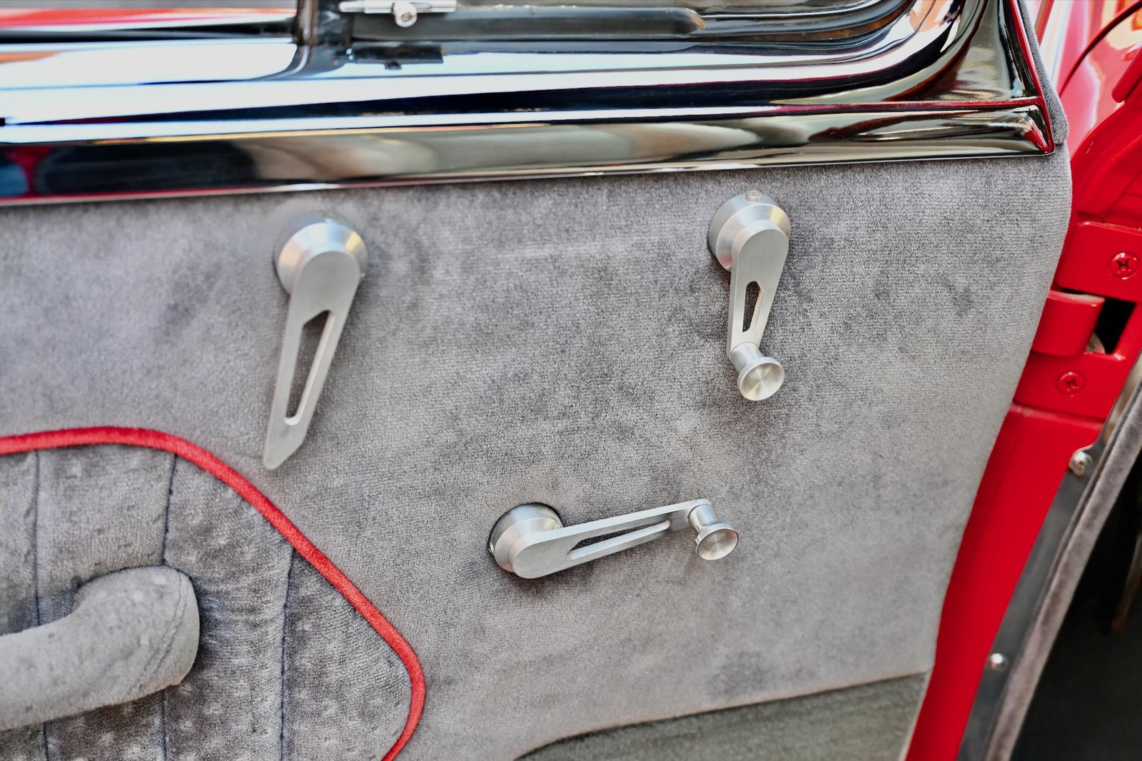 When you open the driver’s door, you will find a mostly gray velour interior w/ red piping, as well as beige Jaguar power bucket-seats, which were installed a couple of years ago (head-rests included). Other features include the original painted dash dressed up w/ lots of chrome, chrome interior moldings, new Dolphin gauges (which fit perfectly into the original dash opening), tilt-steering column, Lecarra 4-spoke billet aluminum/wood steering wheel, Vintage Air conditioning & heat (blows cold), custom aluminum door handles & window cranks, and all new carpeting, which was installed when the Jaguar power bucket seats were installed. There is currently no radio or sound system in the car. The interior is super comfortable and fully functional in every way.