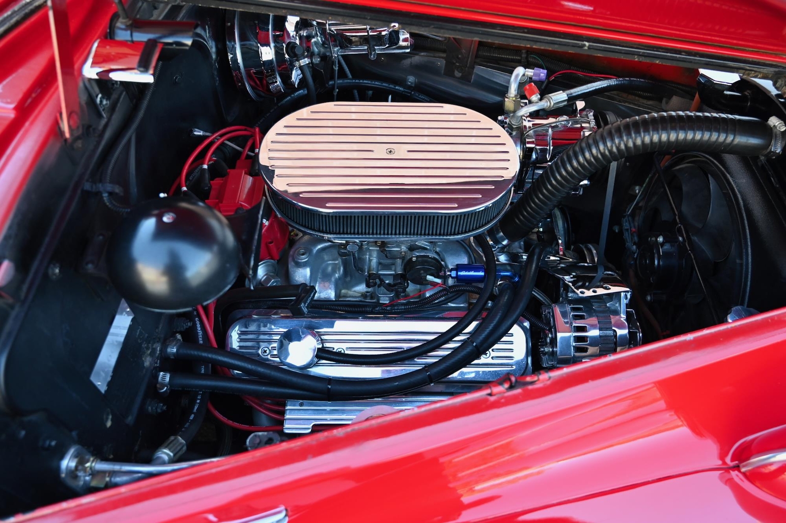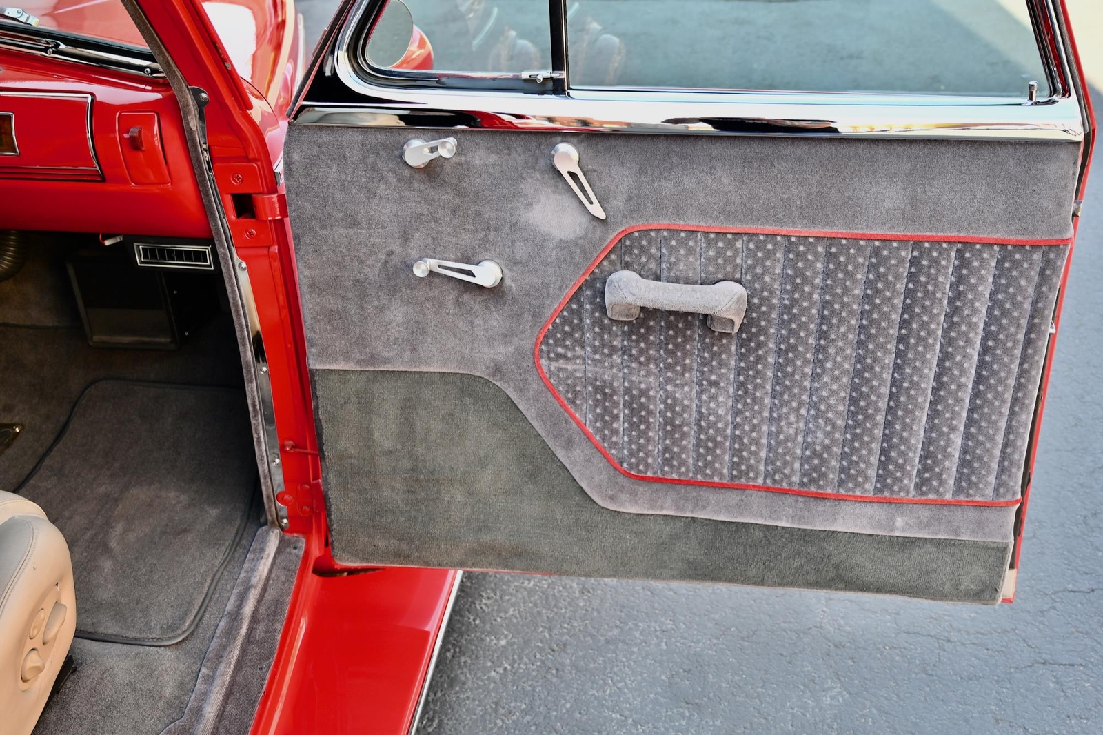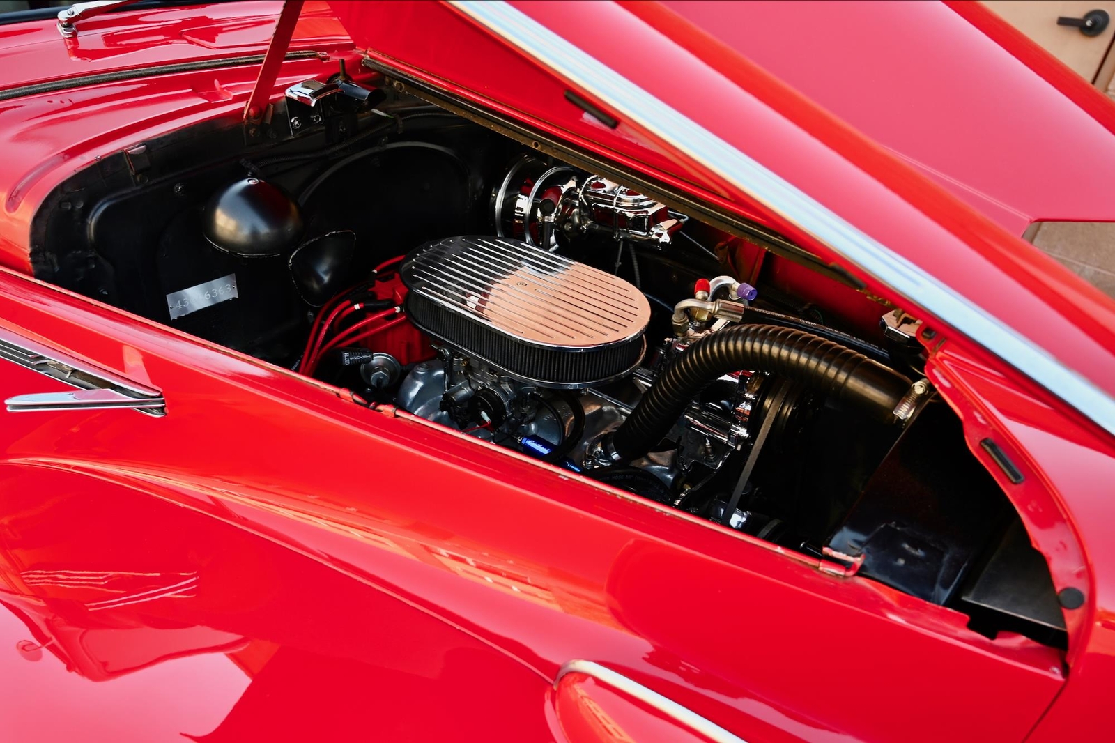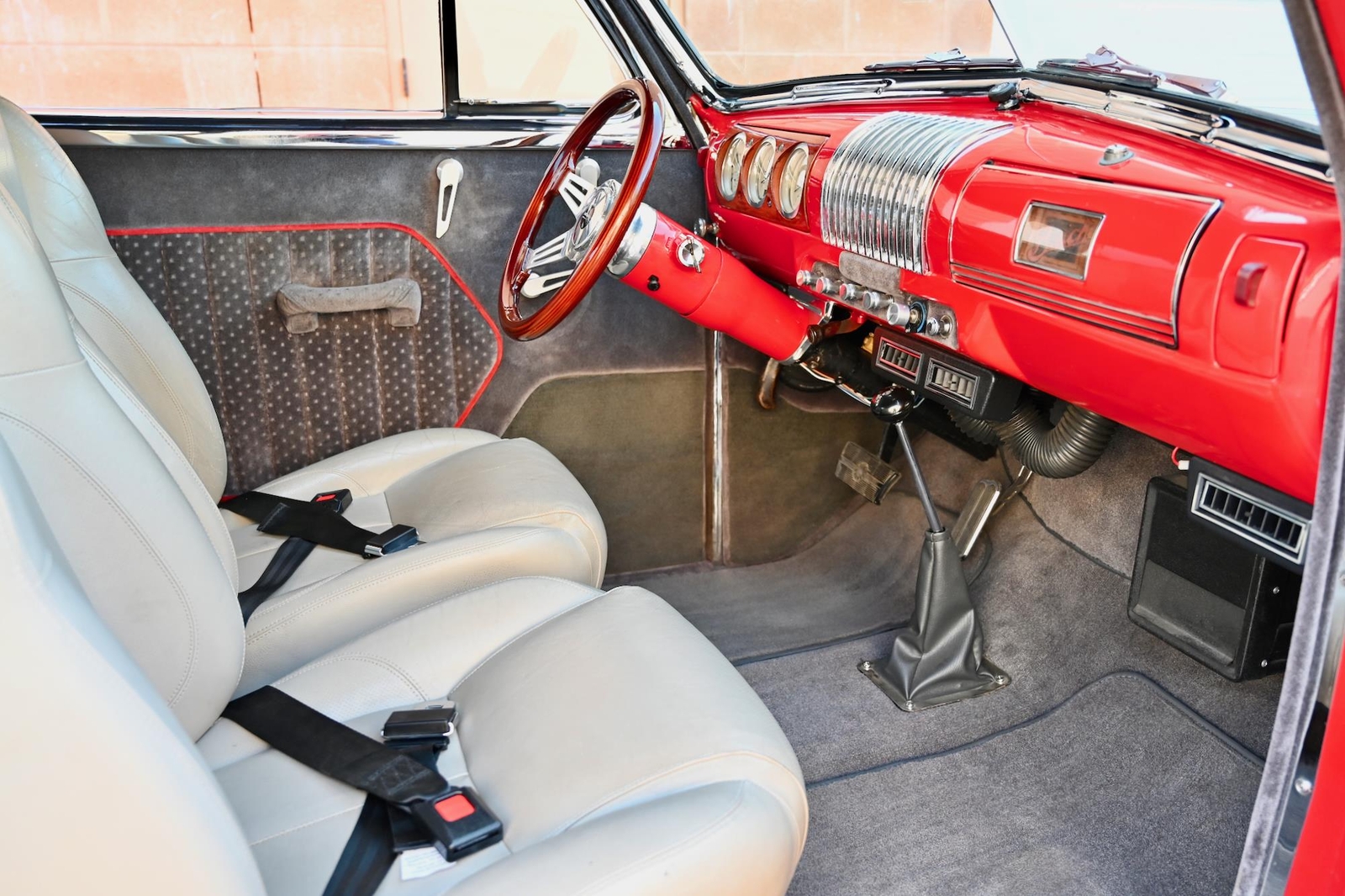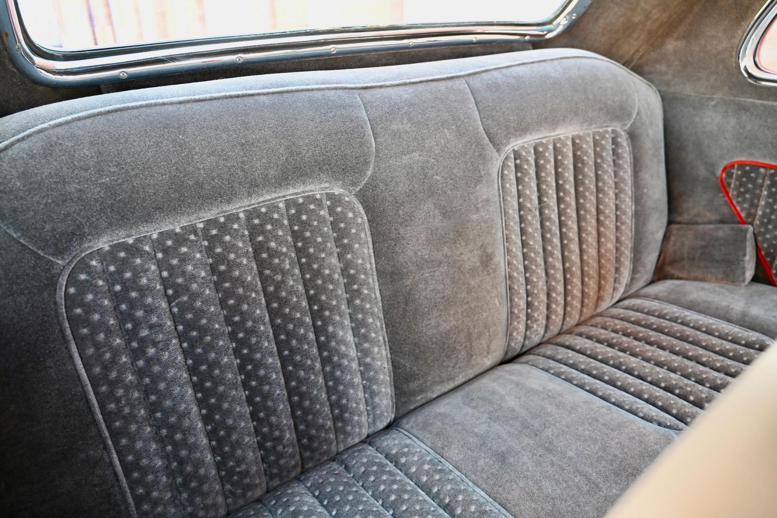 When you open the driver’s door, you will find a mostly gray velour interior w/ red piping, as well as beige Jaguar power bucket-seats, which were installed a couple of years ago (head-rests included). Other features include the original painted dash dressed up w/ lots of chrome, chrome interior moldings, new Dolphin gauges (which fit perfectly into the original dash opening), tilt-steering column, Lecarra 4-spoke billet aluminum/wood steering wheel, Vintage Air conditioning & heat (blows cold), custom aluminum door handles & window cranks, and all new carpeting, which was installed when the Jaguar power bucket seats were installed. There is currently no radio or sound system in the car. The interior is super comfortable and fully functional in every way.