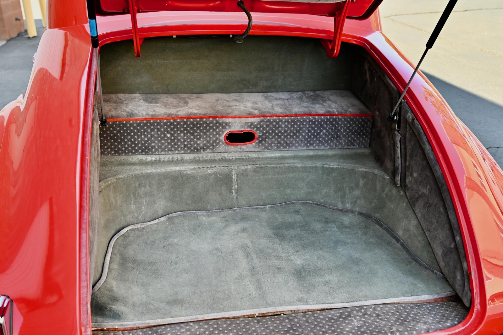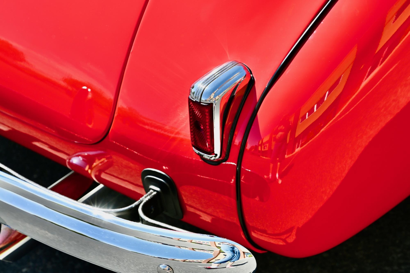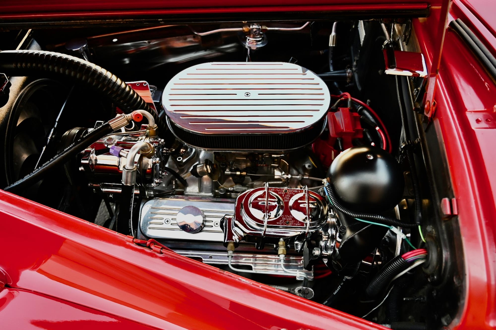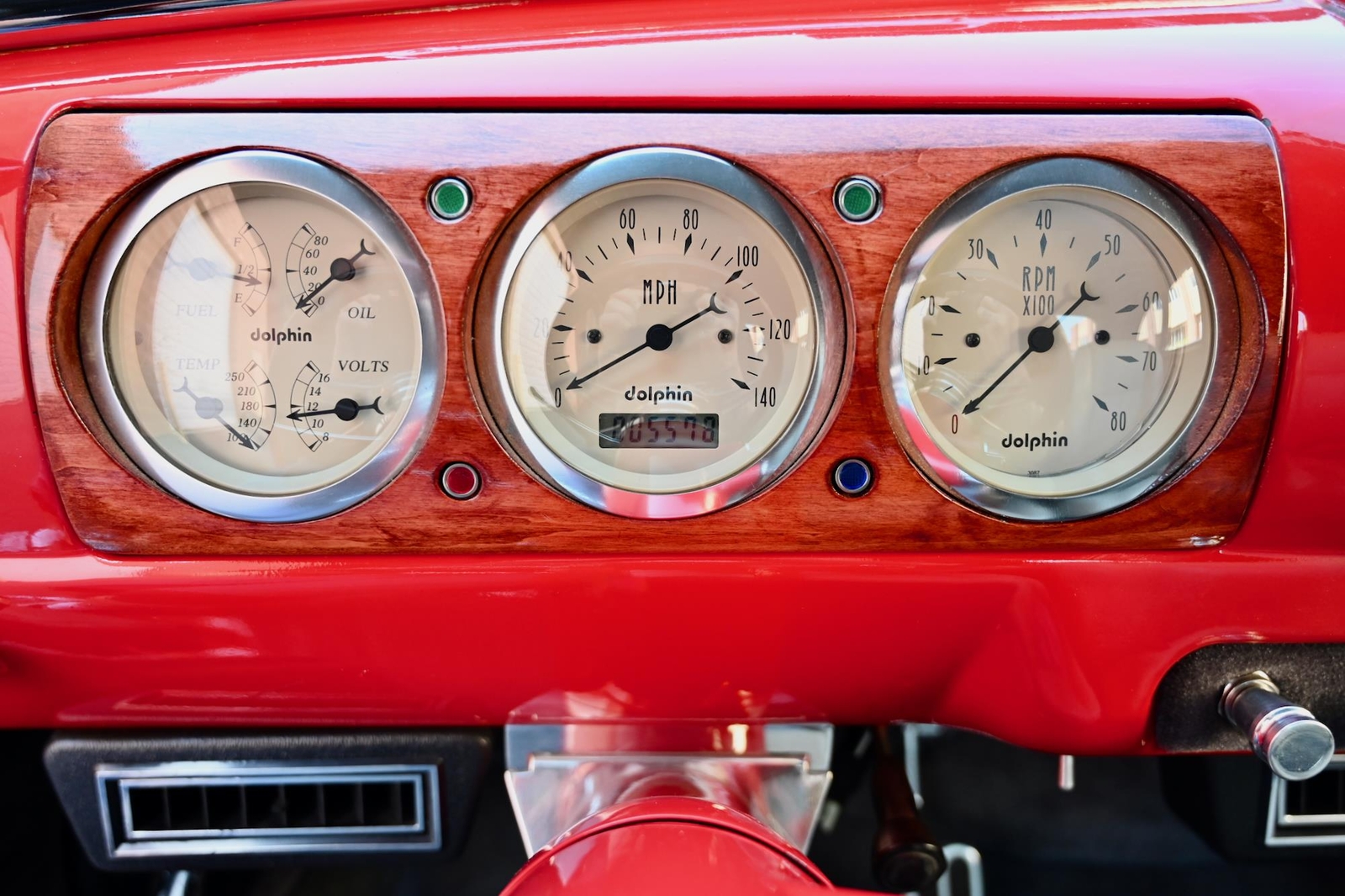When you open the driver’s door, you will find a mostly gray velour interior w/ red piping, as well as beige Jaguar power bucket-seats, which were installed a couple of years ago (head-rests included). Other features include the original painted dash dressed up w/ lots of chrome, chrome interior moldings, new Dolphin gauges (which fit perfectly into the original dash opening), tilt-steering column, Lecarra 4-spoke billet aluminum/wood steering wheel, Vintage Air conditioning & heat (blows cold), custom aluminum door handles & window cranks, and all new carpeting, which was installed when the Jaguar power bucket seats were installed. There is currently no radio or sound system in the car. The interior is super comfortable and fully functional in every way.