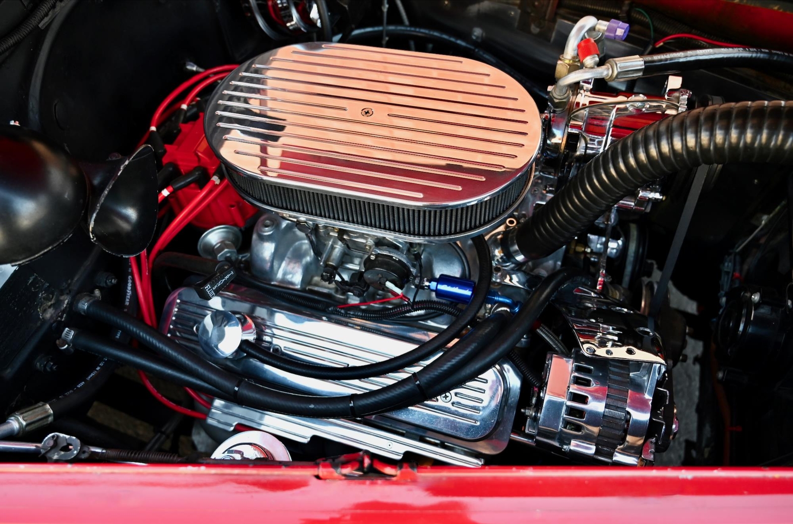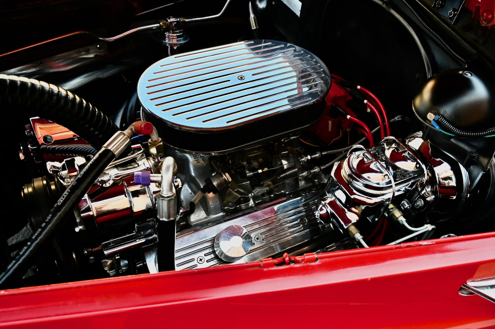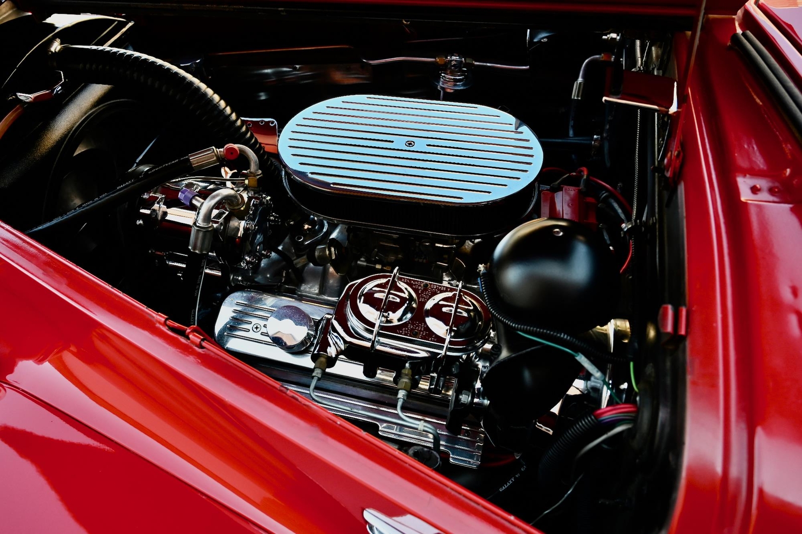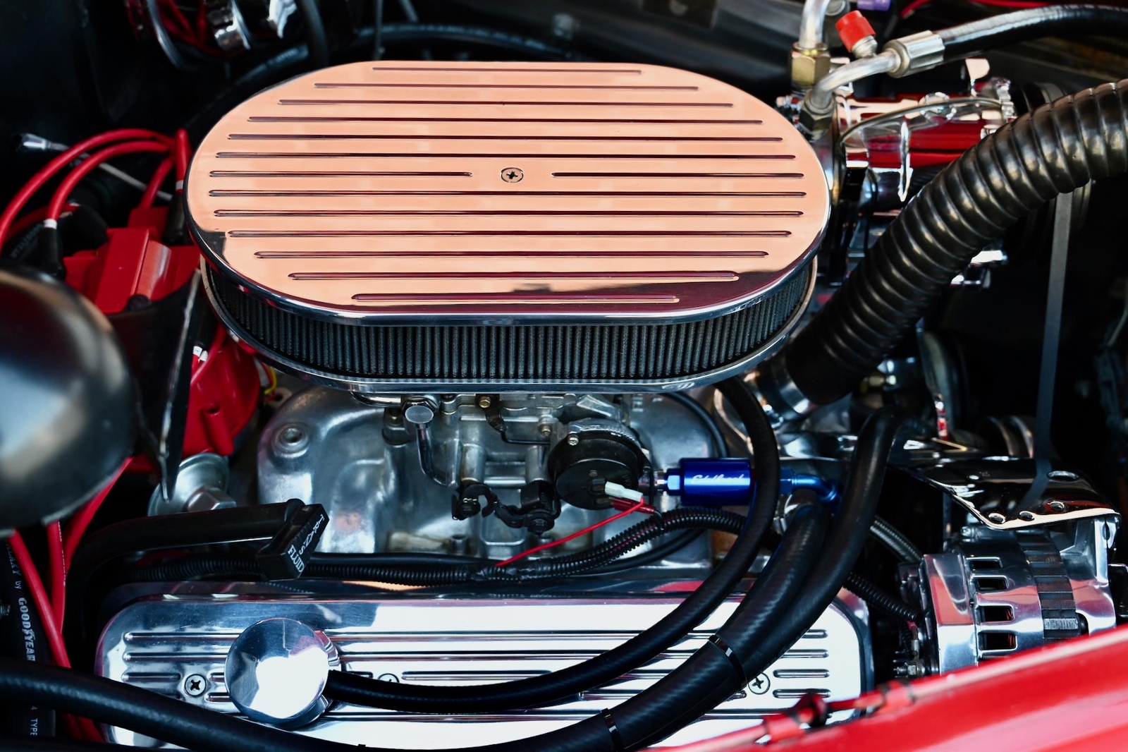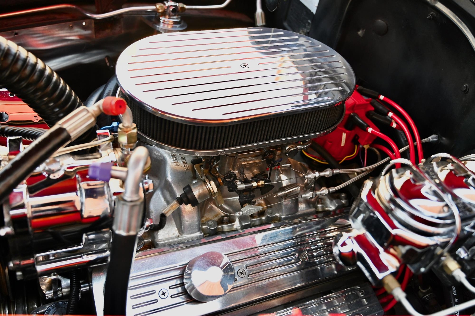 When you open the driver’s door, you will find a mostly gray velour interior w/ red piping, as well as beige Jaguar power bucket-seats, which were installed a couple of years ago (head-rests included). Other features include the original painted dash dressed up w/ lots of chrome, chrome interior moldings, new Dolphin gauges (which fit perfectly into the original dash opening), tilt-steering column, Lecarra 4-spoke billet aluminum/wood steering wheel, Vintage Air conditioning & heat (blows cold), custom aluminum door handles & window cranks, and all new carpeting, which was installed when the Jaguar power bucket seats were installed. There is currently no radio or sound system in the car. The interior is super comfortable and fully functional in every way.