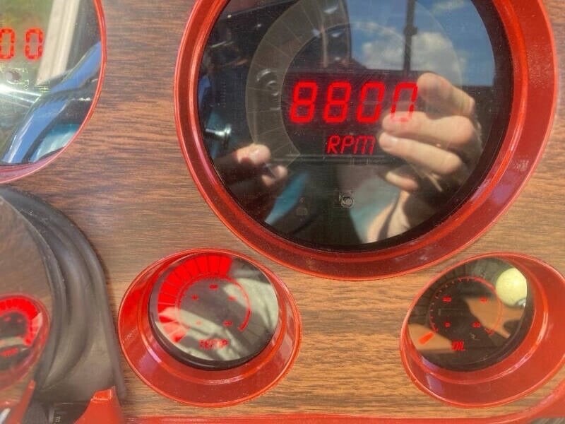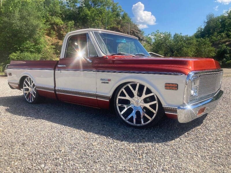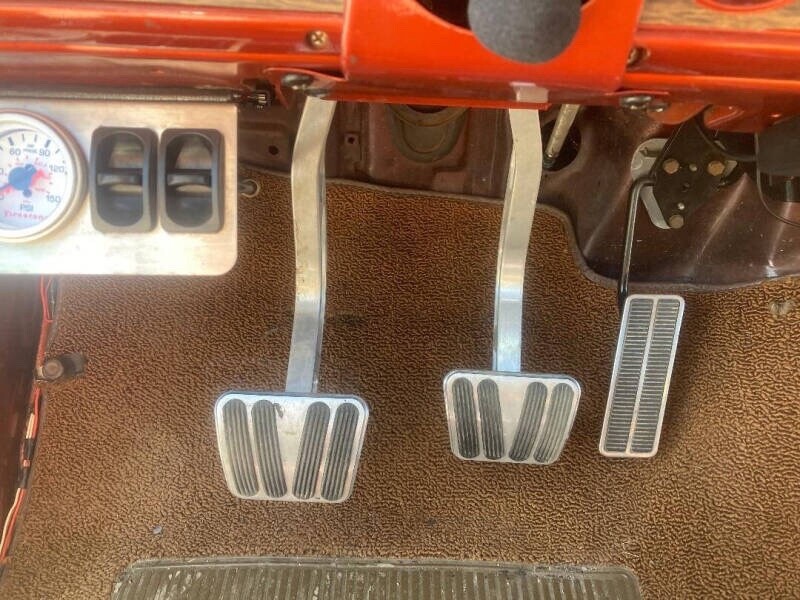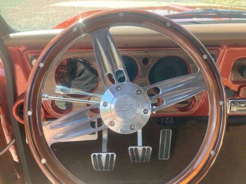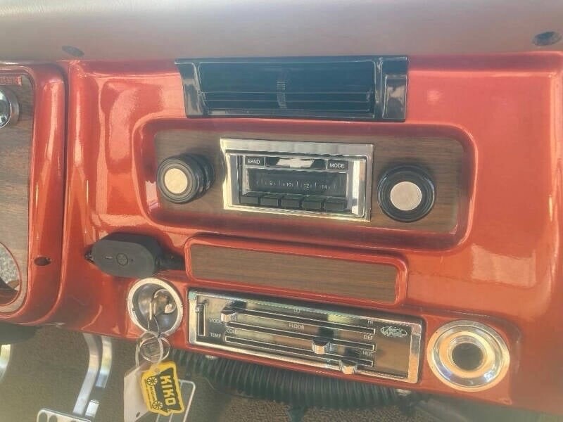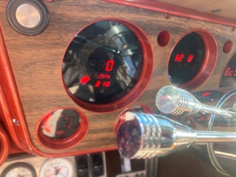 454 Chevrolet V8 engine, 4 speed Hurst shifted manual transmission, 12 bolt Posi rear end, Chevrolet air cleaner, electric cooling fans, chrome thermostat housing, chrome power steering pump, Billet power steering mount system, Serpentine belt/pulleys, Edelbrock intake, A/C, headers, dual exhaust with SS tips, CPP 4 wheel power disc brakes, tilt steering column, wood grain steering wheel with polished center, Billet brake and clutch pedals, PW, Classic Autosound stereo, tinted sliding rear window, illuminated bowtie door sills, digital dash, Cavallo wheels, tubular grille, lowered on airbags.