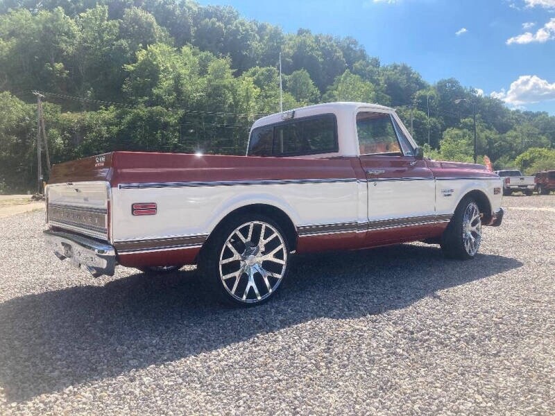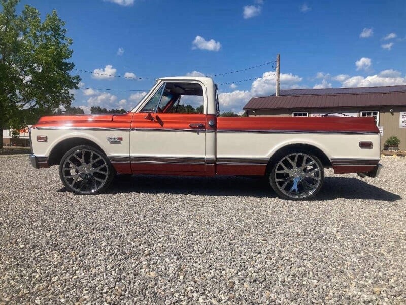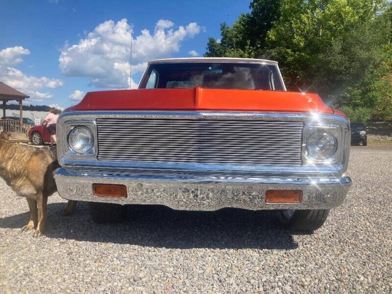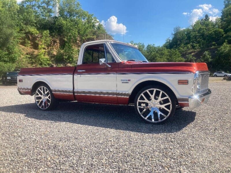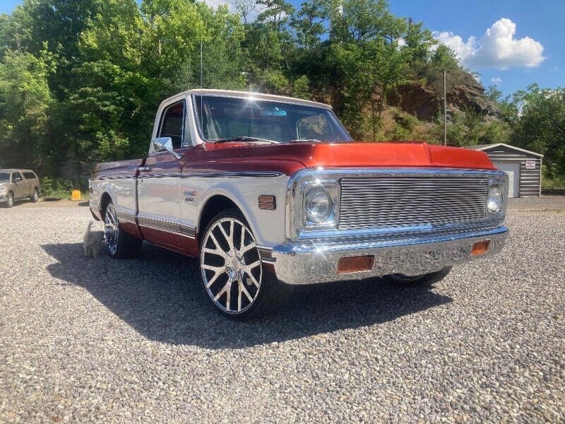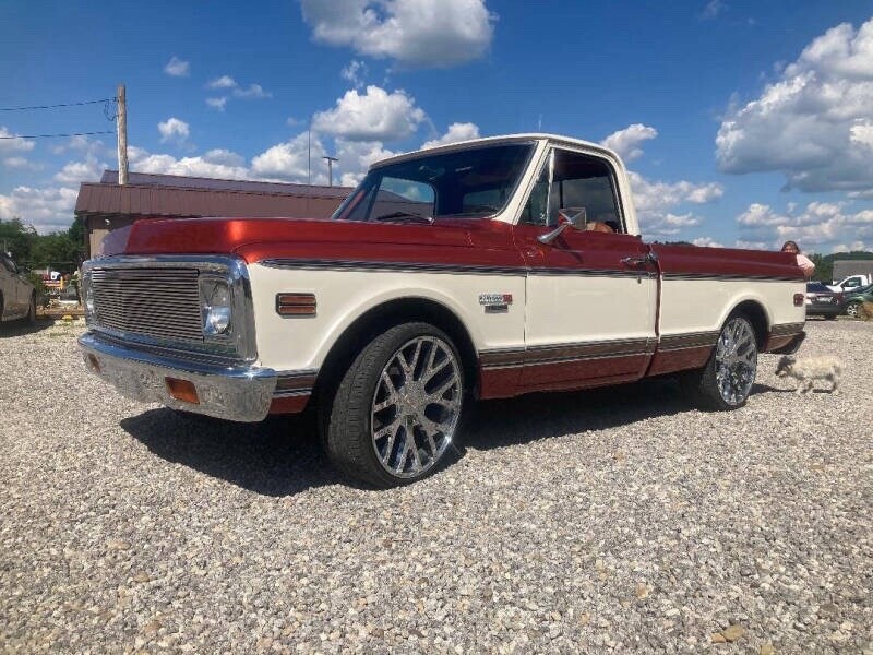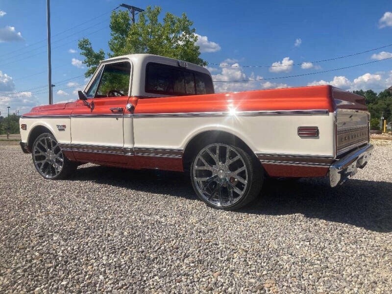 454 Chevrolet V8 engine, 4 speed Hurst shifted manual transmission, 12 bolt Posi rear end, Chevrolet air cleaner, electric cooling fans, chrome thermostat housing, chrome power steering pump, Billet power steering mount system, Serpentine belt/pulleys, Edelbrock intake, A/C, headers, dual exhaust with SS tips, CPP 4 wheel power disc brakes, tilt steering column, wood grain steering wheel with polished center, Billet brake and clutch pedals, PW, Classic Autosound stereo, tinted sliding rear window, illuminated bowtie door sills, digital dash, Cavallo wheels, tubular grille, lowered on airbags.