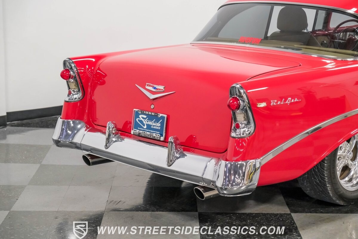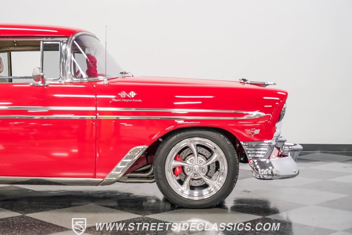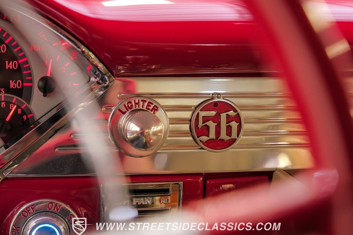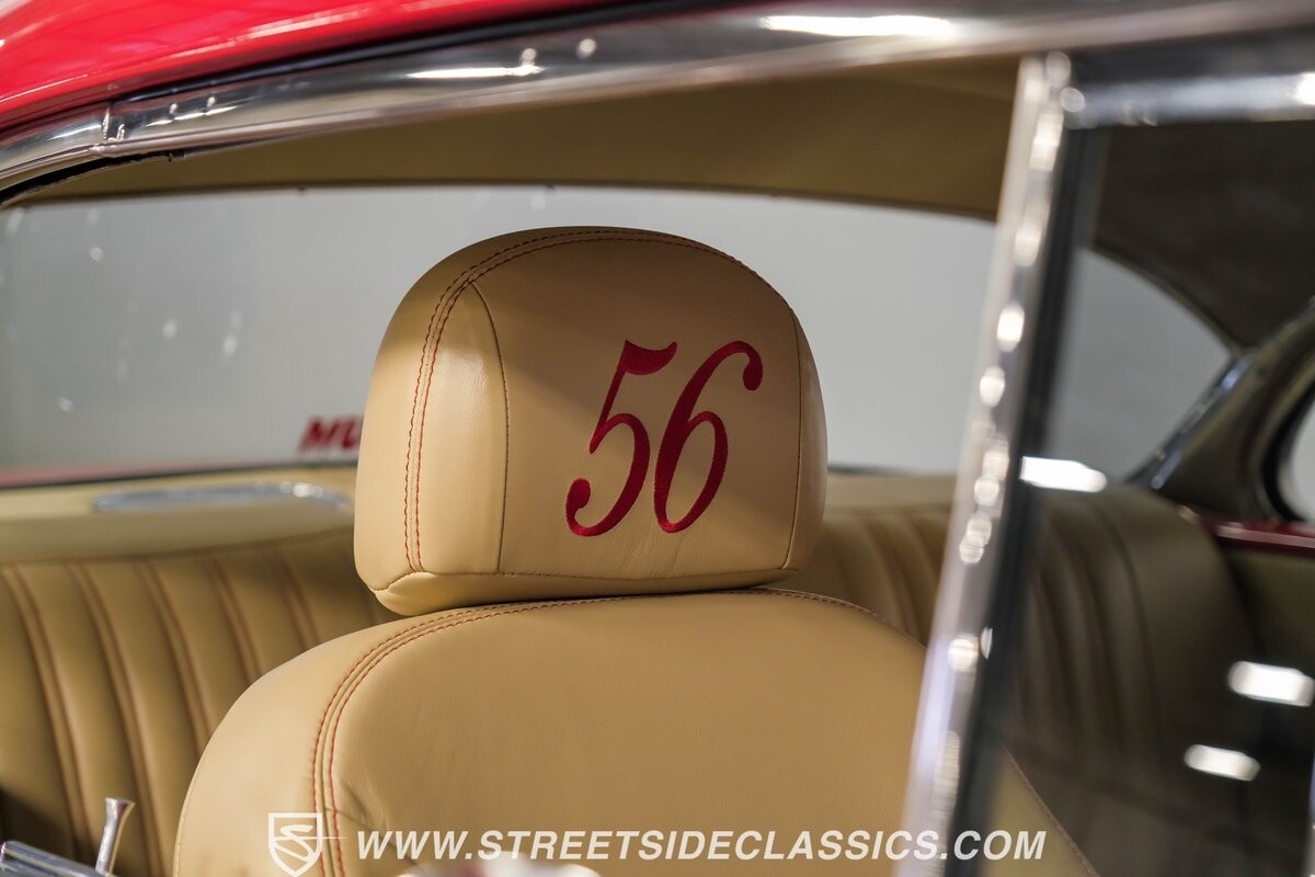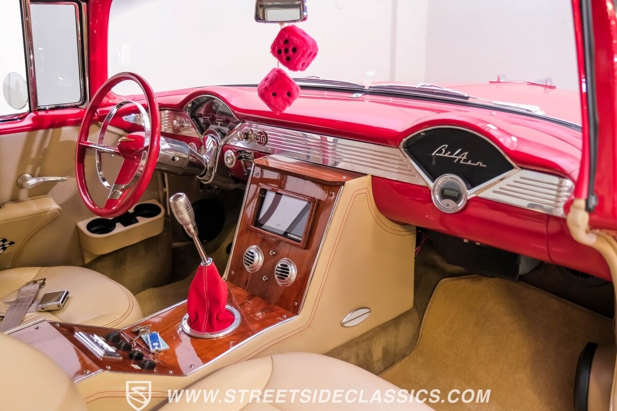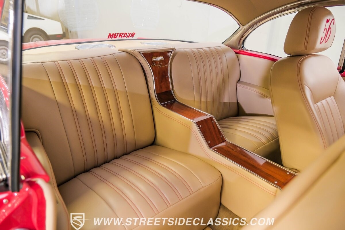 This car strikes a balance between an iconic classic and an all-out modern hot rod. The Fire Engine Red is close to the other colors available from Chevy in '56, and so it doesn't look out of place on this one. But there's a deep gloss and shine that instantly announces this is a modern and professional application. In fact, the full build only has about 1880 miles on it. And since brightwork is a big part of this icon, you can see that the full restoration made it a priority. The bumpers are mirror-like, the light bezels are intricate, and 1956's exclusive grille is proudly displayed. The '56 Bel Air had the unique style shared with no other Tri-Five where it rocketed up the side to make the car look sleeker and faster. So not only do we love that this trim looks excellent, but also that they took the time to get the body looking so good that it's like one unbroken piece through the door line. This inherent sleekness goes well with the upgraded performance appearance. Those large dual exhaust tips, fuel injection callouts, and 17-inch Billet Specialties wheels help add to the shine while also announcing it's something extra special.
