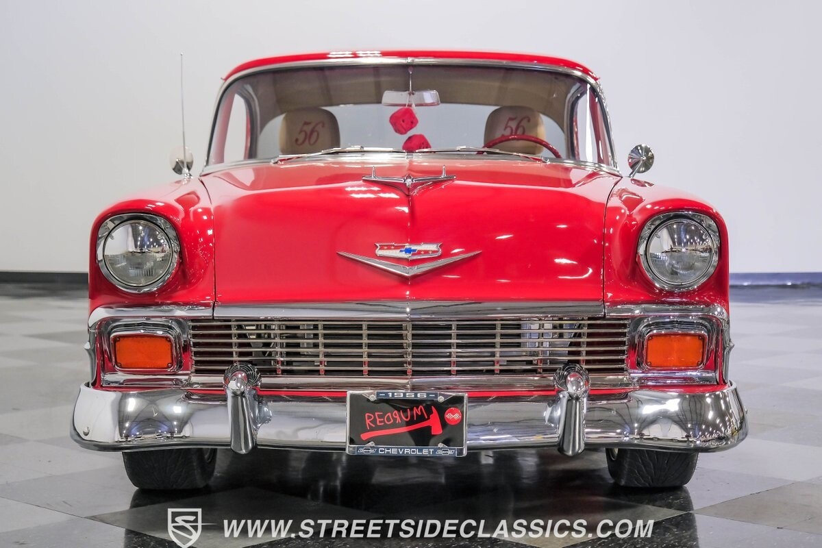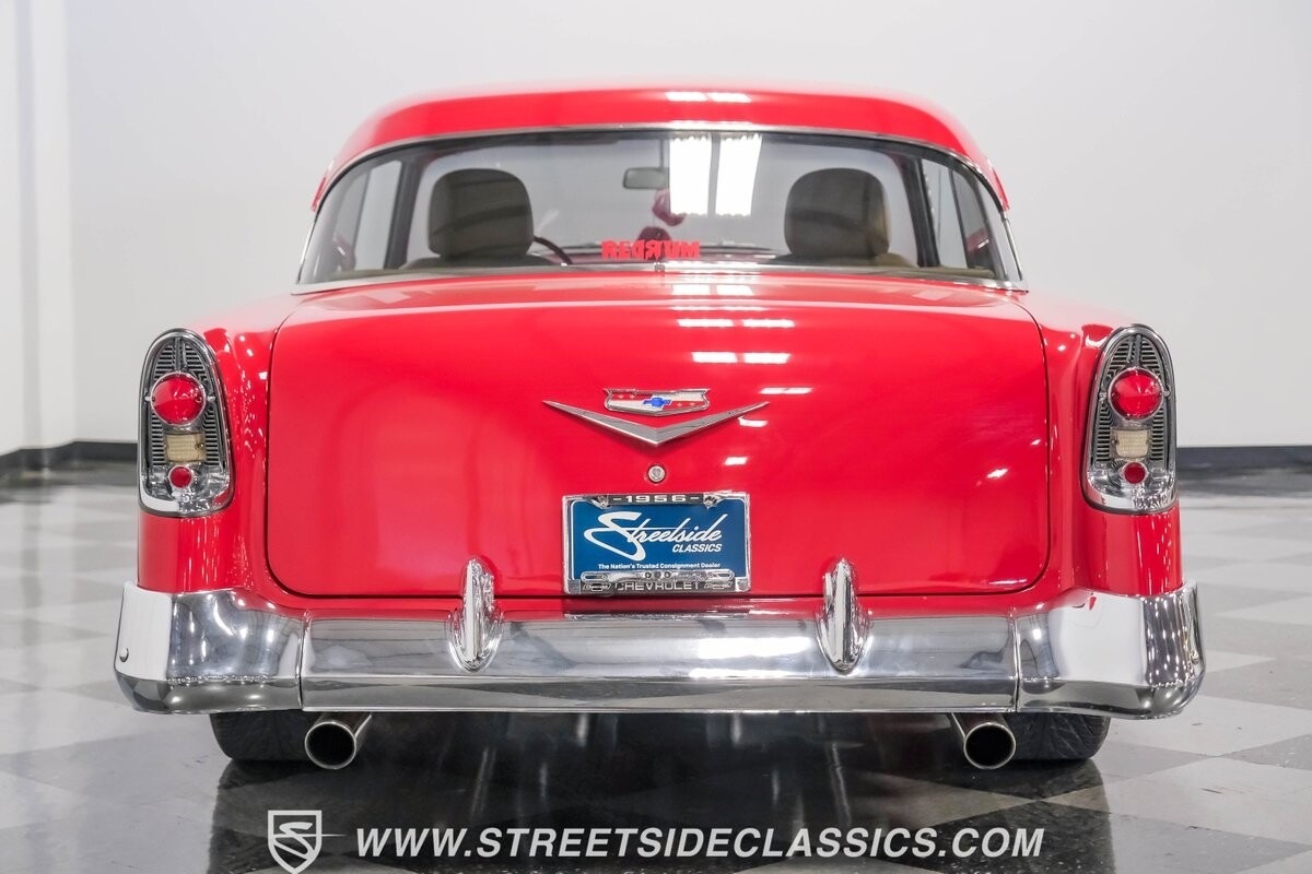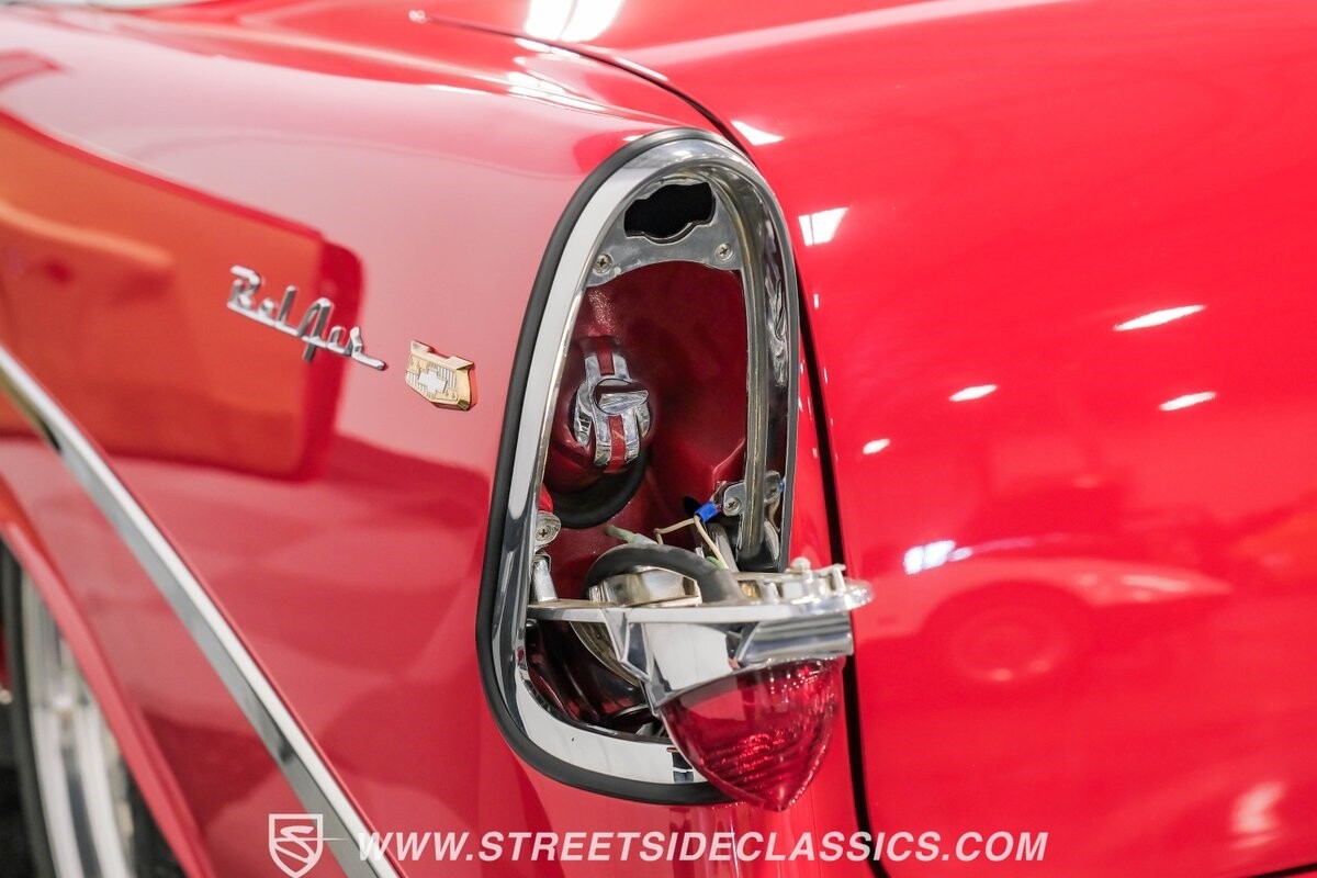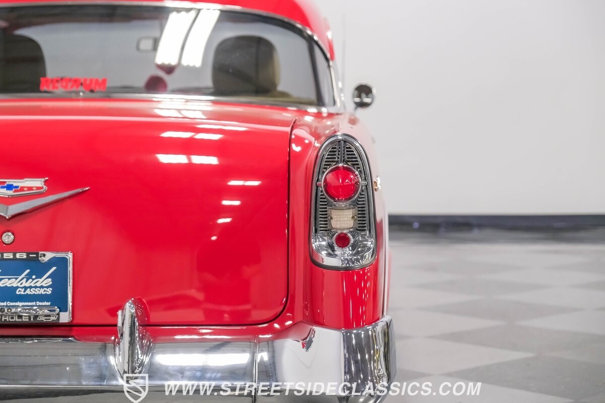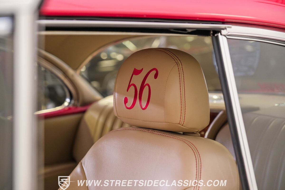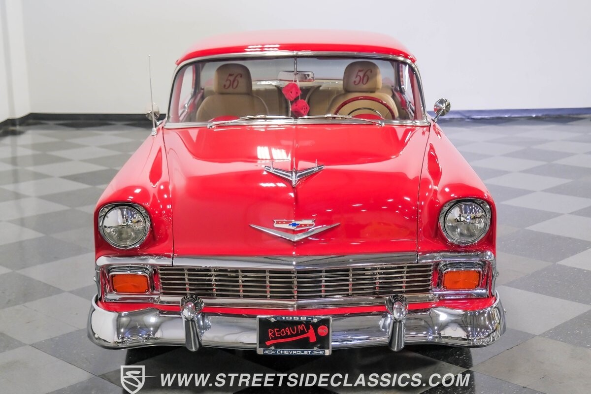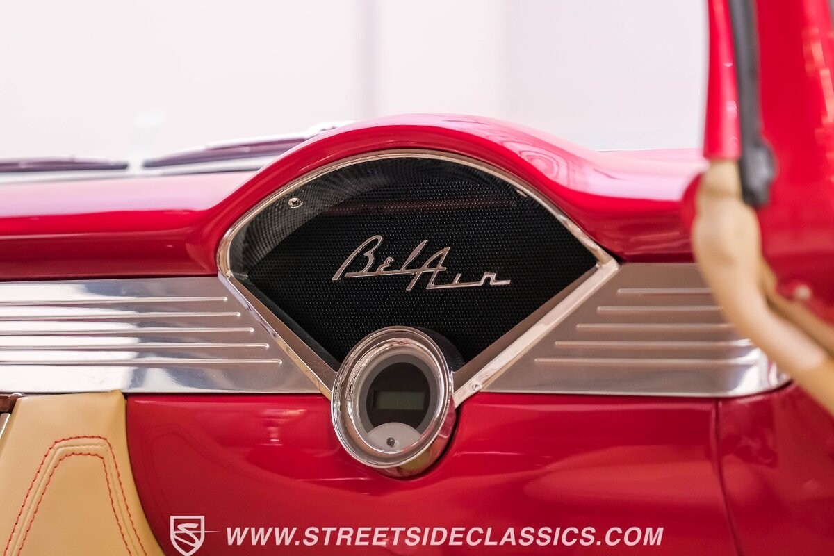 This car strikes a balance between an iconic classic and an all-out modern hot rod. The Fire Engine Red is close to the other colors available from Chevy in '56, and so it doesn't look out of place on this one. But there's a deep gloss and shine that instantly announces this is a modern and professional application. In fact, the full build only has about 1880 miles on it. And since brightwork is a big part of this icon, you can see that the full restoration made it a priority. The bumpers are mirror-like, the light bezels are intricate, and 1956's exclusive grille is proudly displayed. The '56 Bel Air had the unique style shared with no other Tri-Five where it rocketed up the side to make the car look sleeker and faster. So not only do we love that this trim looks excellent, but also that they took the time to get the body looking so good that it's like one unbroken piece through the door line. This inherent sleekness goes well with the upgraded performance appearance. Those large dual exhaust tips, fuel injection callouts, and 17-inch Billet Specialties wheels help add to the shine while also announcing it's something extra special.